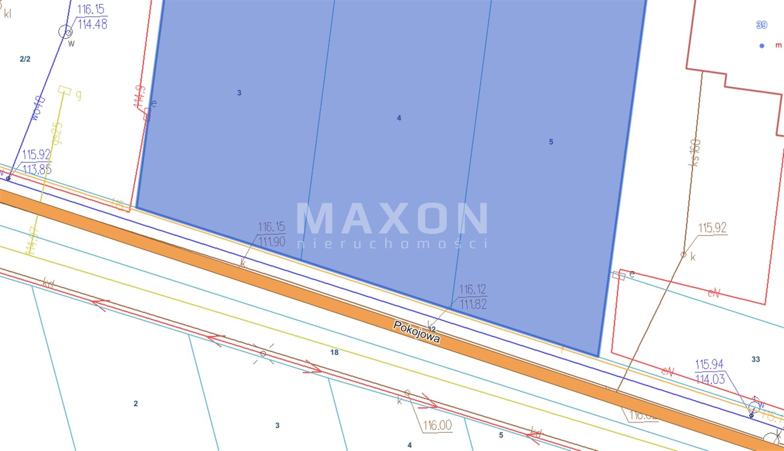 - Maksymalny wskaźnik intensywności zabudowy: 1,2 dla działki budowlanej,