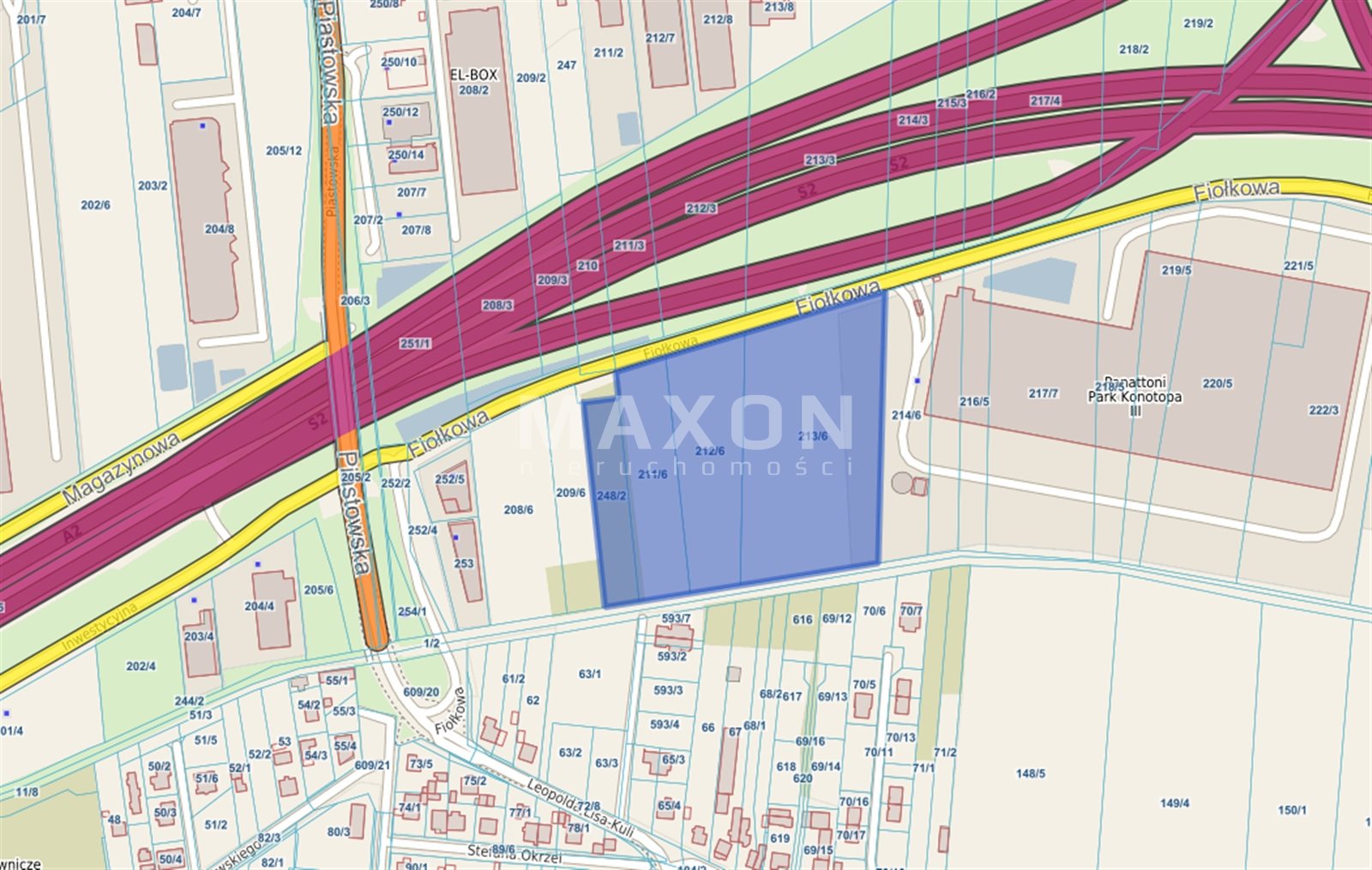 Grunt znajduje się w przemysłowej części miejscowości, przy ul. Fiołkowej, w bezpośrednim sąsiedztwie nowoczesnych hal magazynowych i produkcyjnych, w tym prestiżowego kompleksu Panattoni Park Konotopa III. W najbliższej okolicy funkcjonują liczne obiekty należące do znanych operatorów logistycznych oraz firm z branży FMCG i e-commerce, takich jak Raben, Neuca, DSV czy H&M.