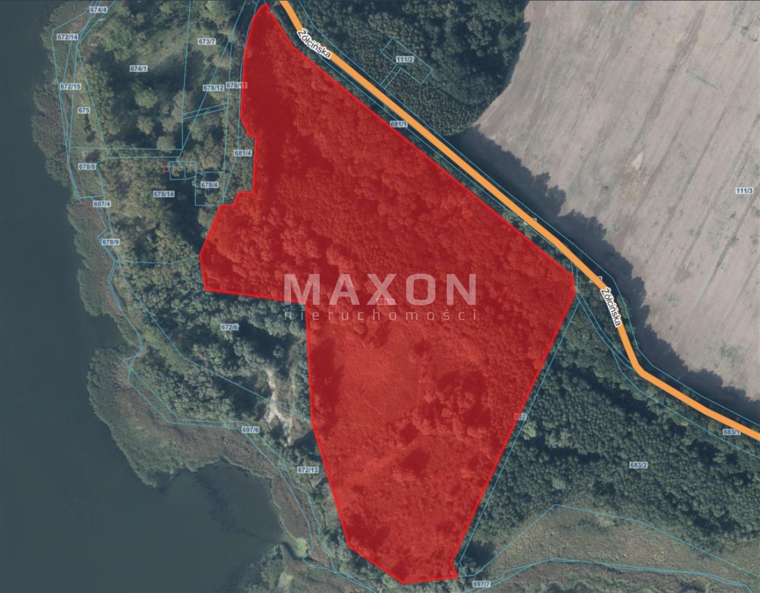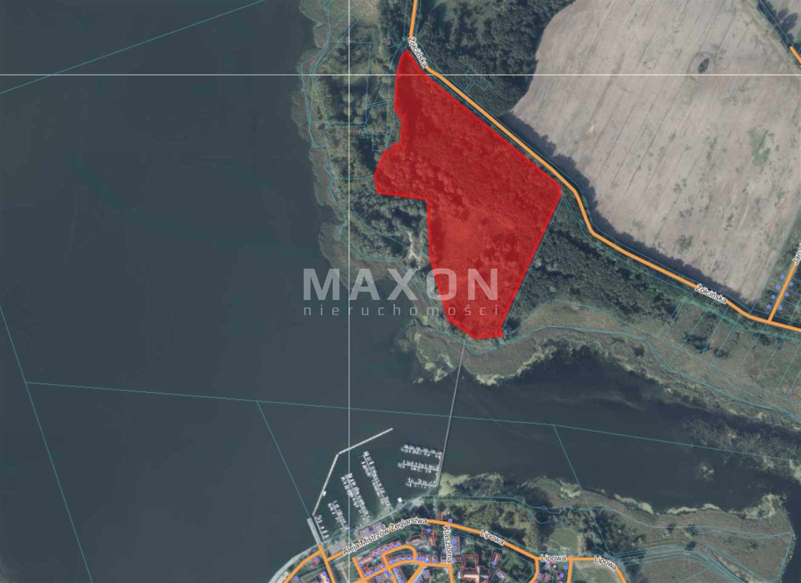 Szerokość w I linii brzegowej: 272 m.b. (istnieje możliwość zakupu drugiej działki i przedłużenia I linii brzegowej do 556 m.b. --> oferta 1338/GI/MAX.