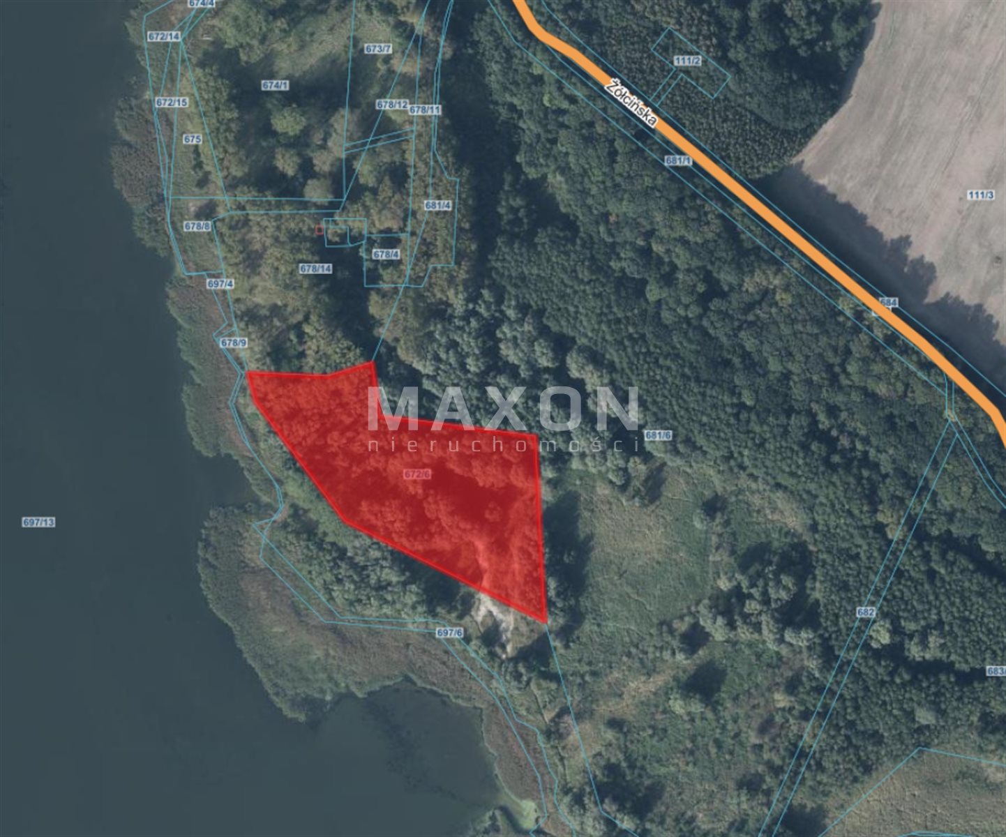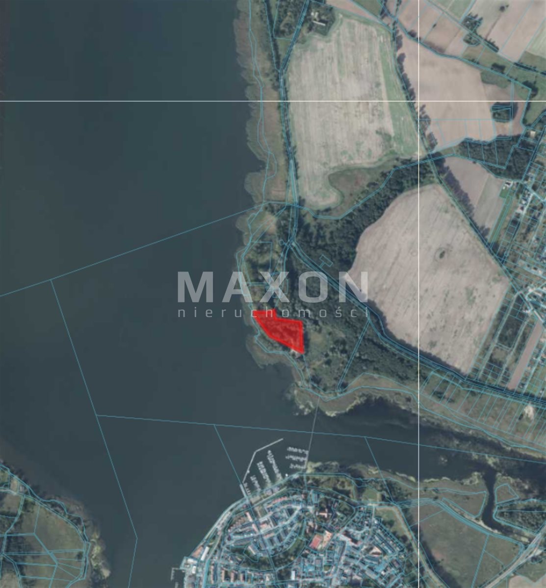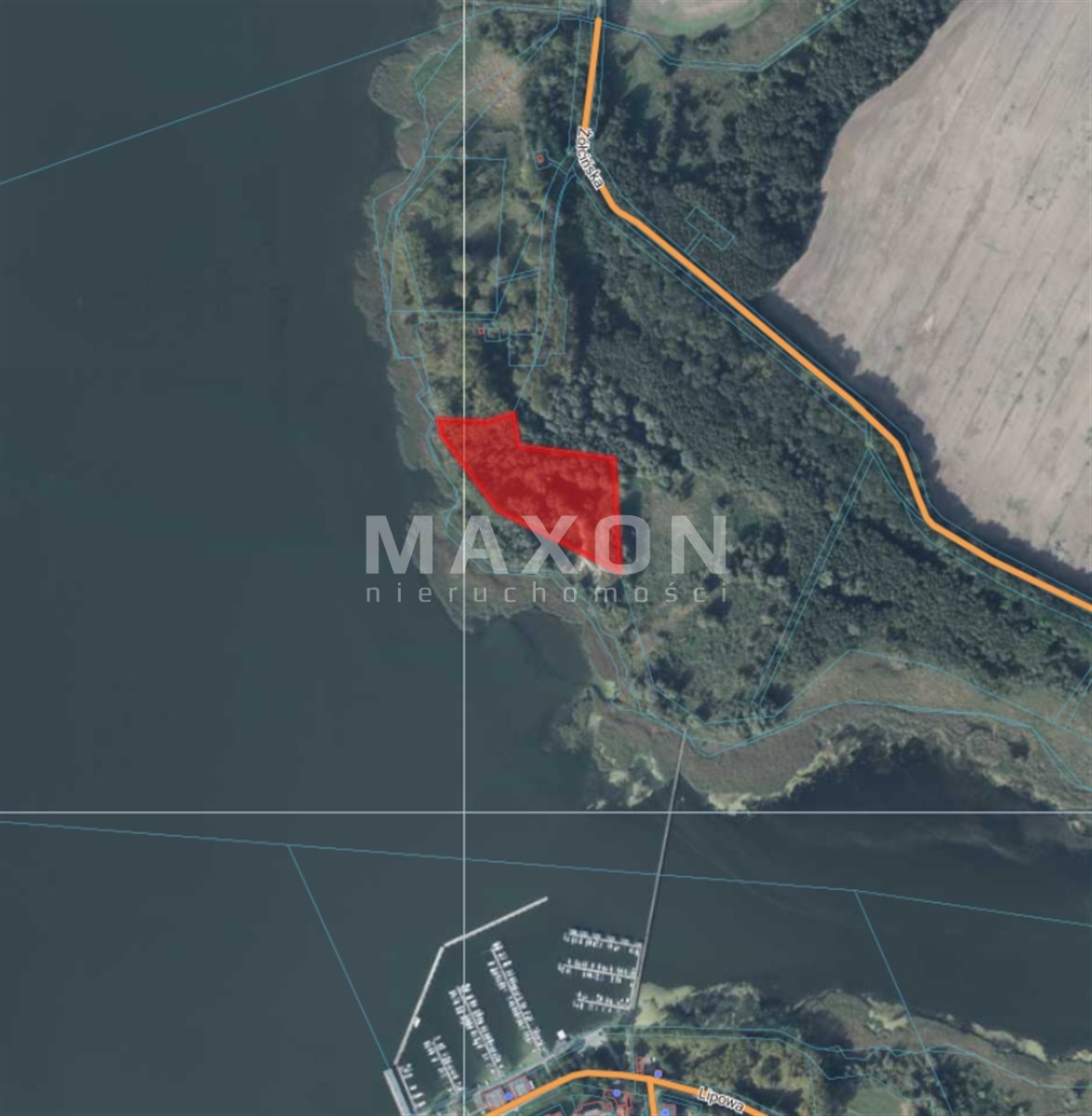 - Szerokość w I linii brzegowej: 287 m.b. (istnieje możliwość zakupu drugiej działki i przedłużenia I linii brzegowej do 556 m.b.,