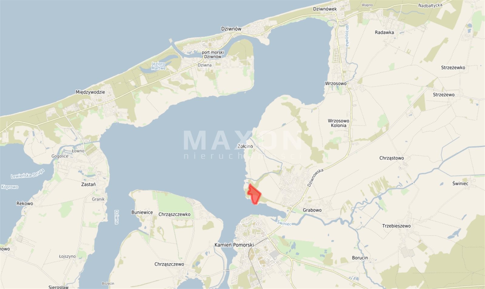 Nieruchomość posiada bezpośredni dostęp do Zalewu Kamieńskiego i znajduje się w pierwszej linii brzegowej, co czyni ją unikatową, prestiżową i niezwykle rzadko spotykaną ofertą inwestycyjną na rynku nieruchomości.