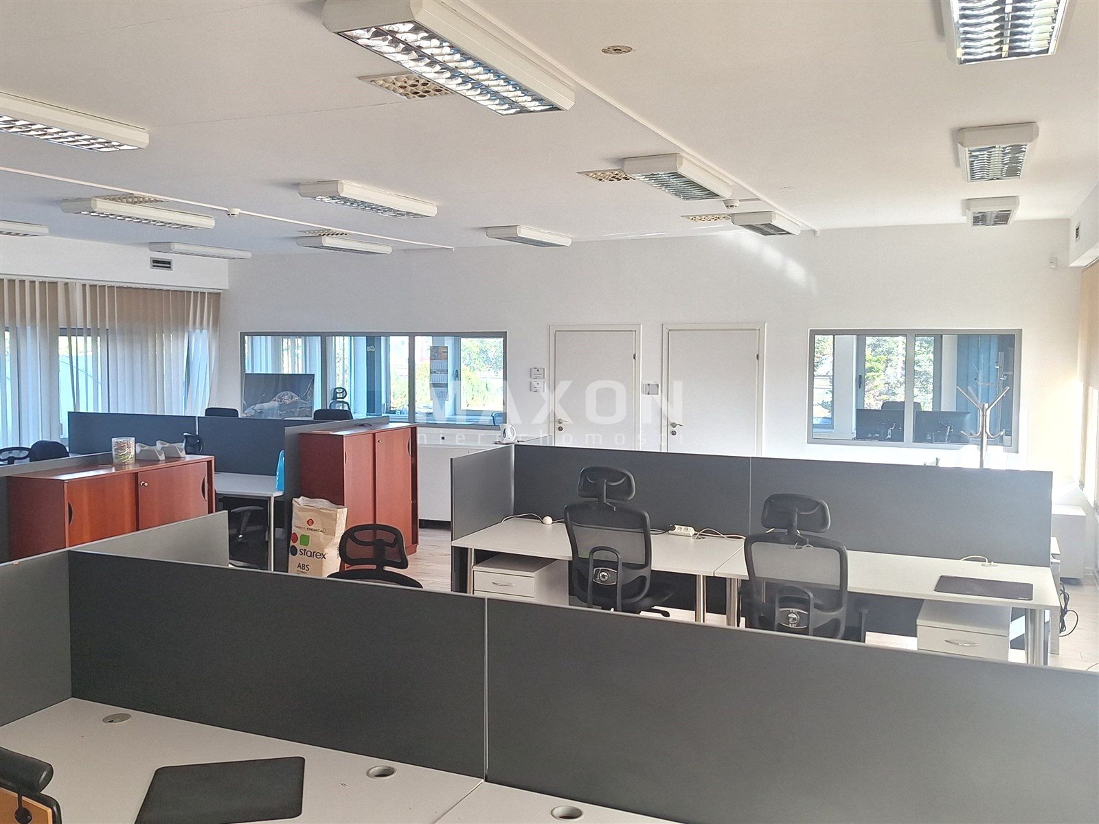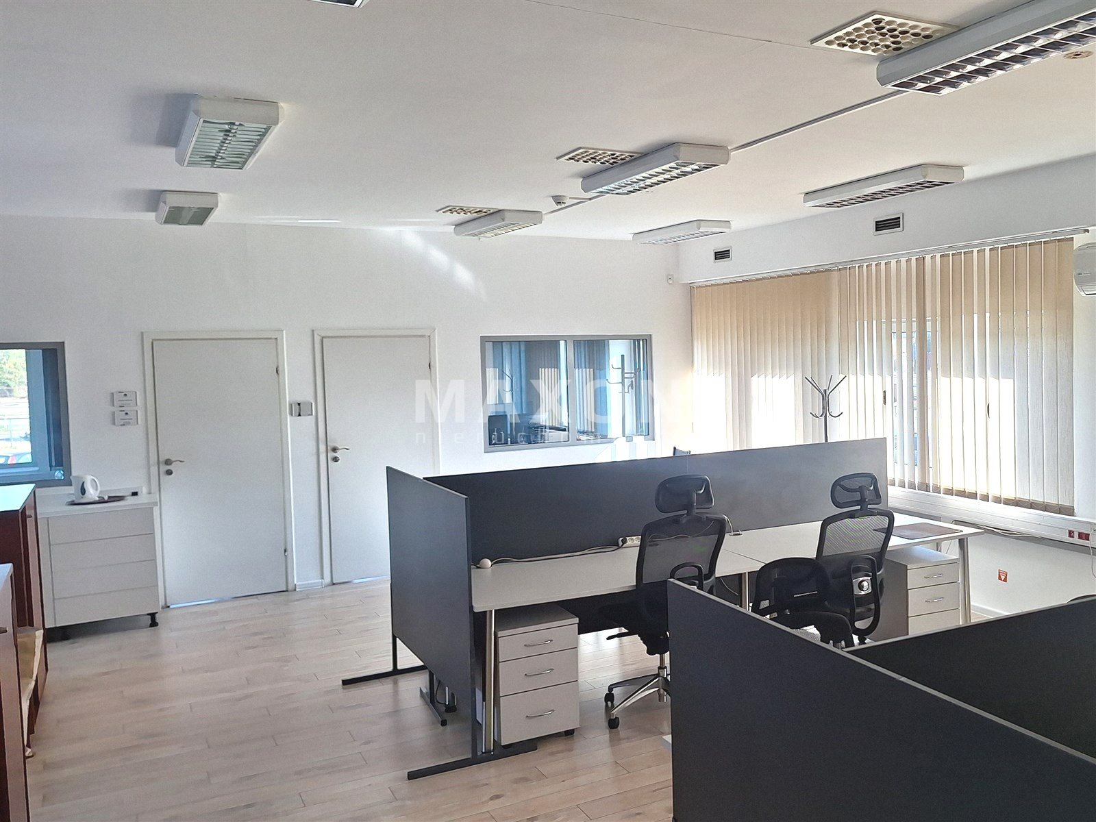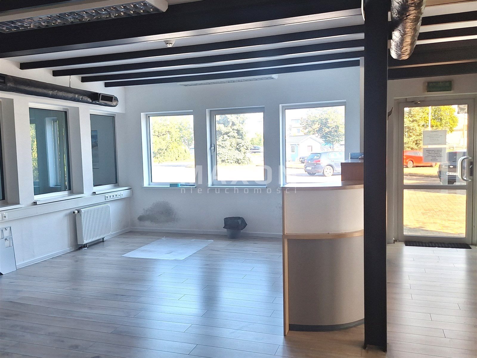 parter - 114m2 - open space o wielkości 91m2, podzielony na dwie części niewysokimi szafkami, osobny gabinet 9 m2.