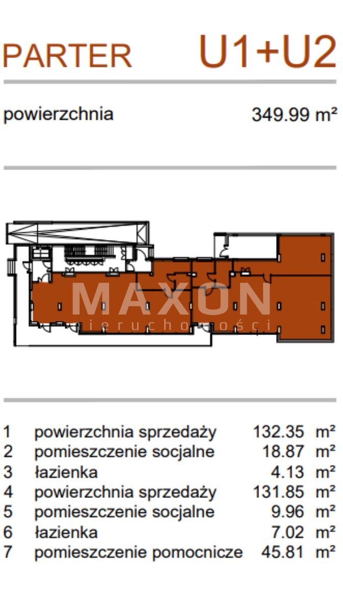 Powierzchnia lokalu to 349,99mkw powierzchni może być podzielony na dwa oddzielne lokale (194mkw i 155,35mkw). Posiada dwa oddzielne wejścia.