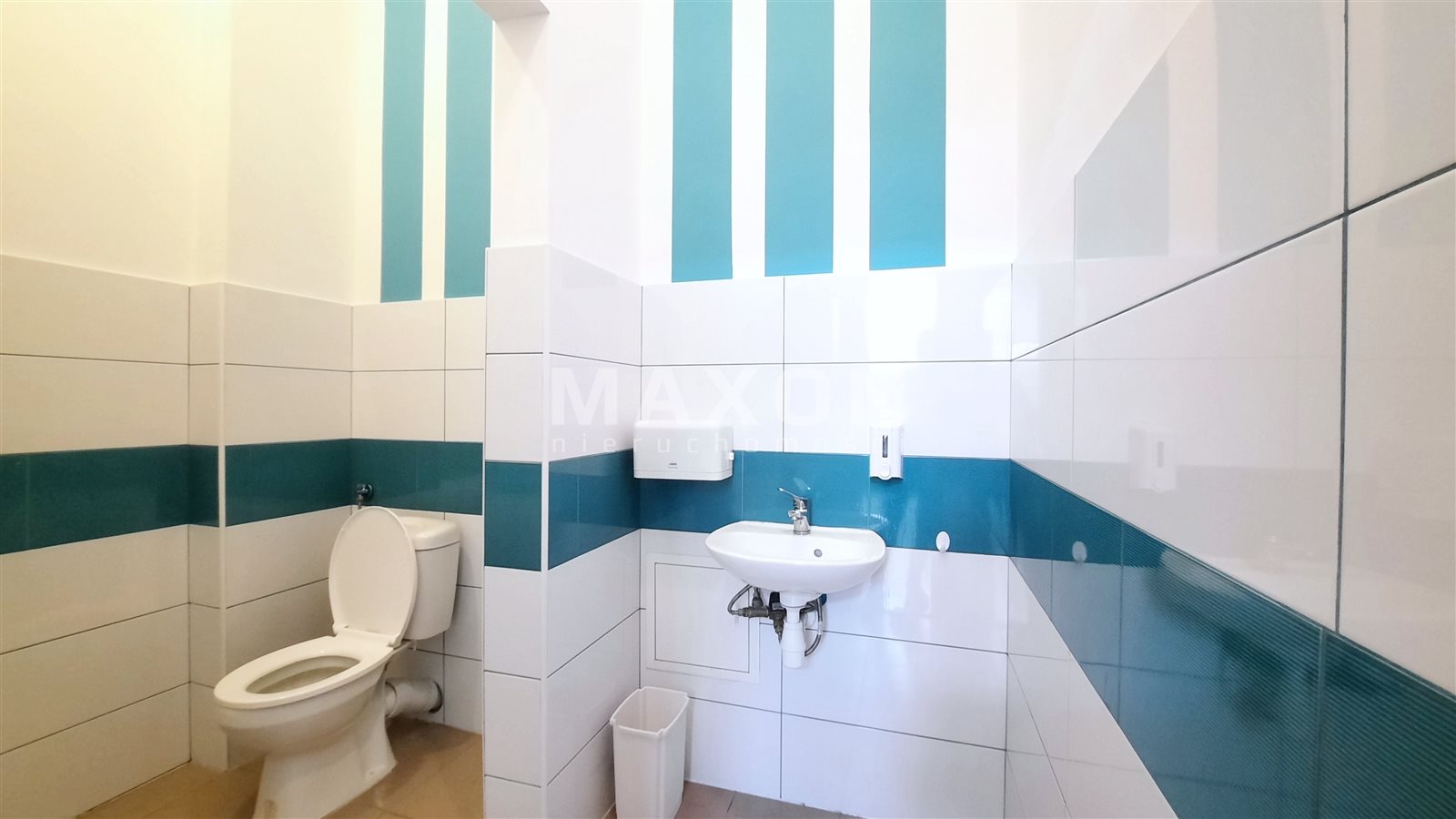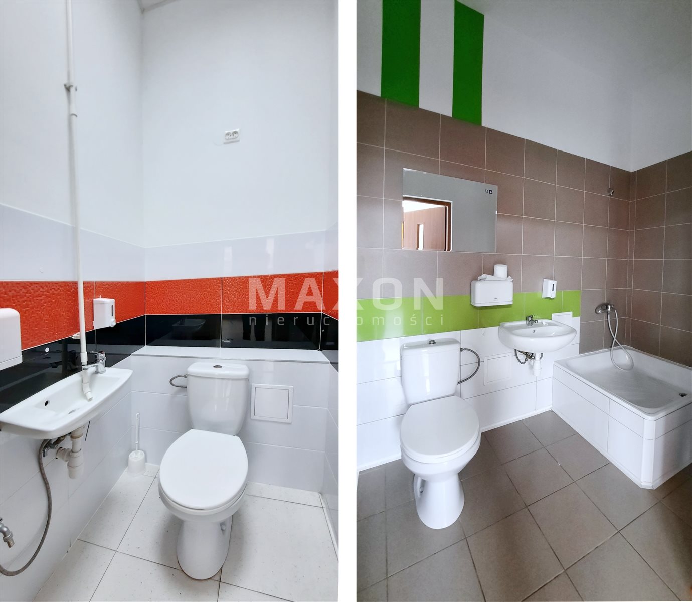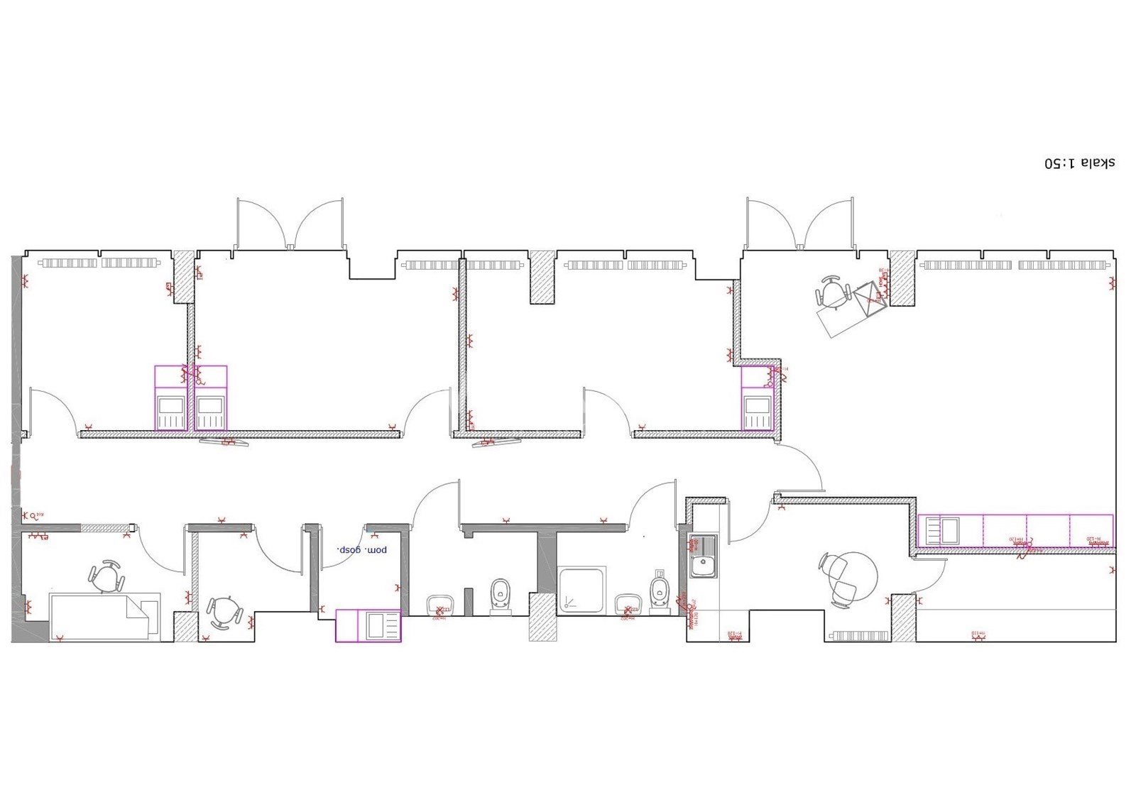 Obecnie lokal składa się z 4 widnych gabinetów z podłączeniem wody oraz przestronnego korytarza, 2 łazienek z WC oraz małych pomieszczeń gospodarczych.