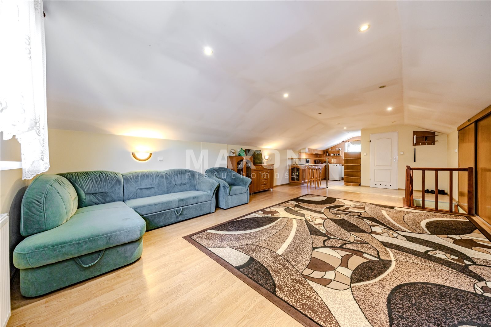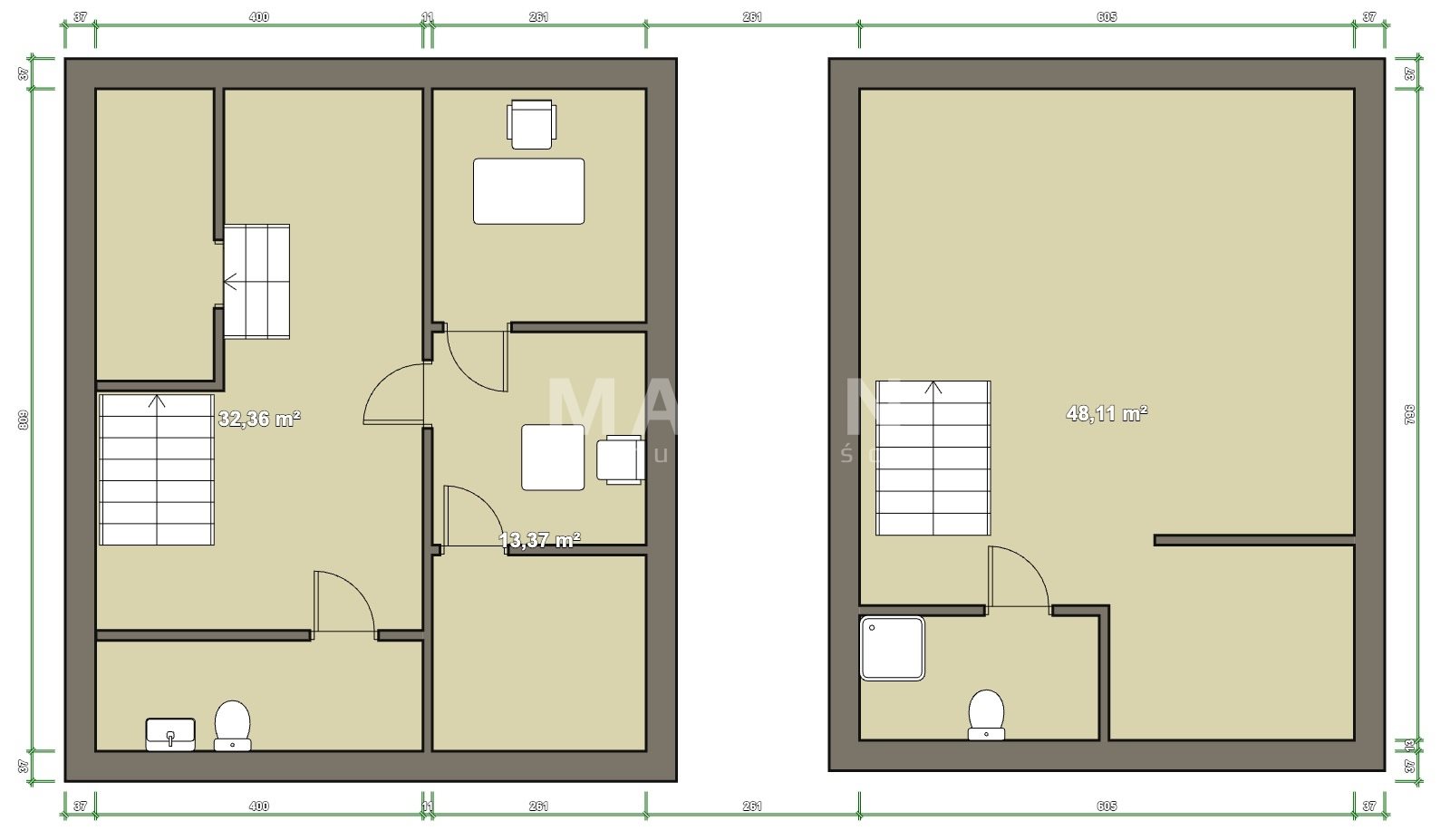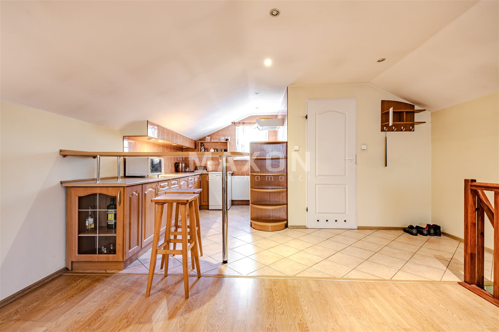 Mieszkanie na górze o powierzchni 58 mkw składa się z dwóch pokoi, aneksu kuchennego i łazienki.