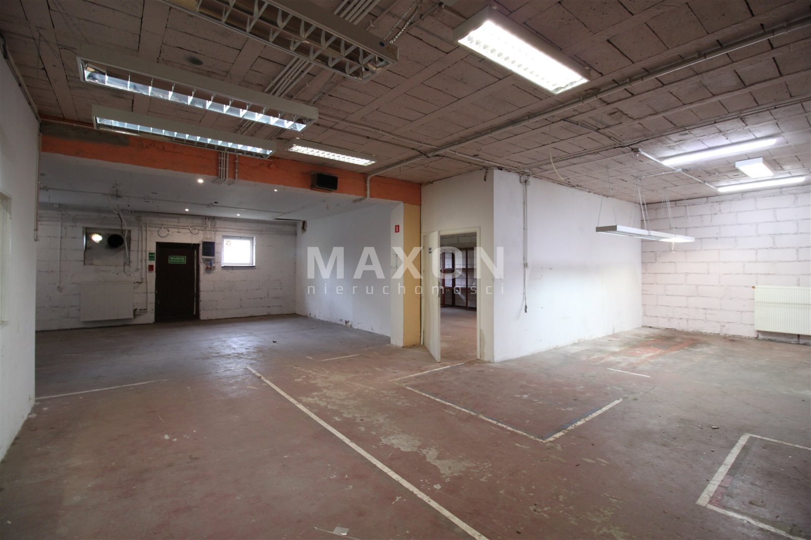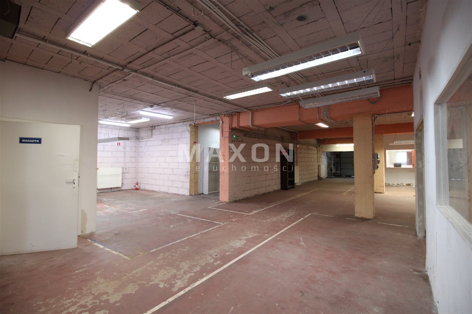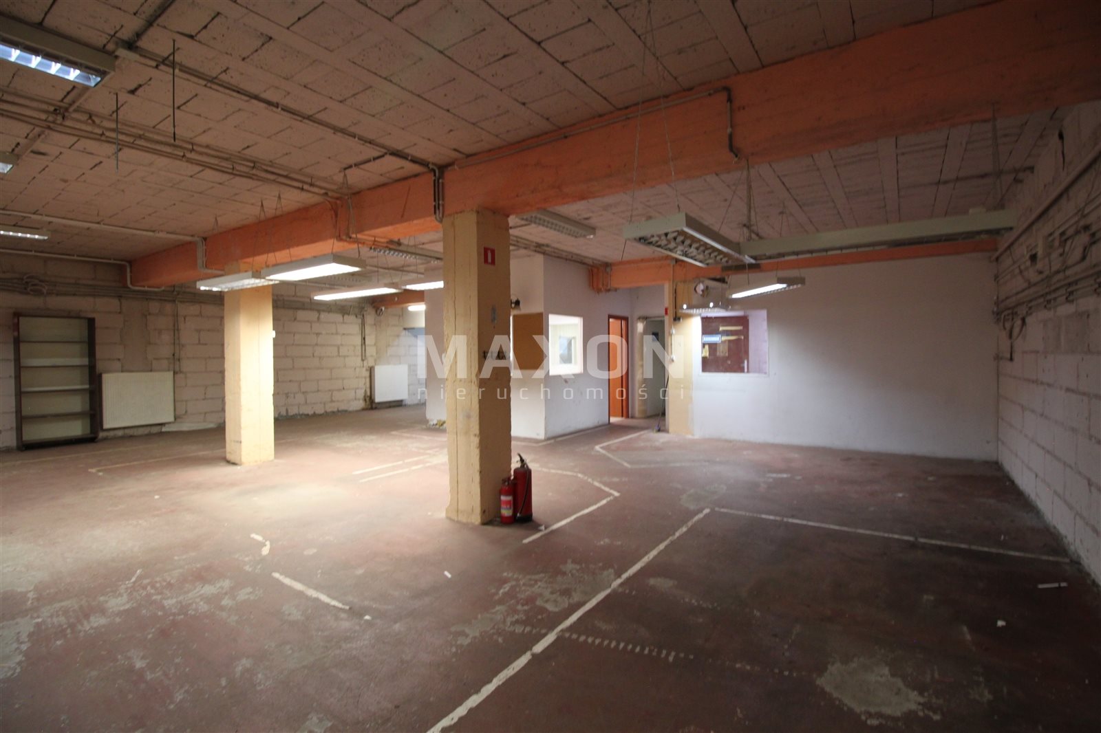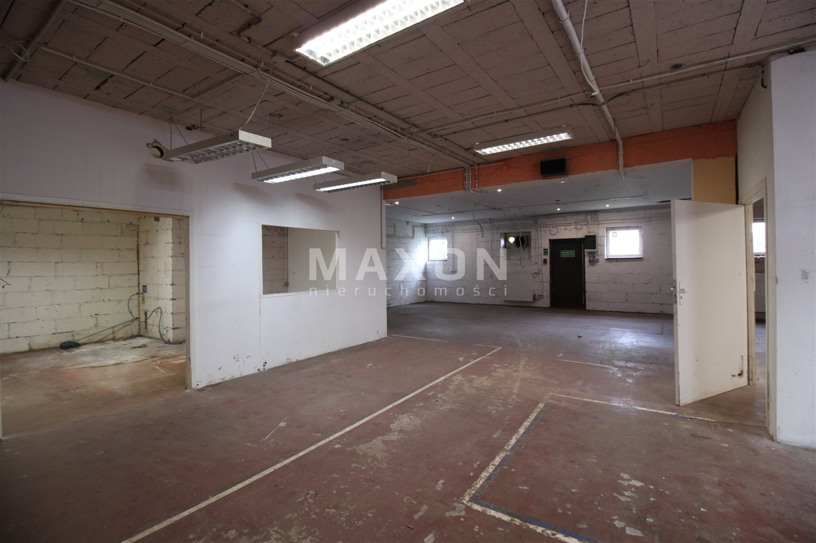 PARTER: główna powierzchnia magazynowo-ekspozycyjna z trzema mniejszymi pomieszczeniami oraz wydzielonym niewielkim biurem.