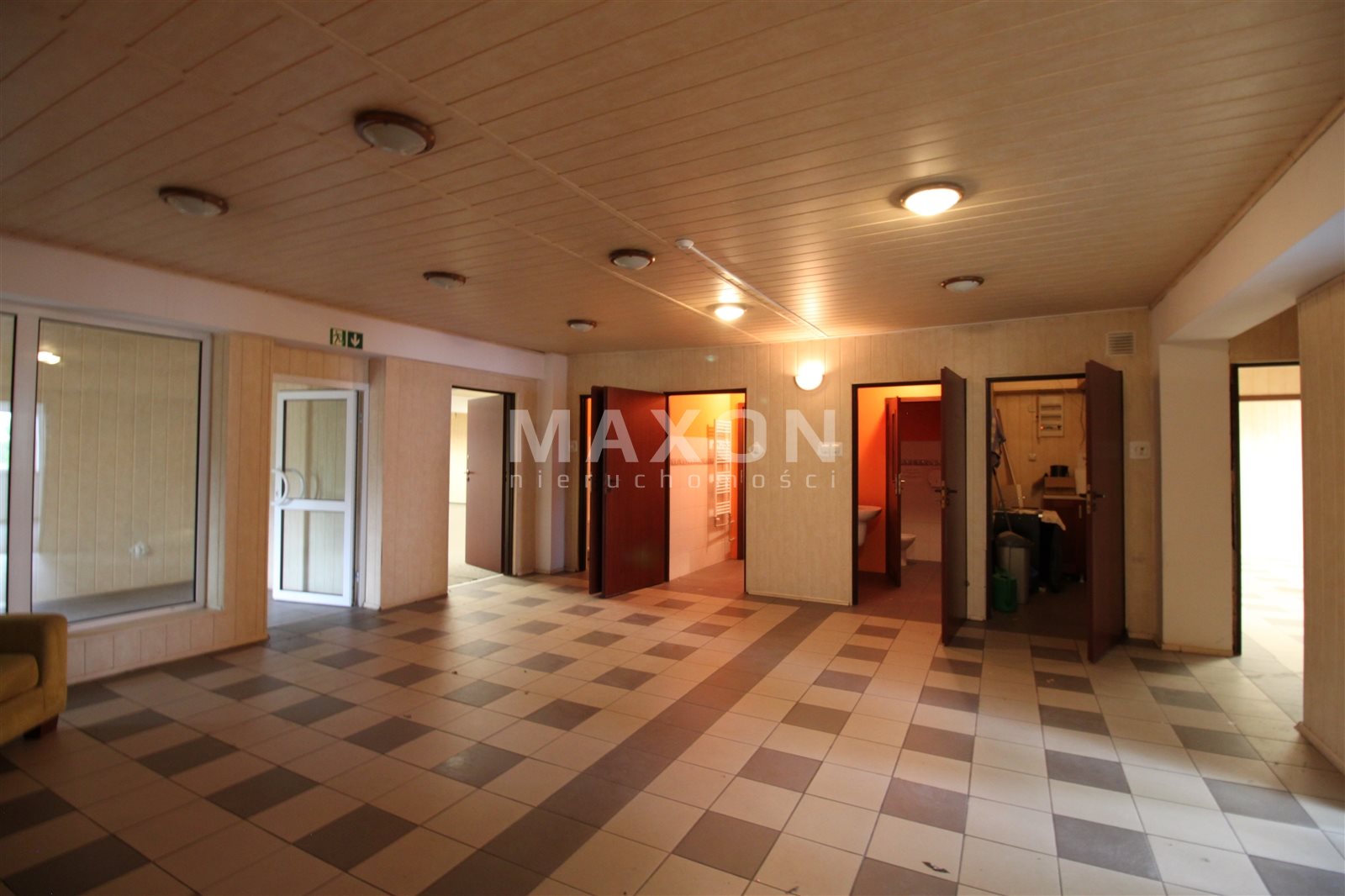 PIĘTRO: 6 pokoi, obszerny hall, open space, 2 łazienki, kuchnia, pomieszczenie gospodarcze. Dodatkowe, zewnętrzne wejście na piętro biurowe. Na podłogach terakota, w części pomieszczeń przykryta wykładziną.