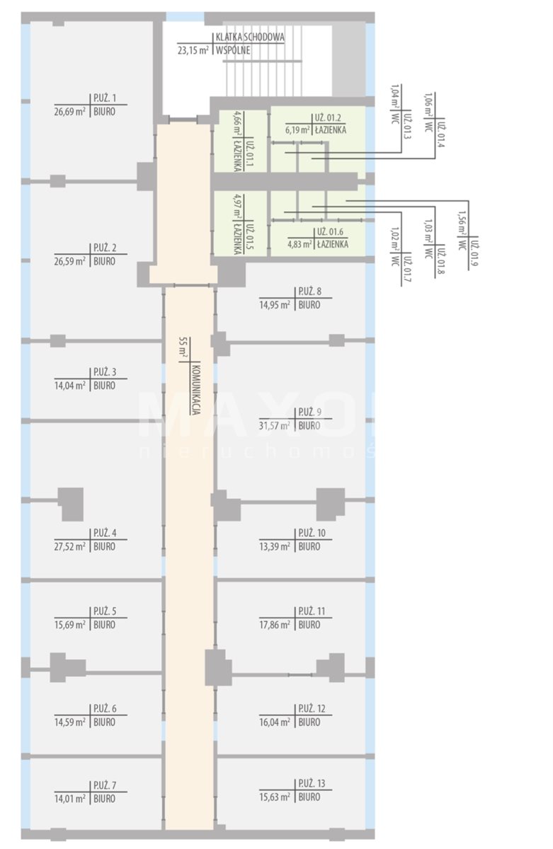 13 gabinetów, w tym 2 bardzo duże. Wszystkie pomieszczenia mają niezależne wejścia z korytarza.