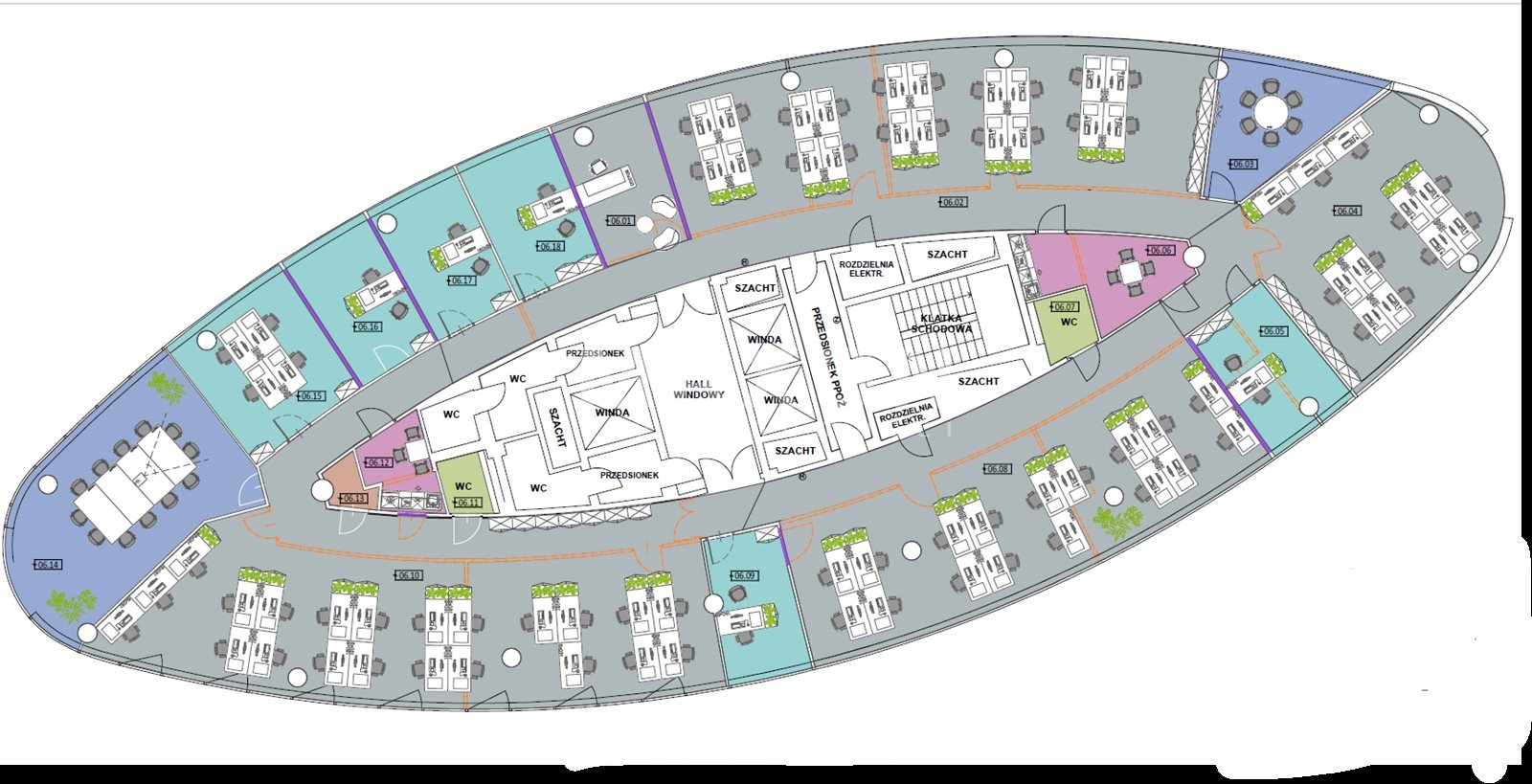 Powierzchnia podzielona jest na gabinety, sale konferencyjne i zaplecze socjalne.