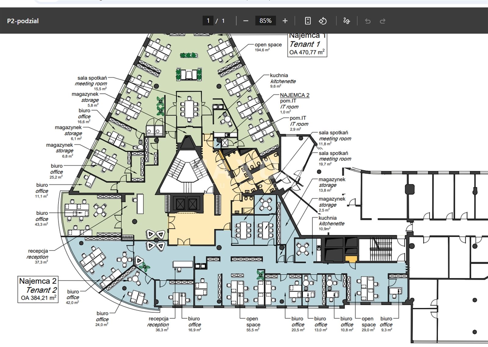 Biuro w układzie gabinetowym (plan w załączeniu-powierzchnia zaznaczona na kolor niebieski) wykończone w wysokim standardzie. Poprzednim najemca był Zarząd Firmy.