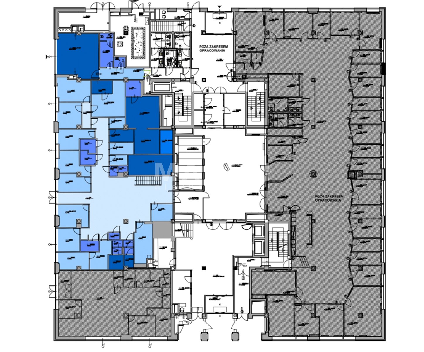 Oferowana przestrzeń (zaznaczona na niebiesko na rzucie) idealnie wpisują się wymogi placówek medycznych, rehabilitacyjnych lub gabinetów estetycznych, dla obsługi pacjentów.