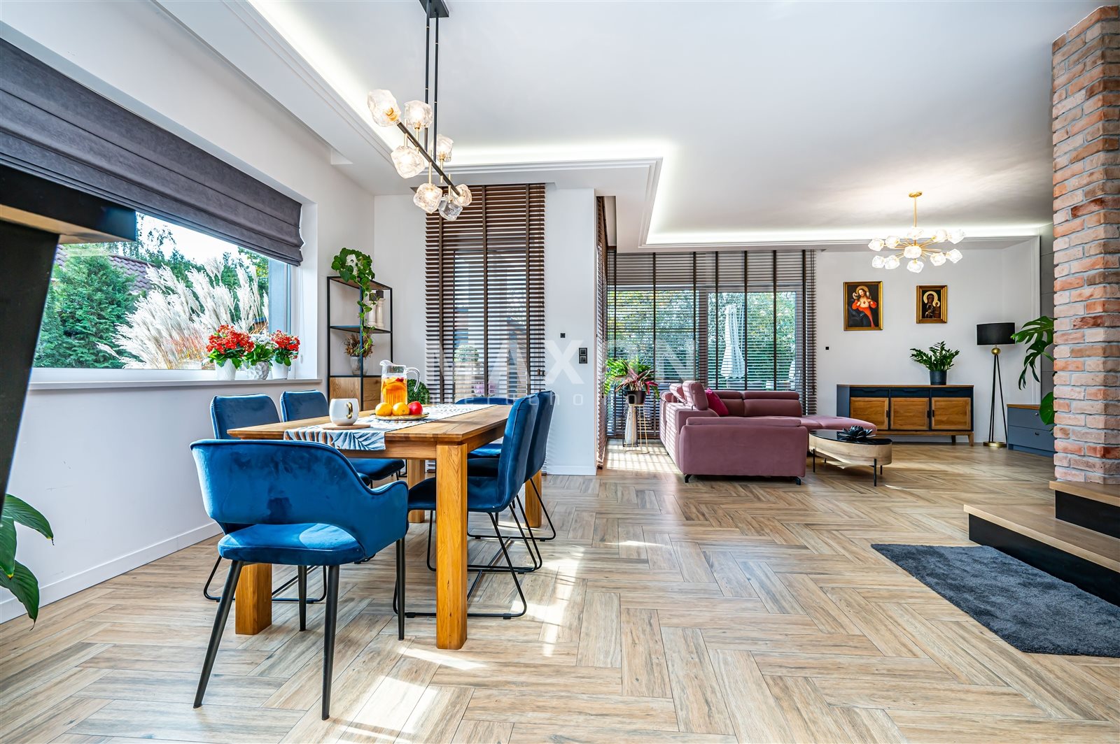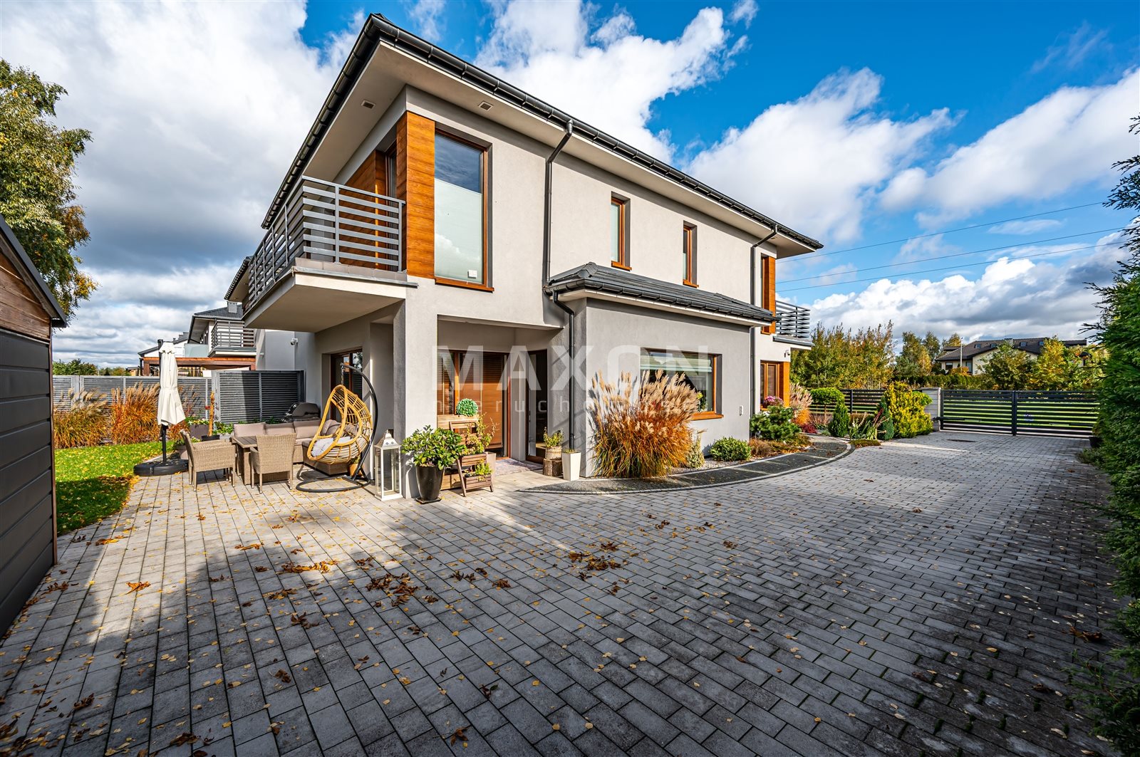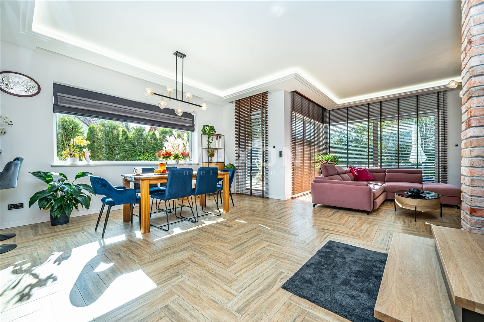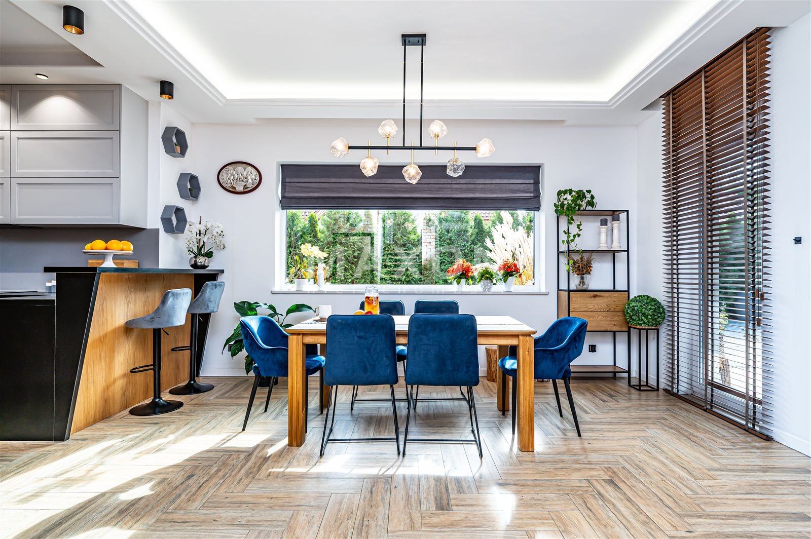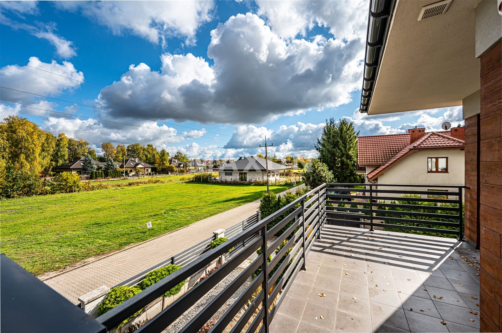 Dom wykończony jest w wysokim standardzie – posiada okna trzyszybowe, ogrzewanie podłogowe, klimatyzację, centralny odkurzacz, zabudowaną kuchnię z AGD oraz drzwi antywłamaniowe. Dach pokryty blachodachówką, ocieplony, z klimatyzacją, system podlewania automatycznego w ogrodzie.