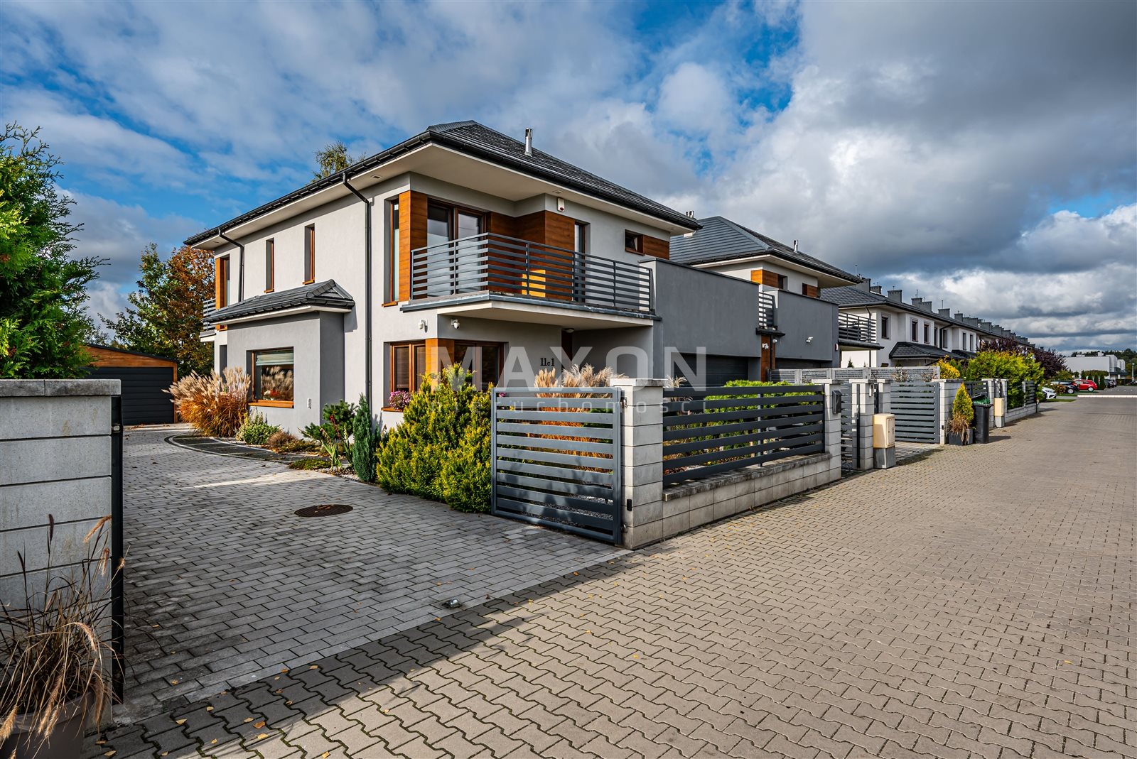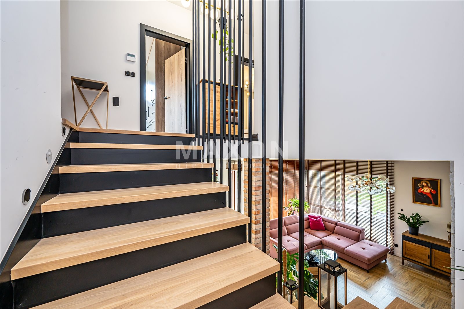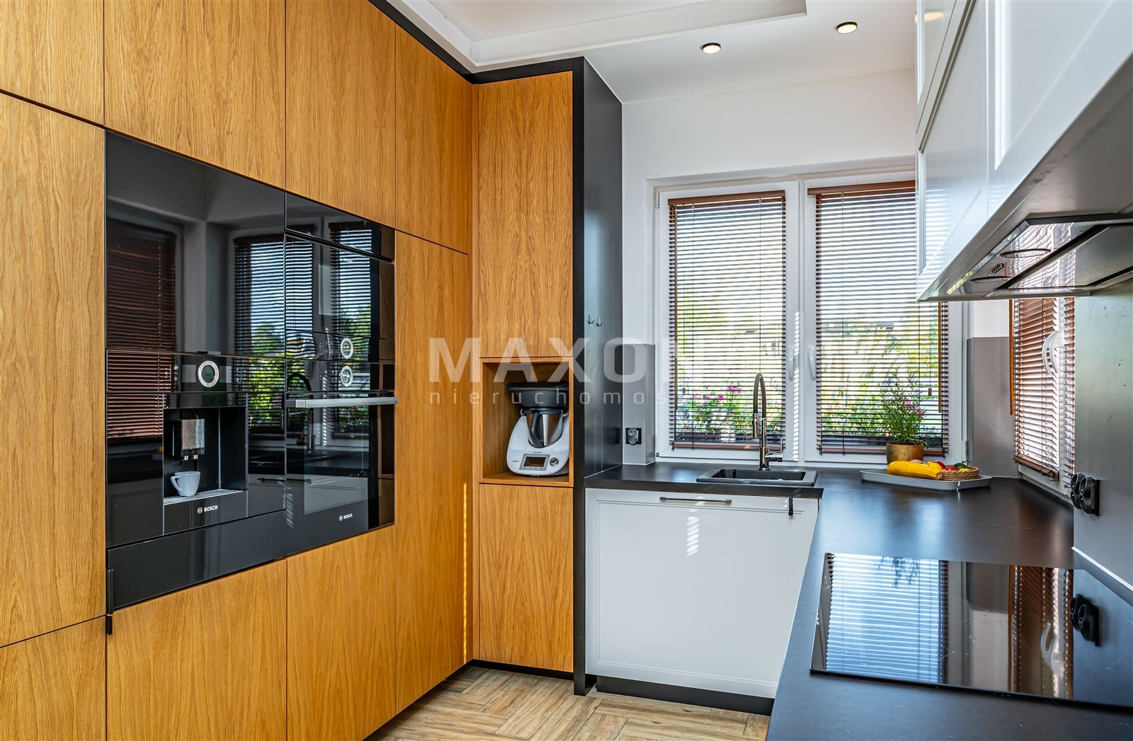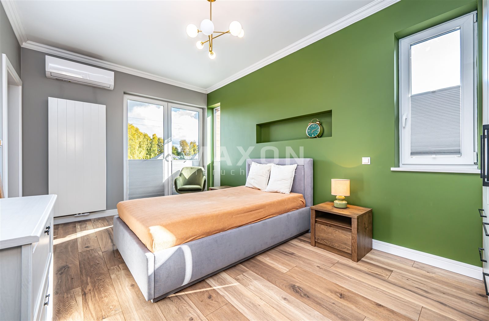 Dom wykończony jest w wysokim standardzie – posiada okna trzyszybowe, ogrzewanie podłogowe, klimatyzację, centralny odkurzacz, zabudowaną kuchnię z AGD oraz drzwi antywłamaniowe. Dach pokryty blachodachówką, ocieplony, z klimatyzacją, system podlewania automatycznego w ogrodzie.