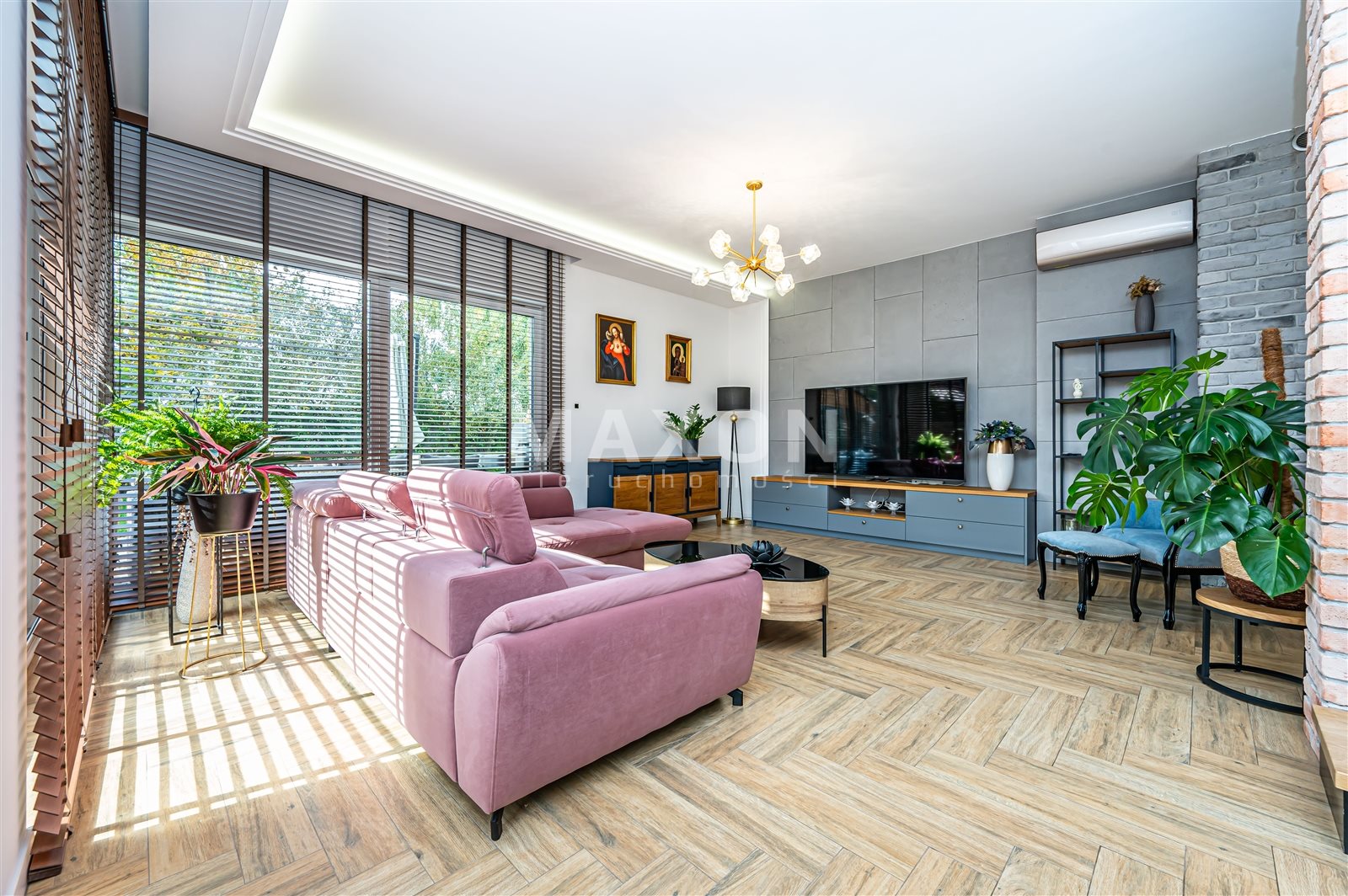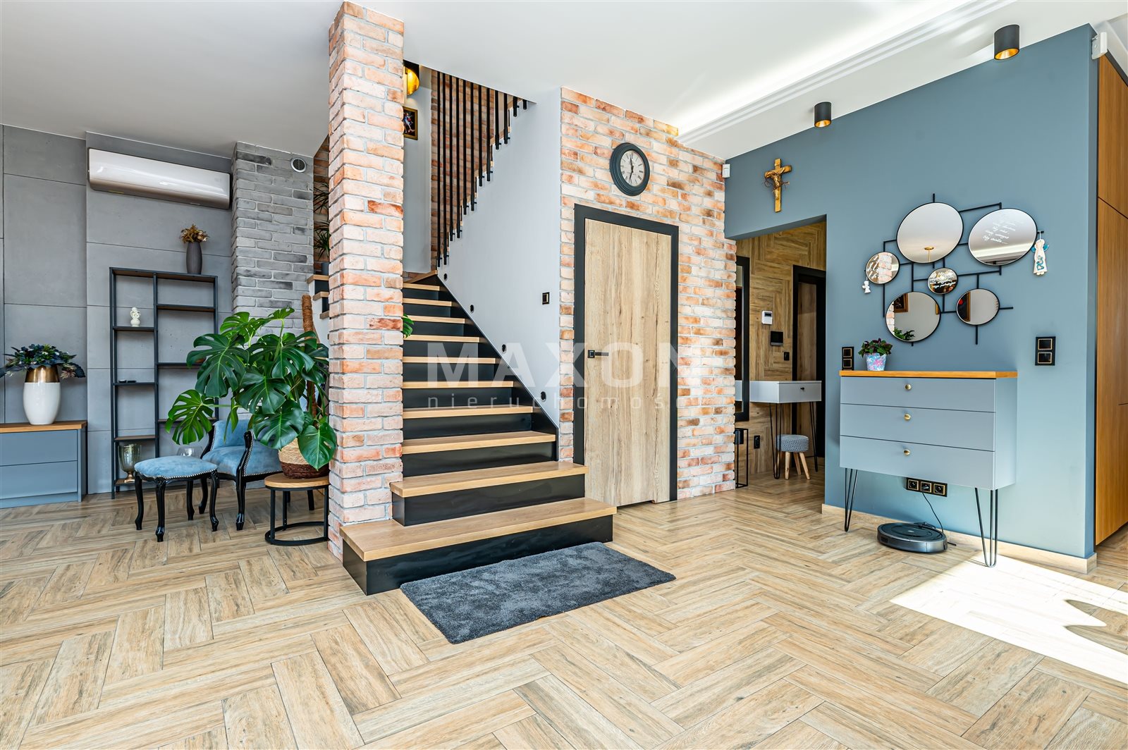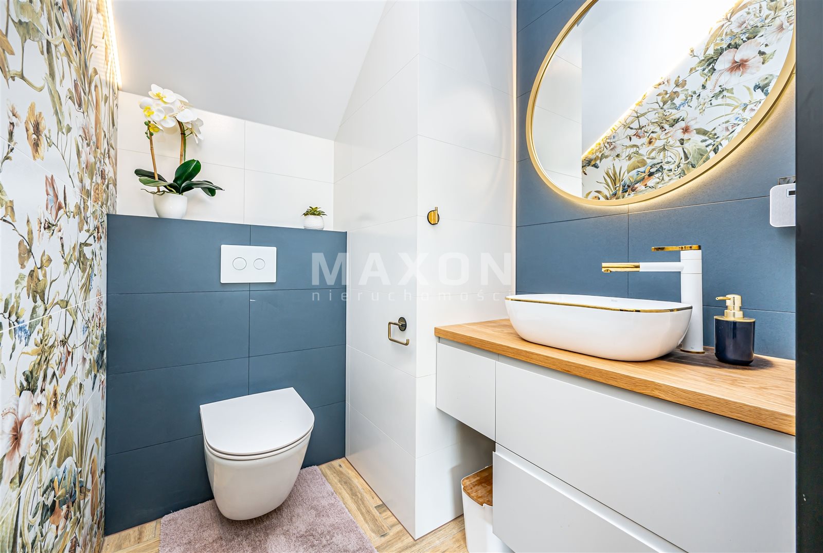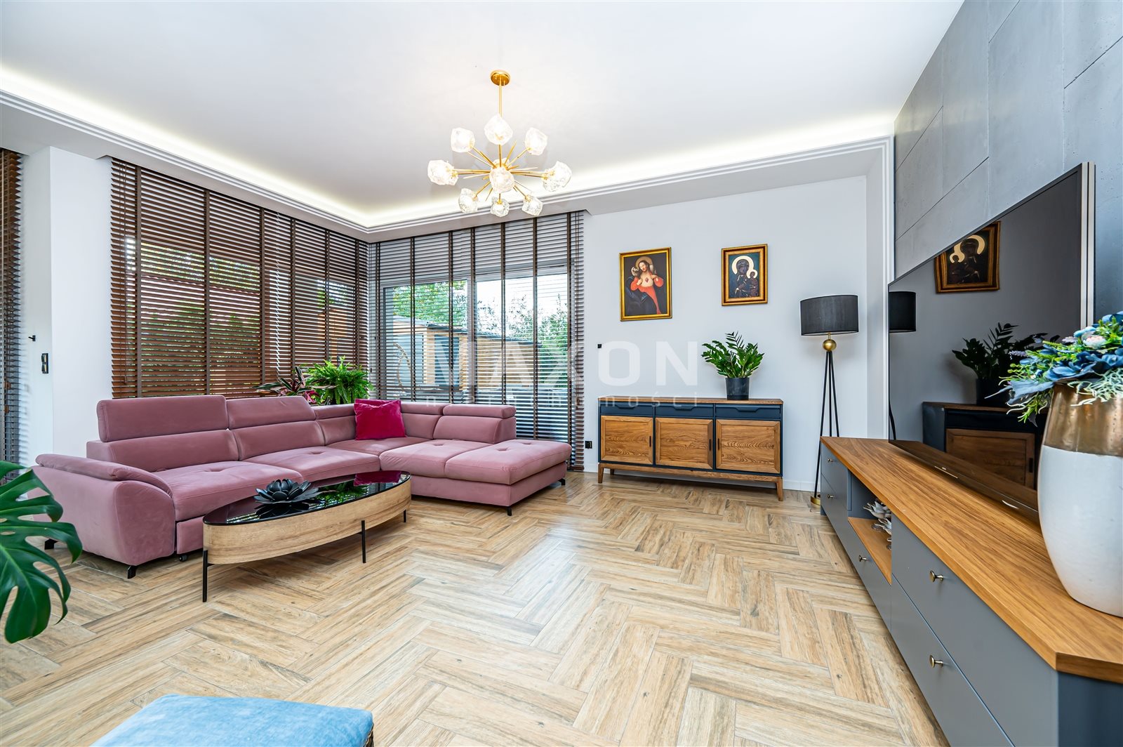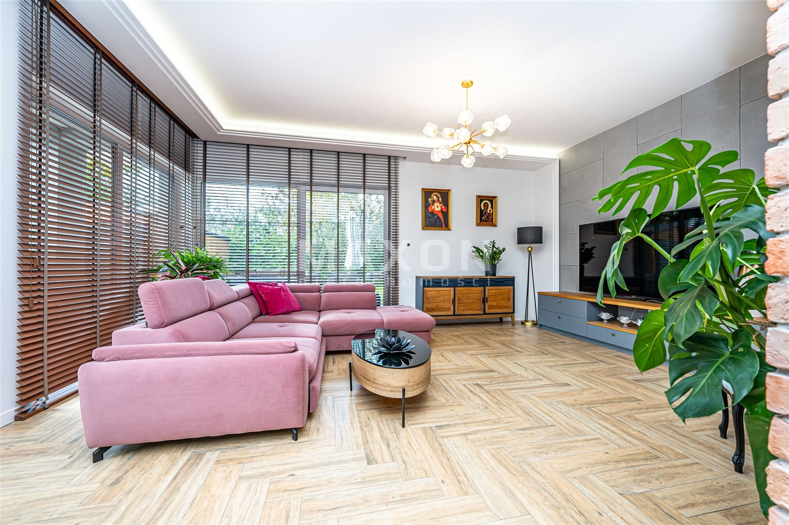 Dom wykończony jest w wysokim standardzie – posiada okna trzyszybowe, ogrzewanie podłogowe, klimatyzację, centralny odkurzacz, zabudowaną kuchnię z AGD oraz drzwi antywłamaniowe. Dach pokryty blachodachówką, ocieplony, z klimatyzacją, system podlewania automatycznego w ogrodzie.