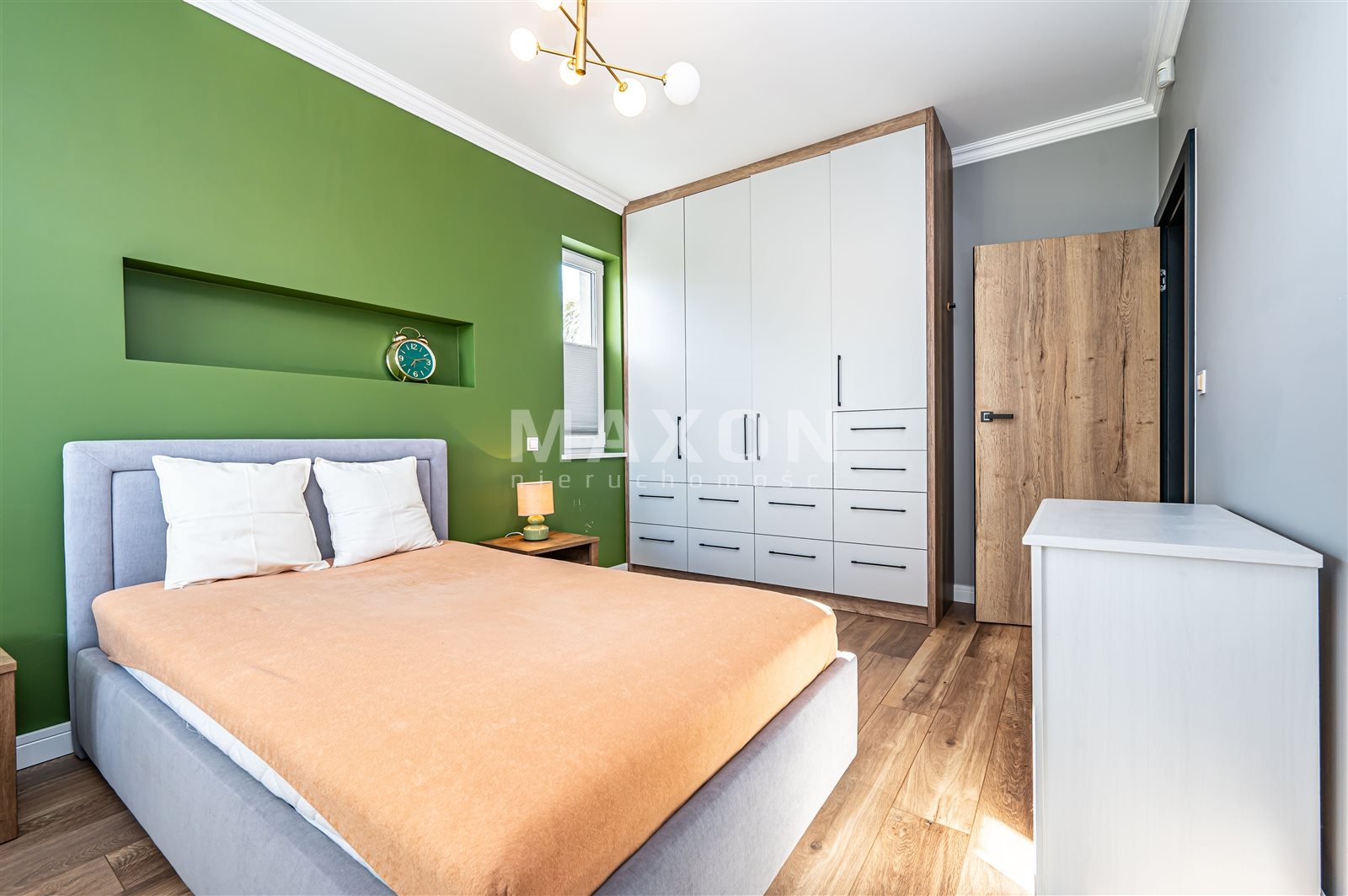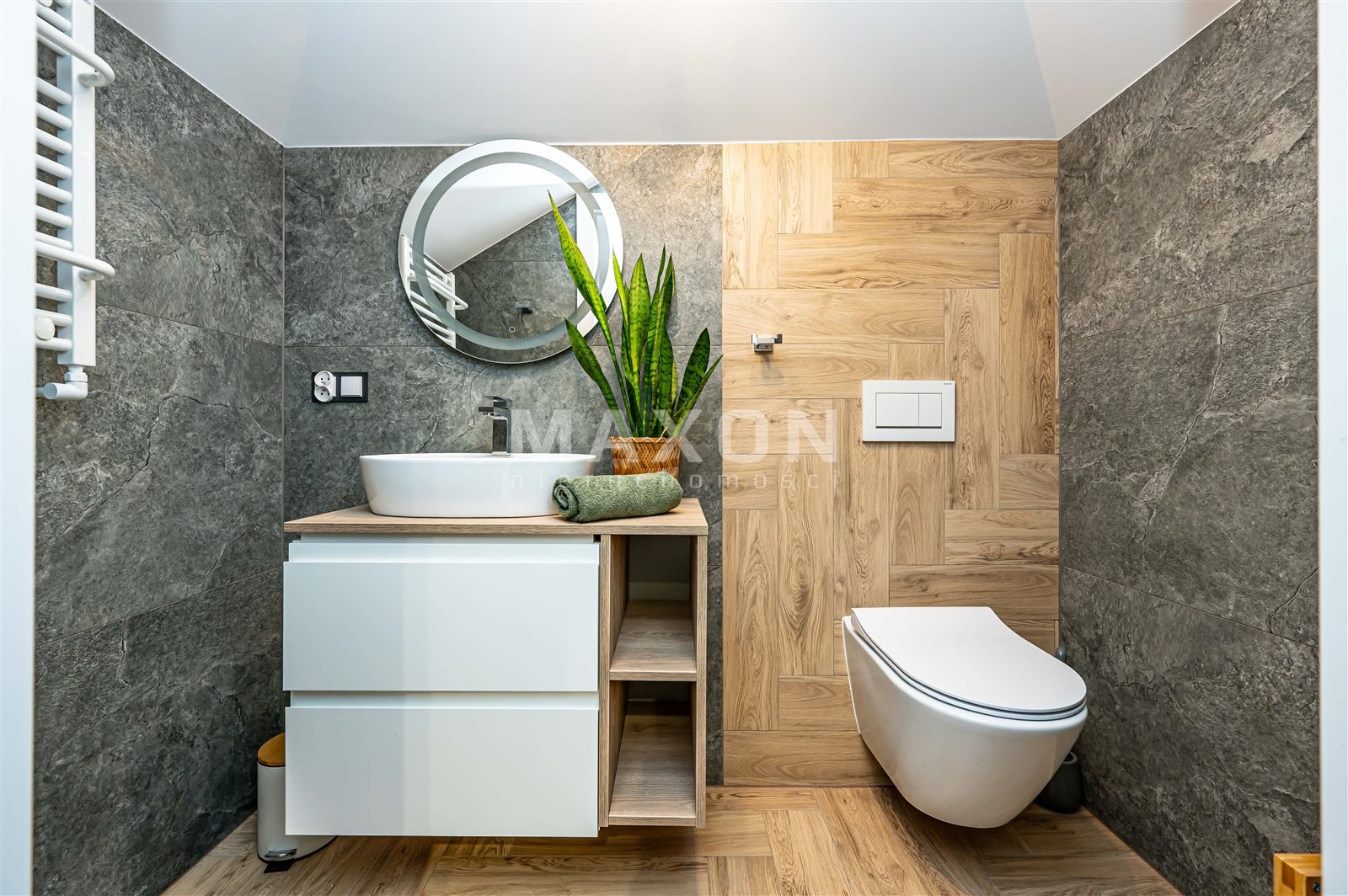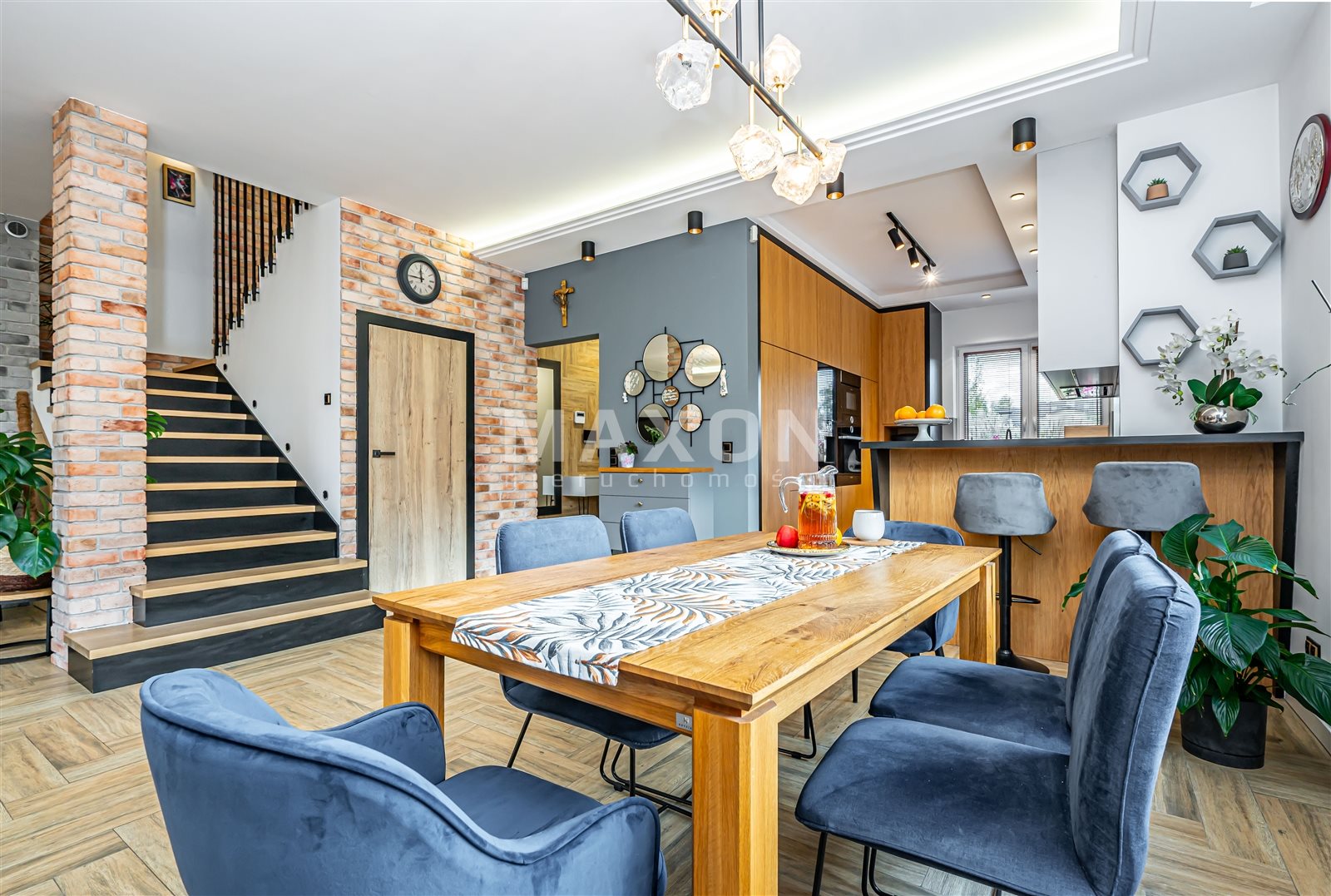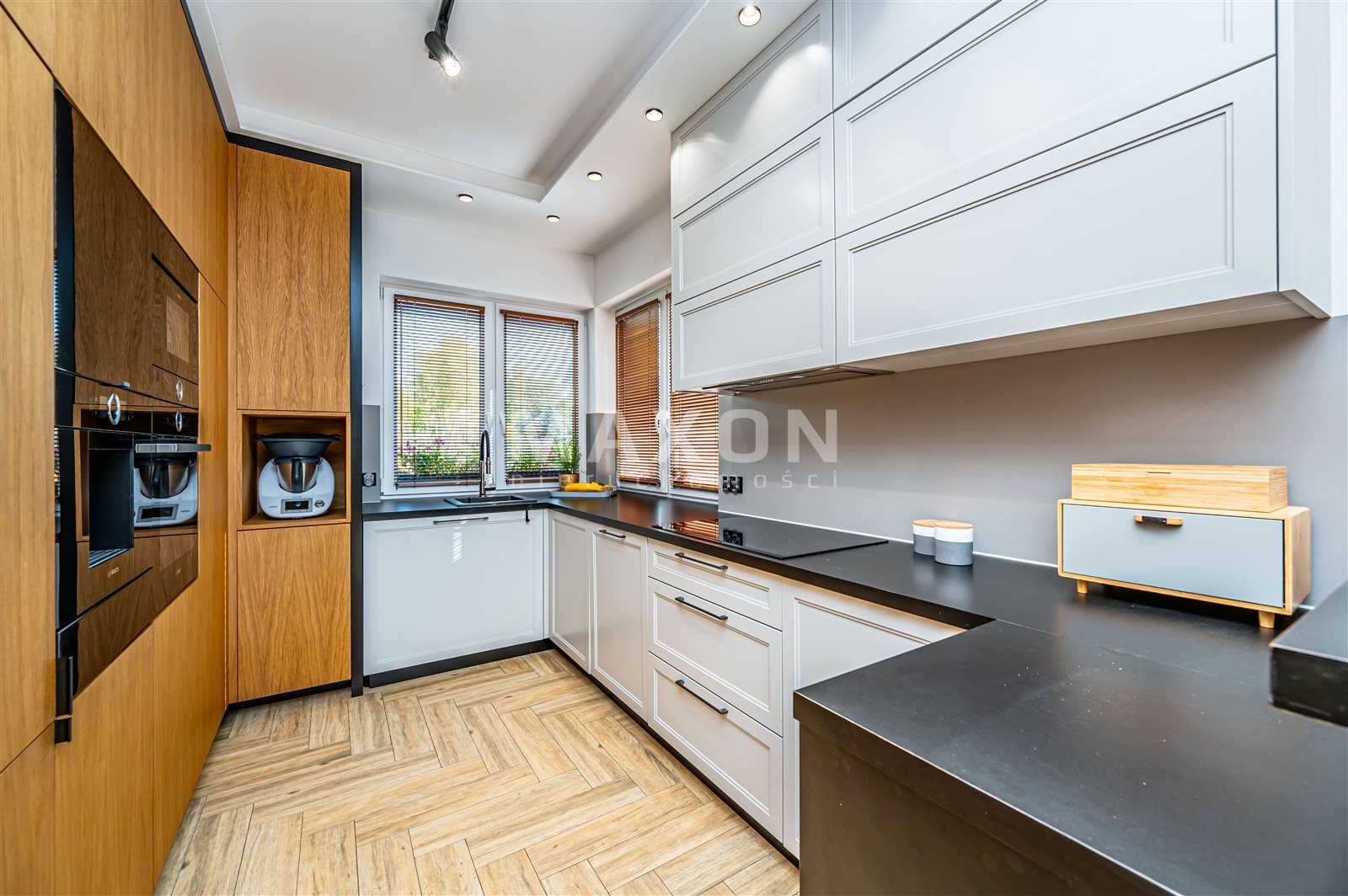 Dom wykończony jest w wysokim standardzie – posiada okna trzyszybowe, ogrzewanie podłogowe, klimatyzację, centralny odkurzacz, zabudowaną kuchnię z AGD oraz drzwi antywłamaniowe. Dach pokryty blachodachówką, ocieplony, z klimatyzacją, system podlewania automatycznego w ogrodzie.