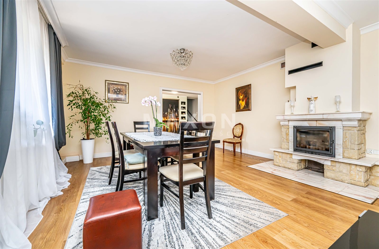 Salon z kominkiem (rozprowadzenie ogrzewania na dom)– jasny, przestronny, z widokiem na zieleń