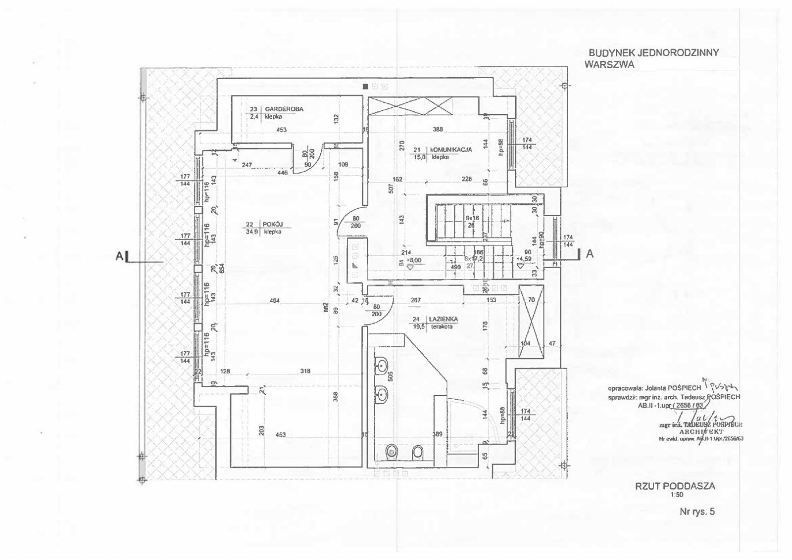 - Poddasze: pokój 35 m2, garderoba, łazienka 19,5m2