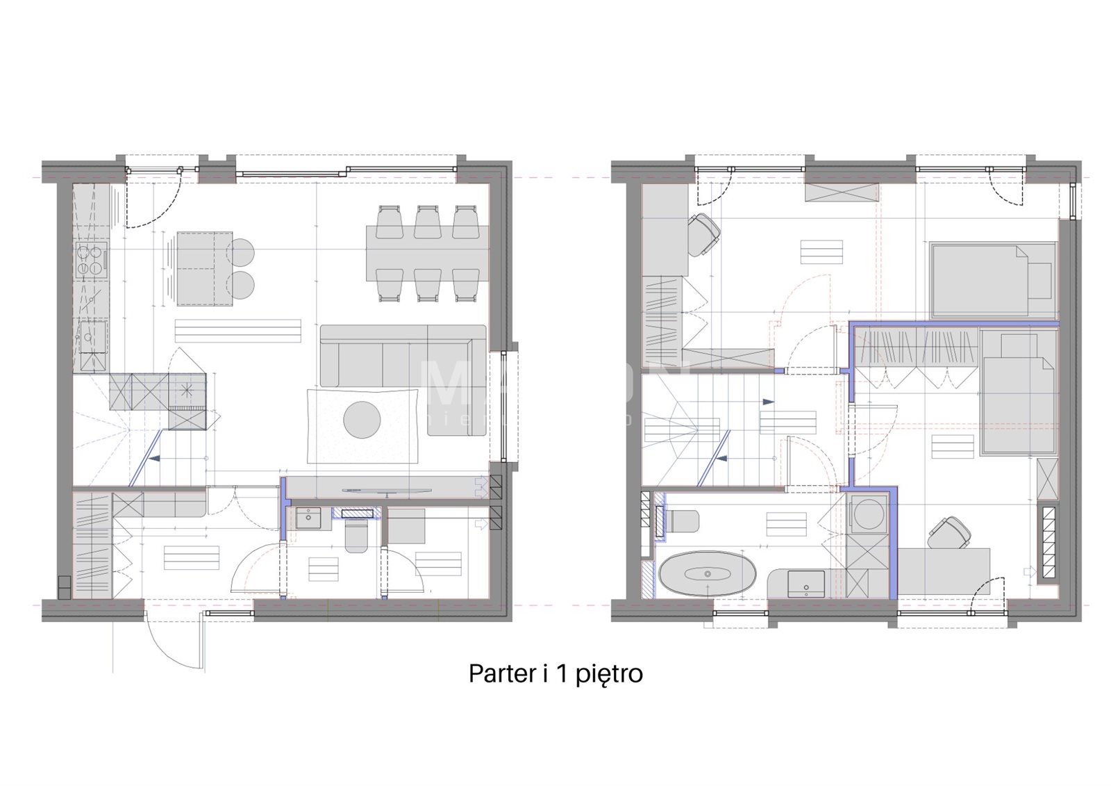 Parter - duży, jasny salon z miejscem na jadalnię i wyjściem do ogrodu, kuchnia otwarta na salon, łazienka wraz z pomieszczeniem gospodarczym;