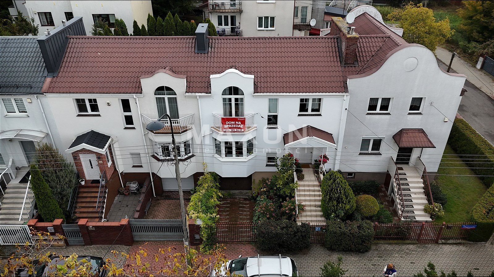 Dom usytuowany jest przy spokojnej uliczce, gwarantującej ciszę i prywatność, a jednocześnie zapewniającej doskonały dostęp do miejskiej infrastruktury. Zaledwie niespełna 10 minut spacerem dzieli nieruchomość od stacji Metra i przystanków autobusowych, co stanowi ogromny atut dla osób pracujących w innych dzielnicach Warszawy. W bliskiej odległości znajdują się również placówki oświatowe, co czyni tę ofertę szczególnie atrakcyjną dla rodzin z dziećmi i tylko 2 km dzielą ją do terenu spacerowego w lesie na Utracie tuż przy kanale bródnowskim.