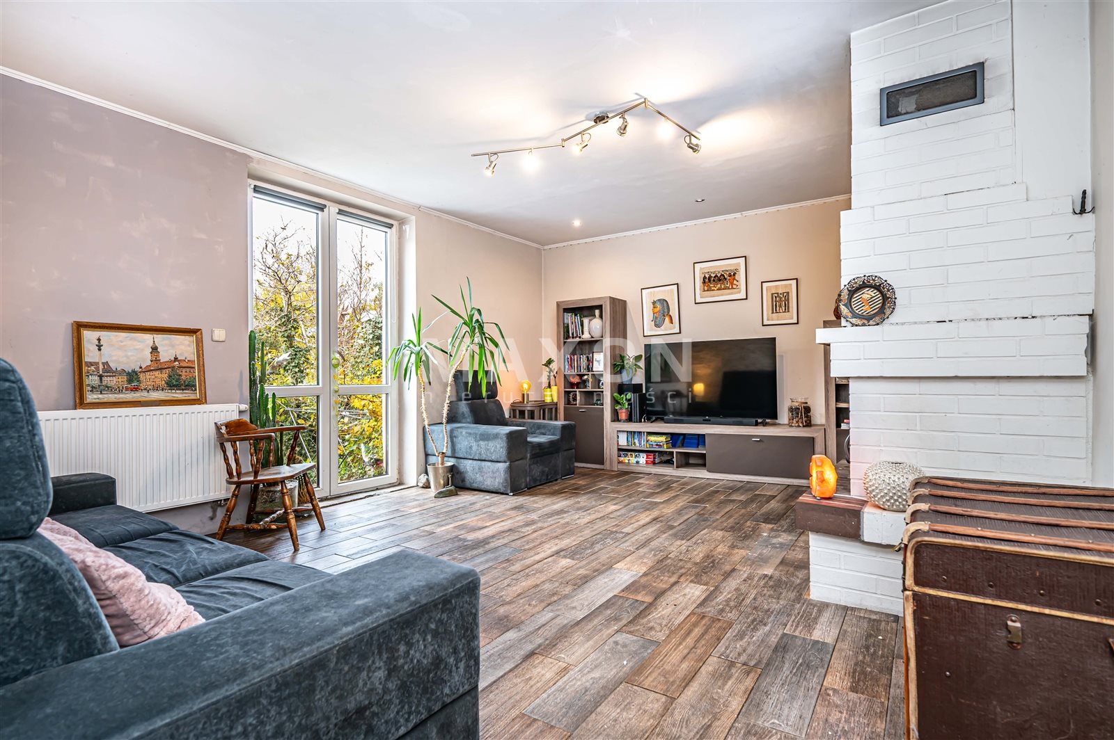 - salon z kominkiem oraz wyjściem na taras i ogród