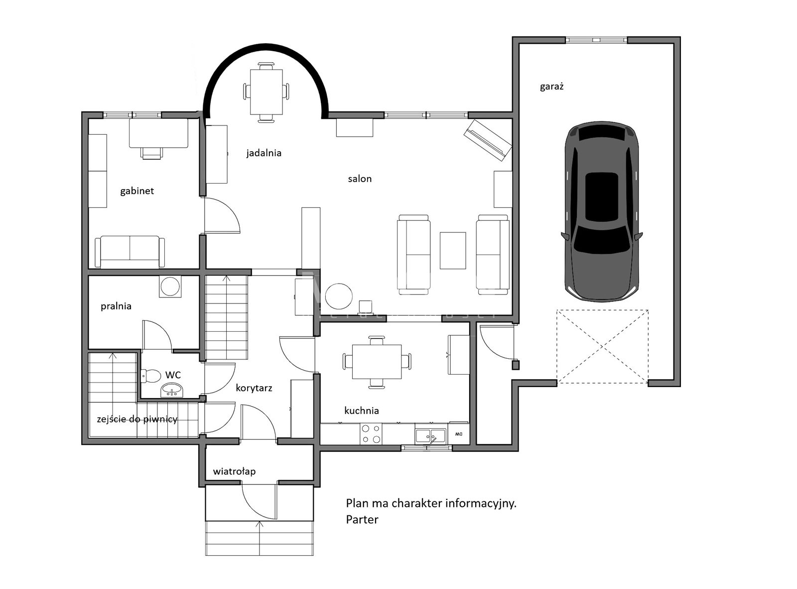 Budynek jest podpiwniczony. Na poziomie -1 znajduje się kotłownia i pomieszczenie piwniczne. Duży garaż jest usytuowany w bryle budynku.