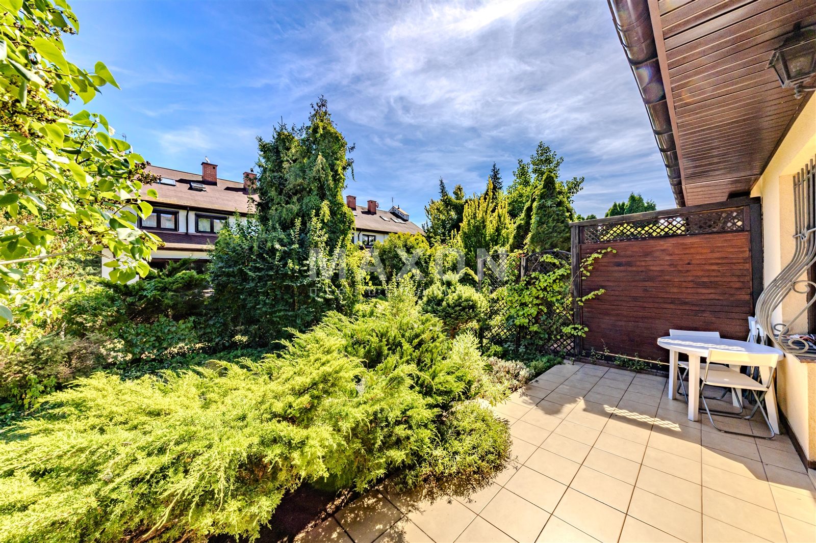 Działka zagospodarowana i zadbana. Od sąsiadów odgradza ją ściana zieleni.