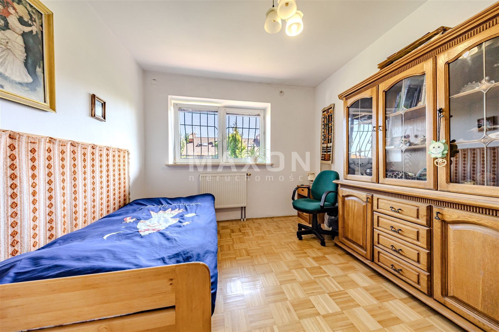 Pól piętra wyżej znajduje się gabinet. Na piętrze trzy sypialnie i łazienka.