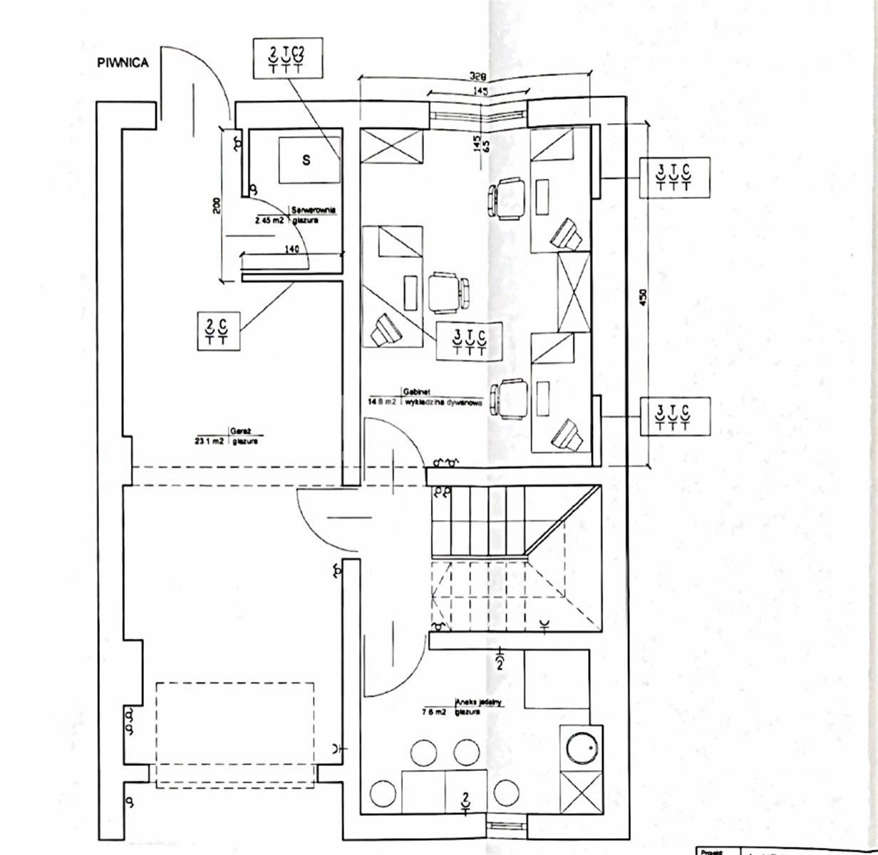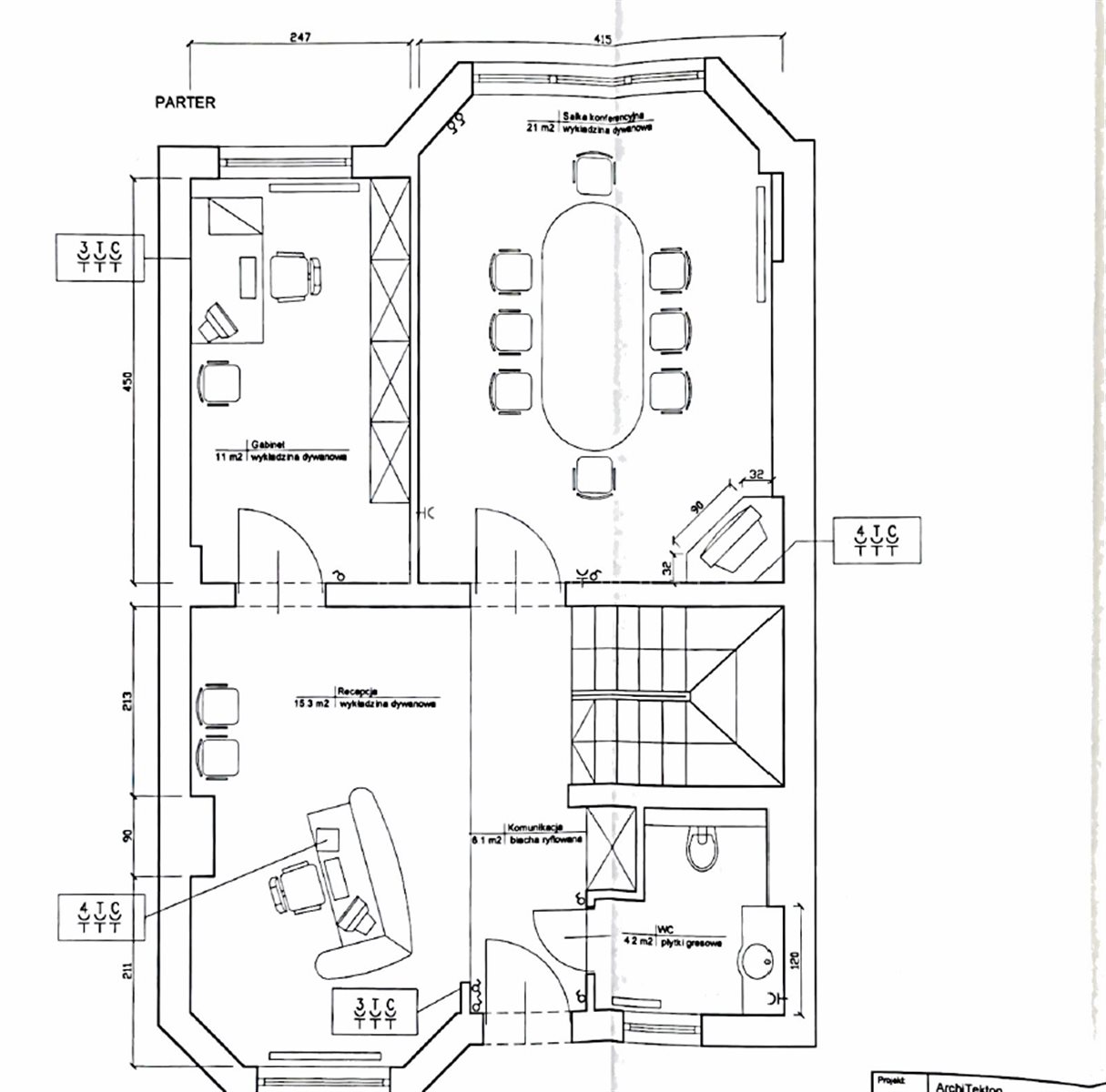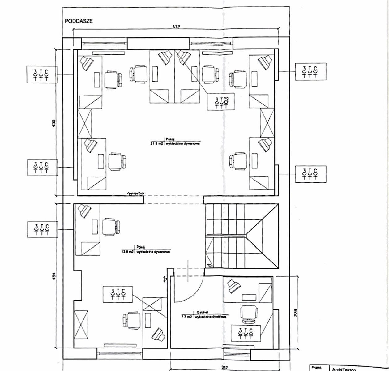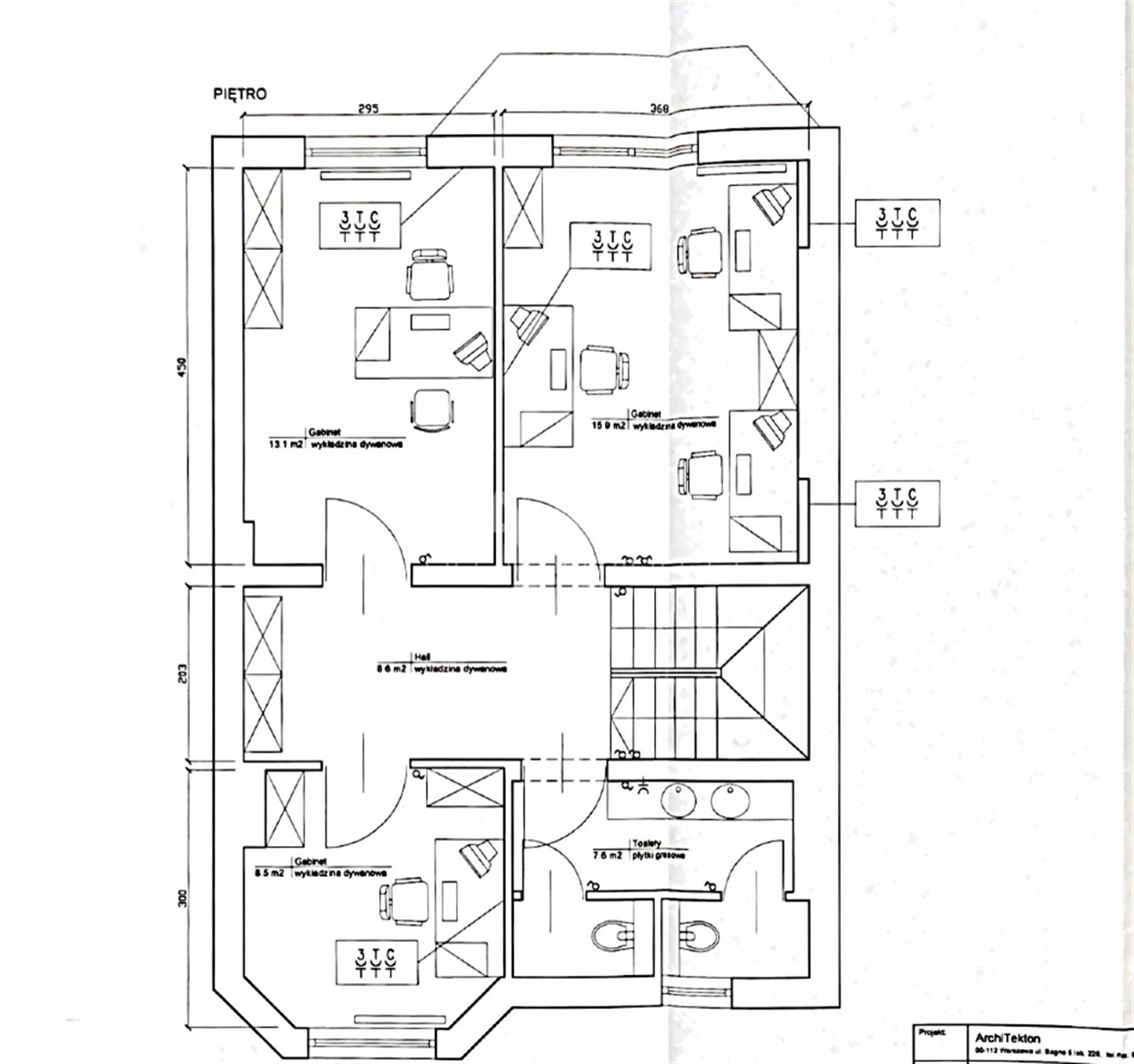 Załączone są obecne plany powierzchni biurowej, ale mamy również do dyspozycji plany powierzchni domu mieszkalnego zaprojektowane przez architekta, które możemy Państwu wysłać.