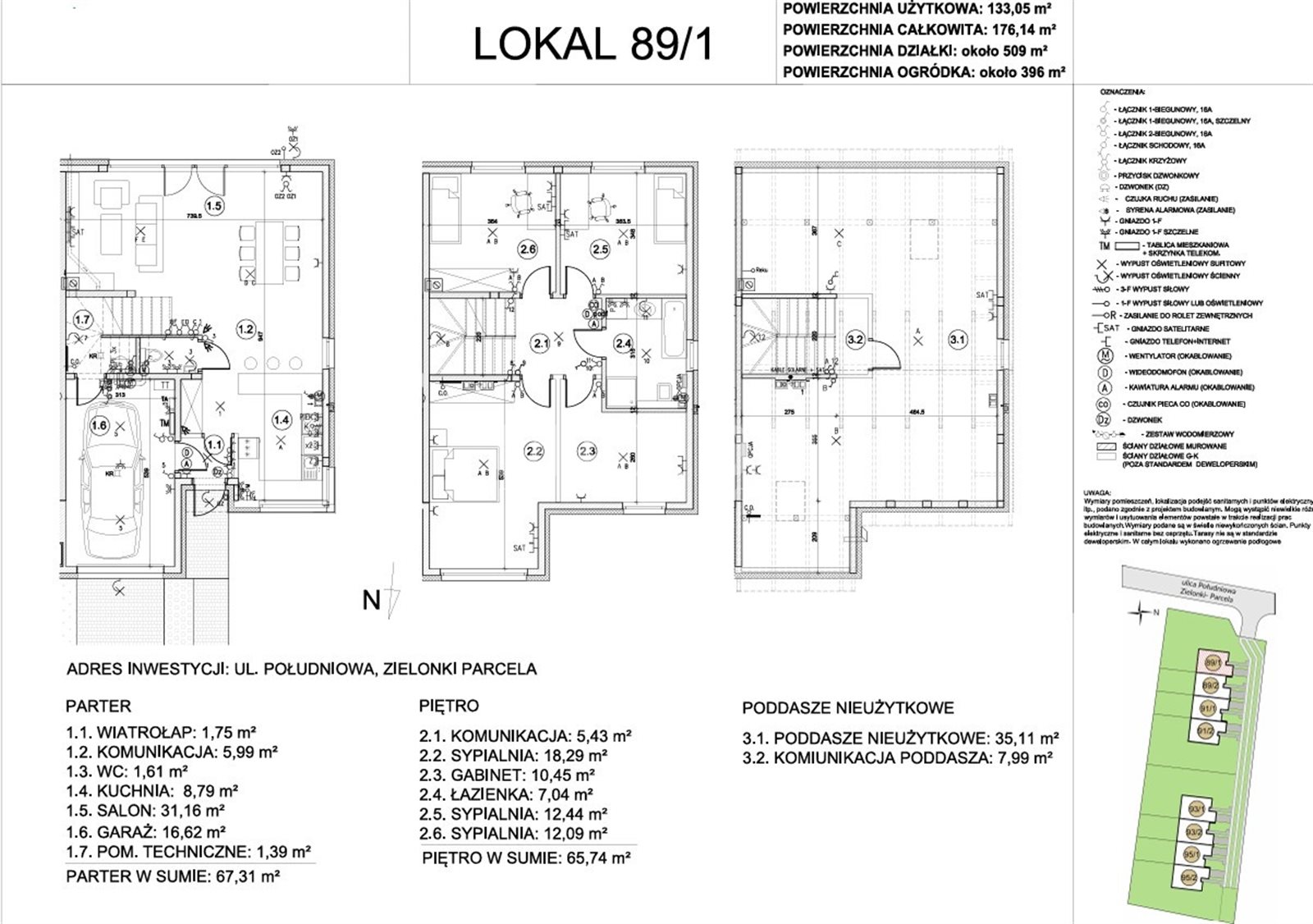 Powierzchnia użytkowa 133 m² + poddasze – łącznie 176,14 m², działka 509 m2.