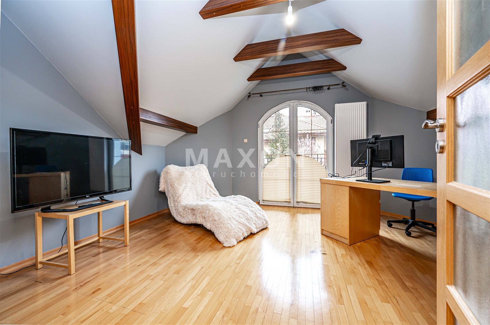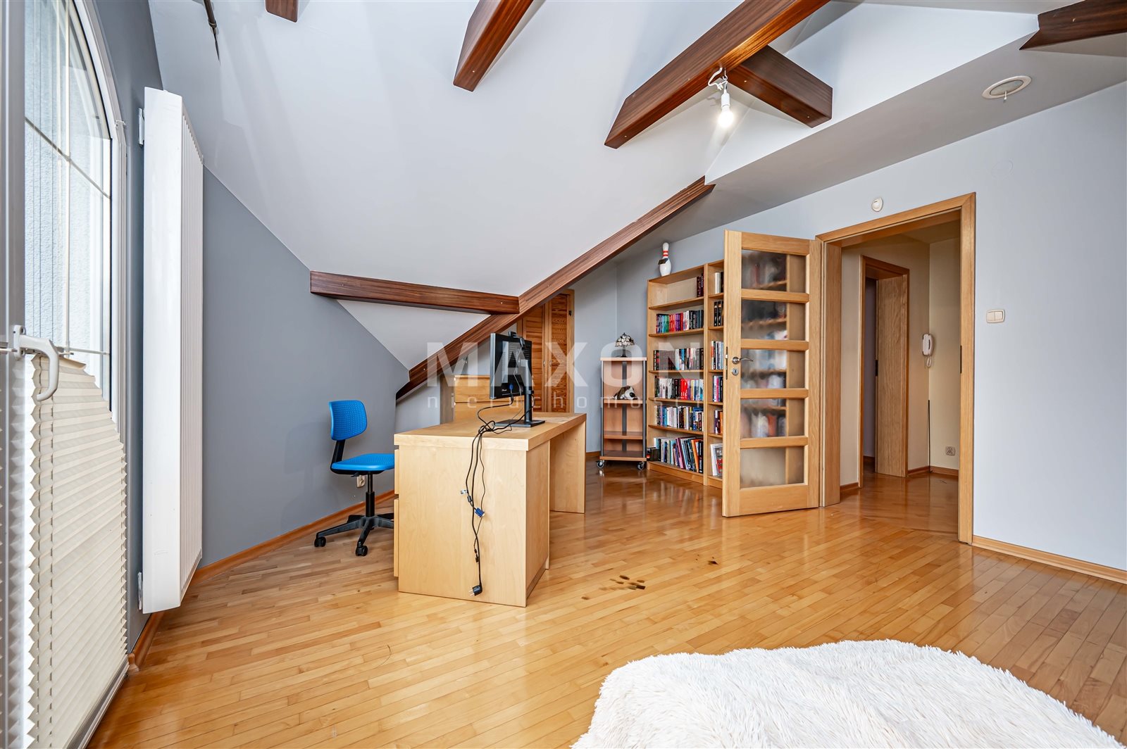 - Podłogi: w Salonie parkiet ciemny Merbau nigdy nie cyklinowany na piętrze buk