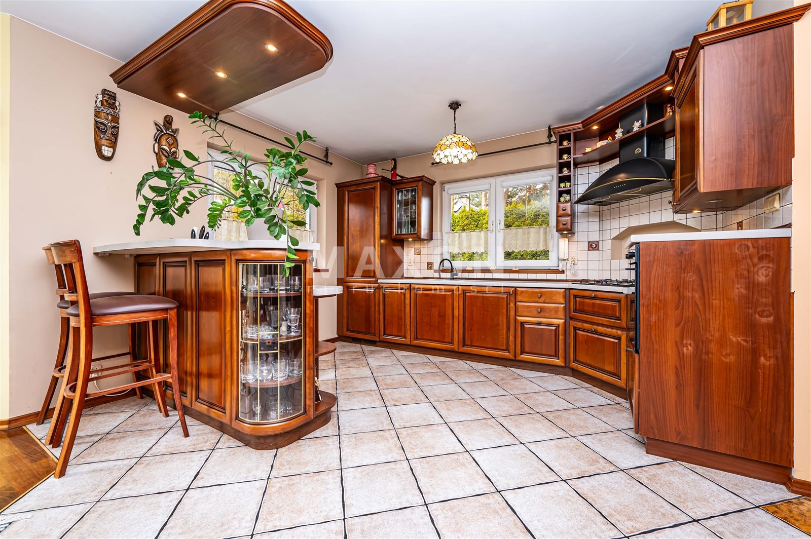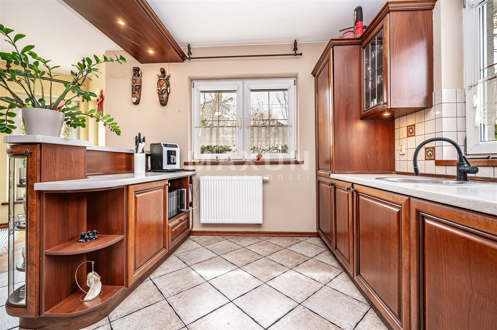 - Kuchnia otwarta widna doświetlona. Wyposażona w meble z litego drewna, wykonane na zamówienie