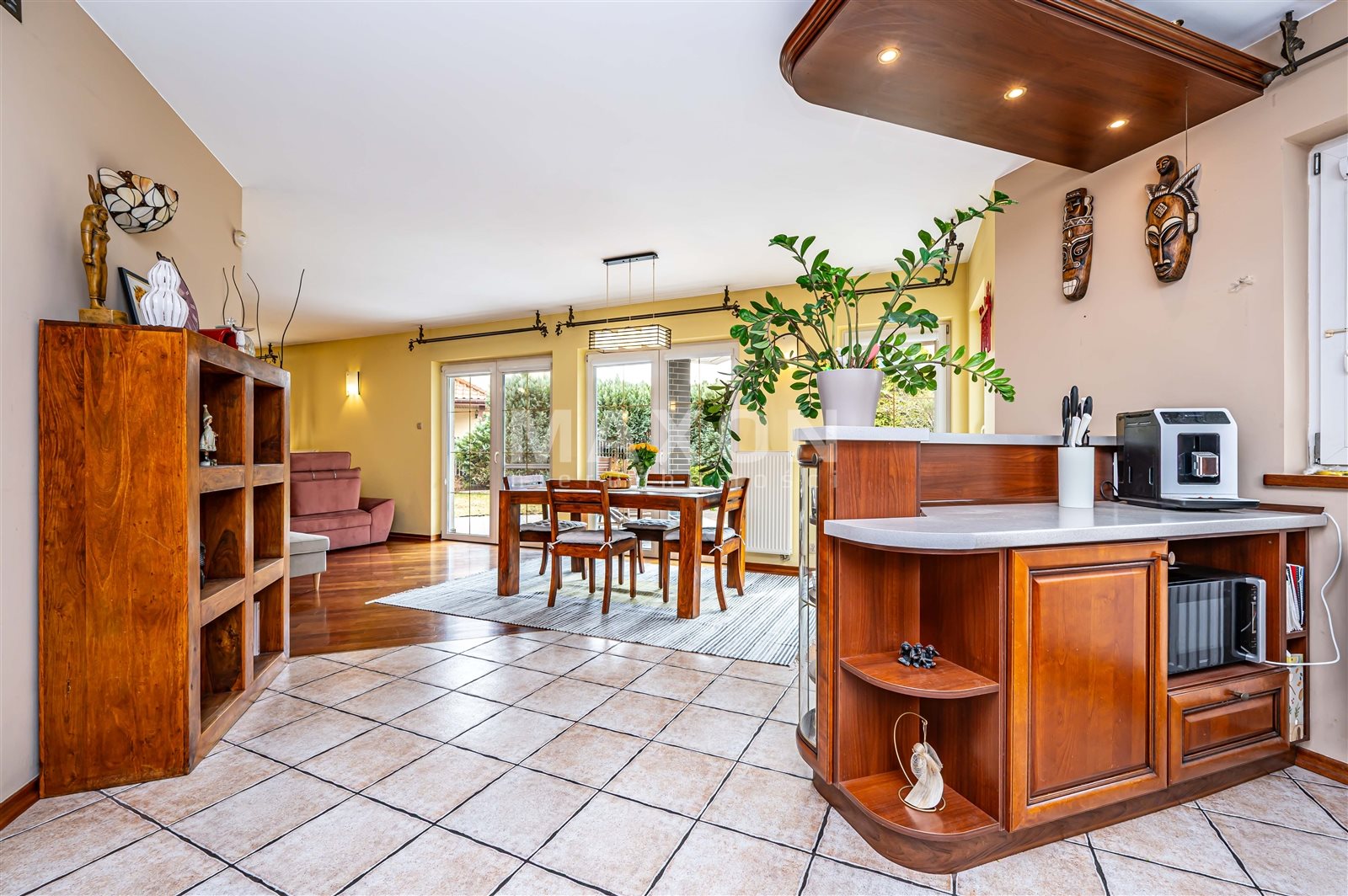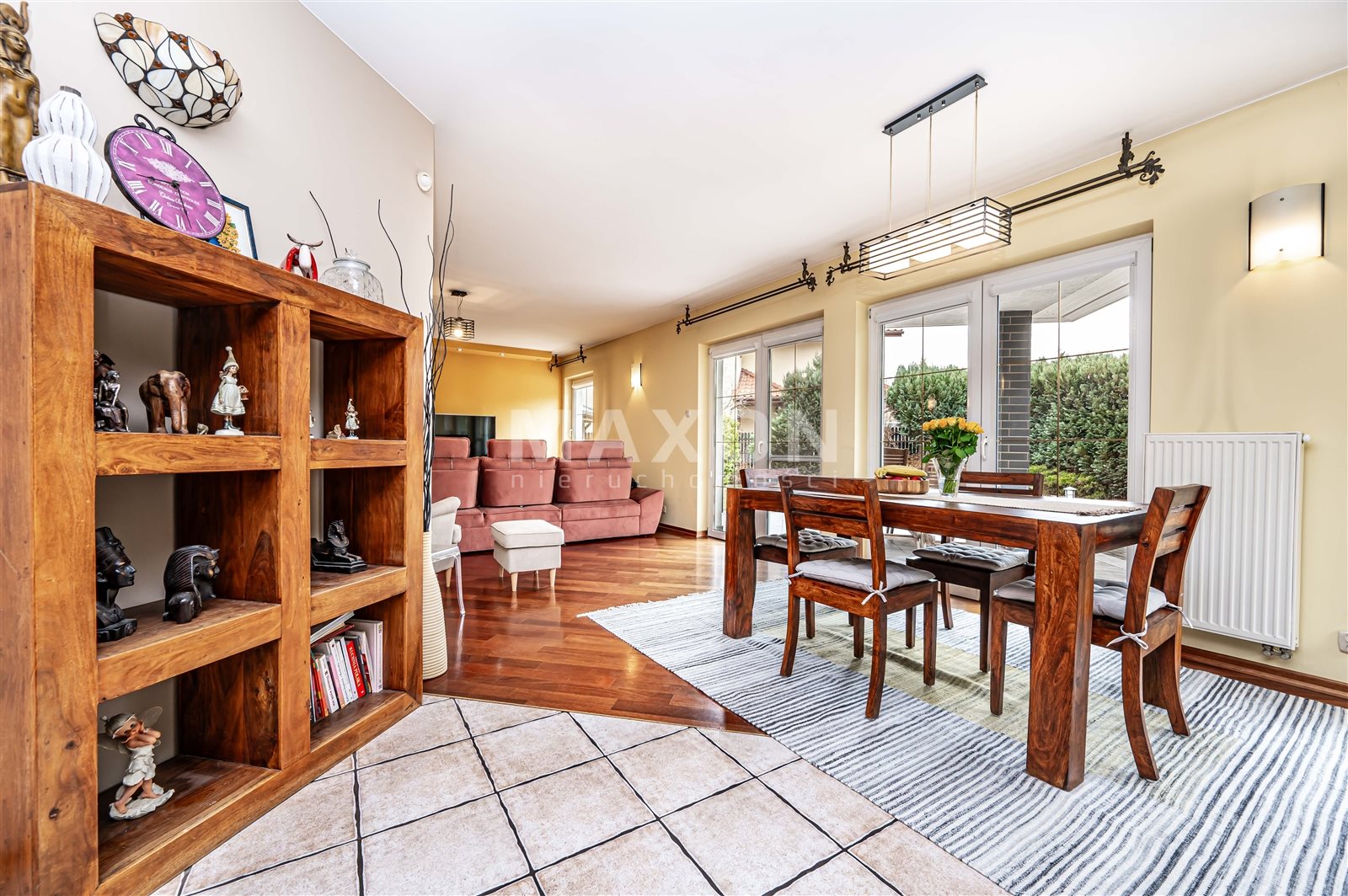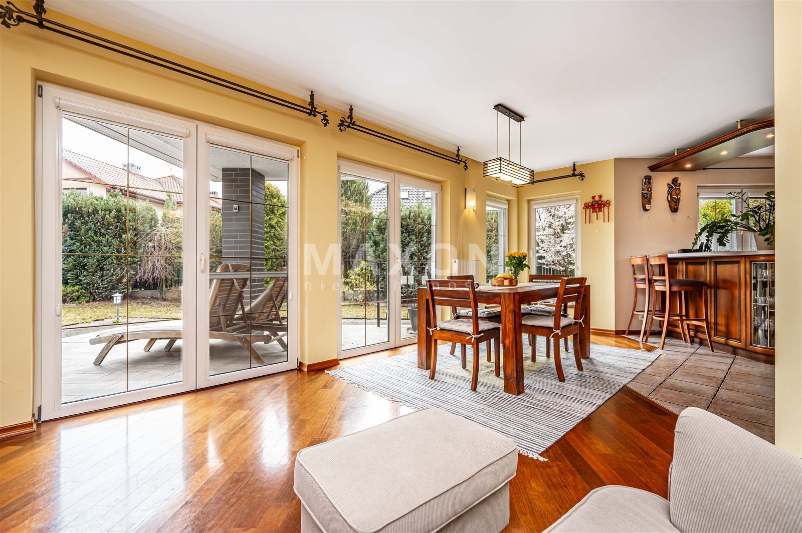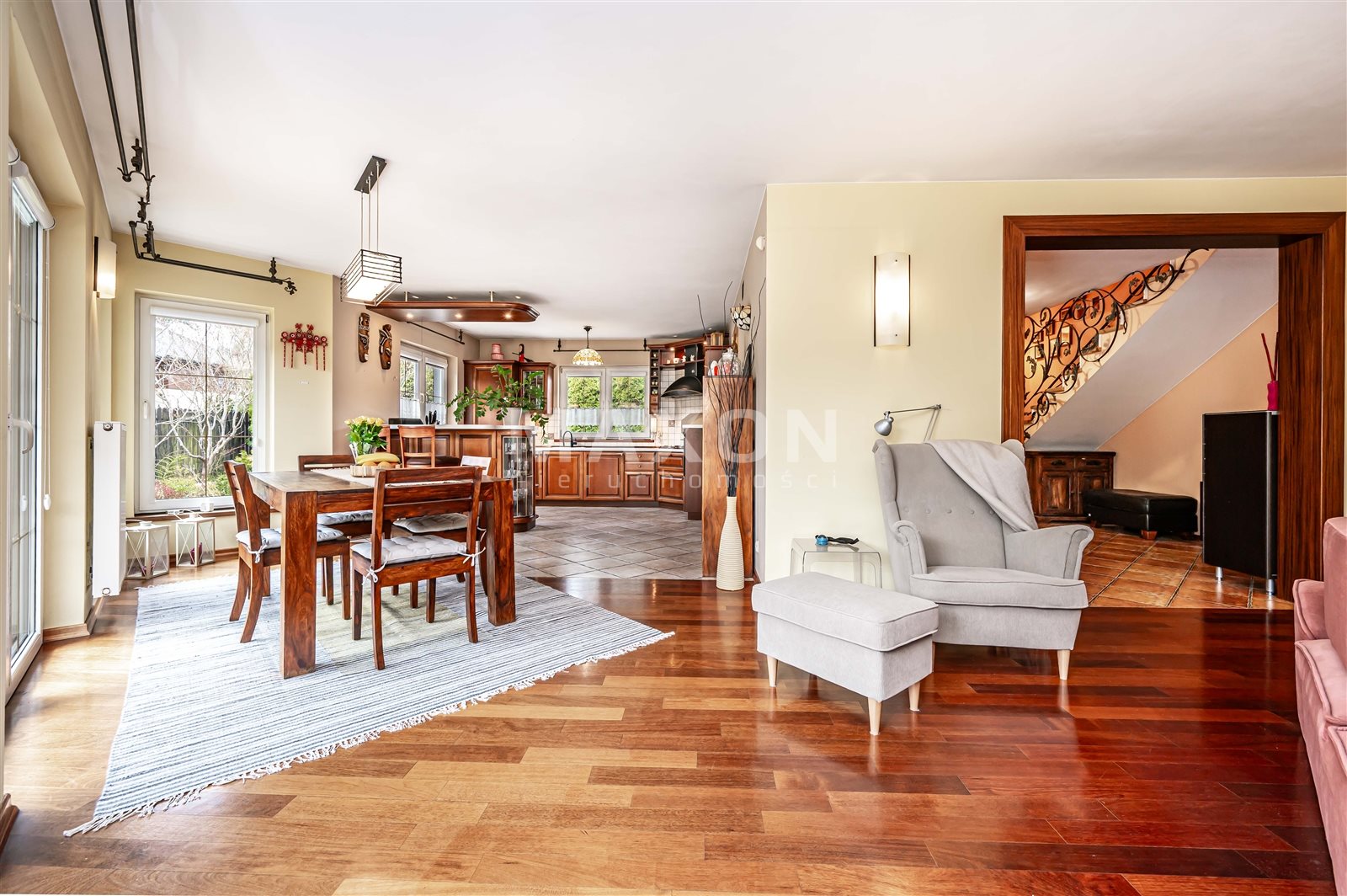 - Salon z jadalnią to wspaniale doświetlona przestrzeń poprzez duże okna z ekspozycją na piękny taras i ogród