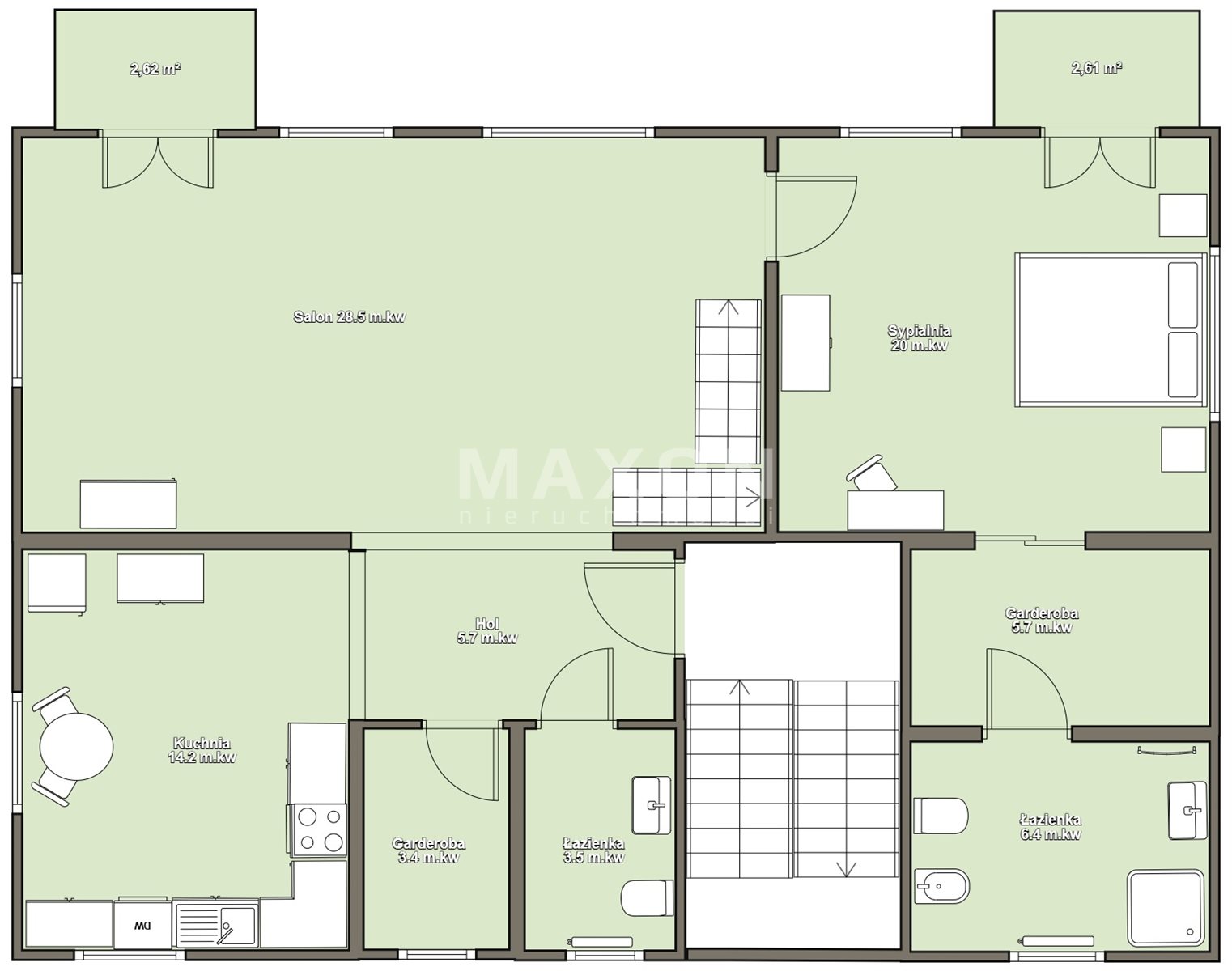 • pięknie doświetlonego salonu (28.5 m2) z wyjściem na balkon (2.6 m2) i klatką schodową na poziom górny,