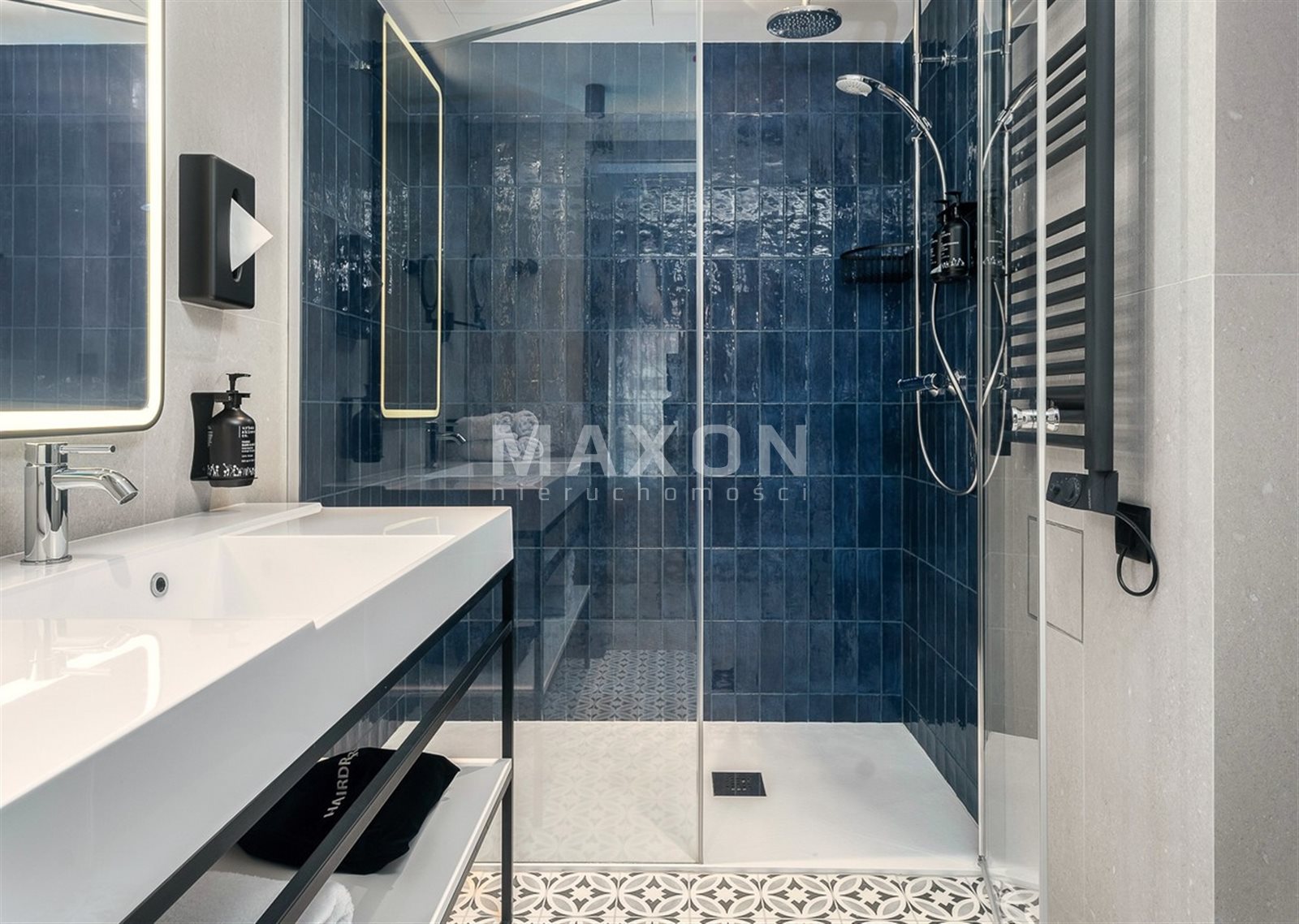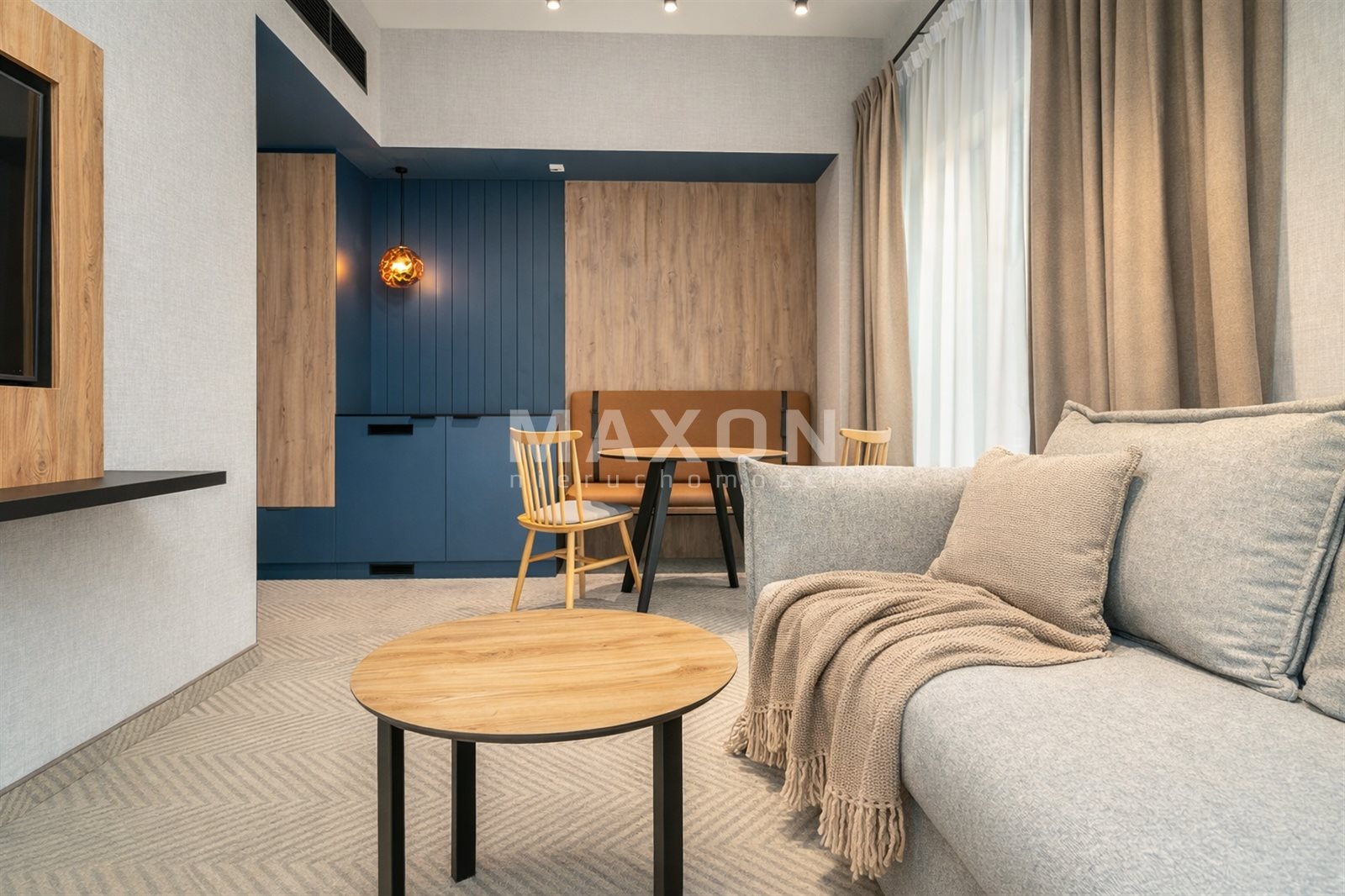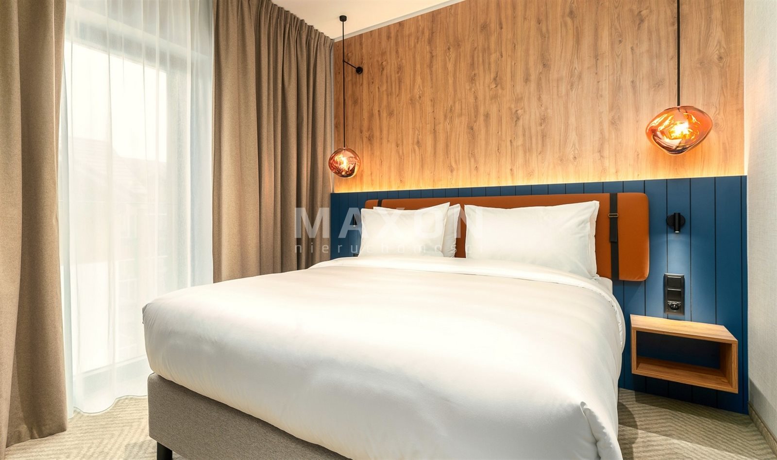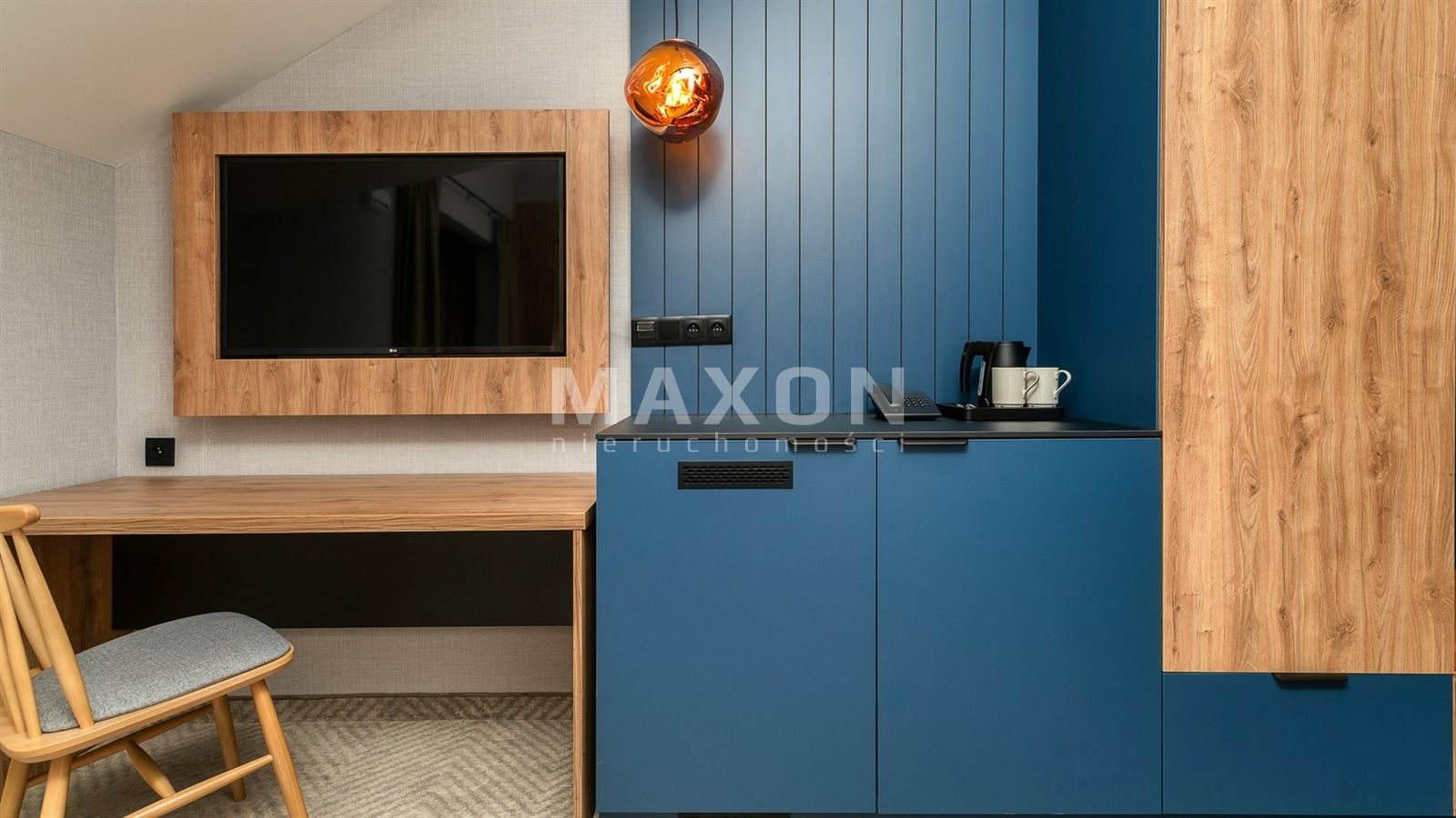 - designerskie wykończenie (drewno + granat + ciepłe światło)