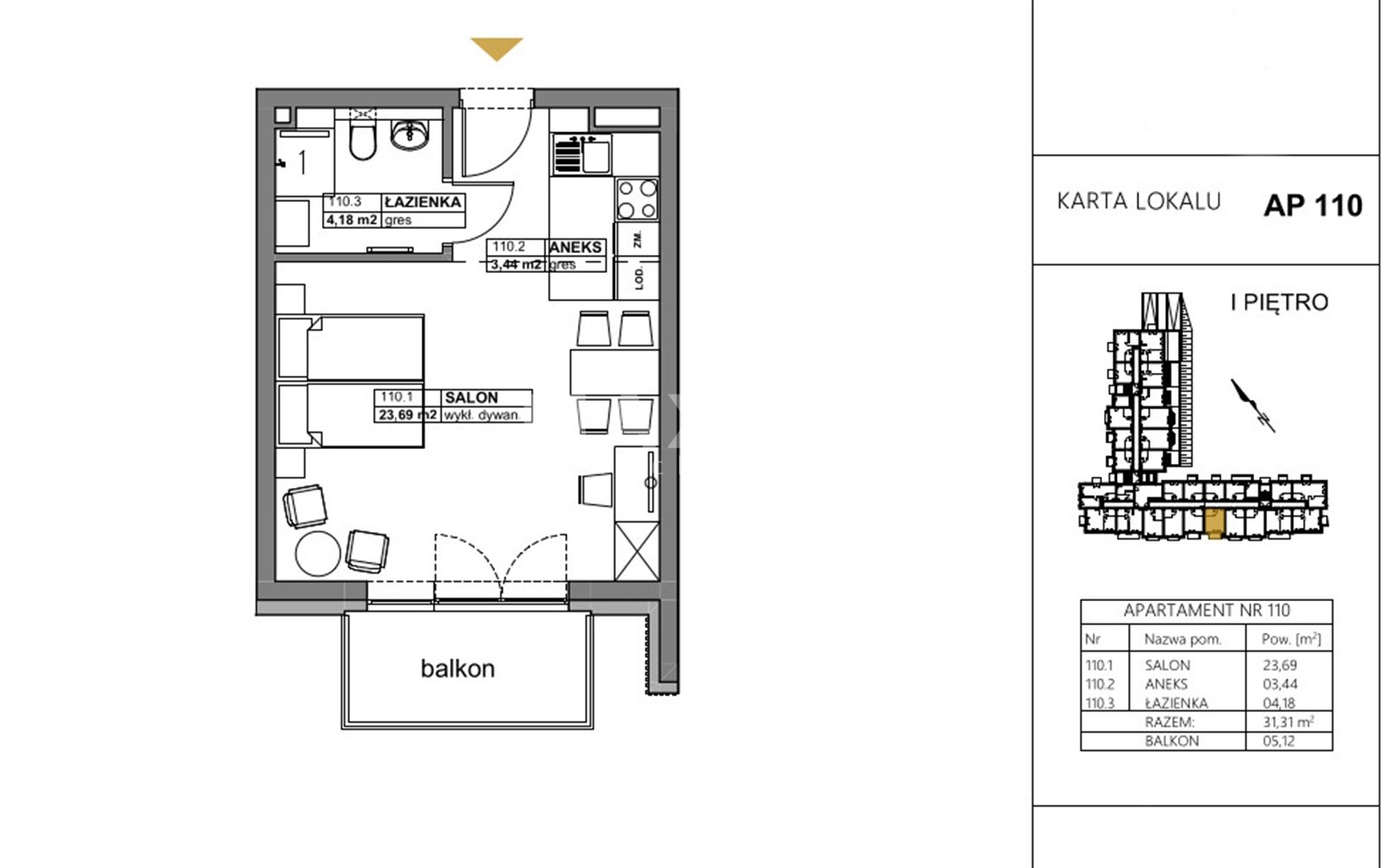 Apartament o powierzchni 31,31 m² znajduje się na 1 piętrze i składa się z: