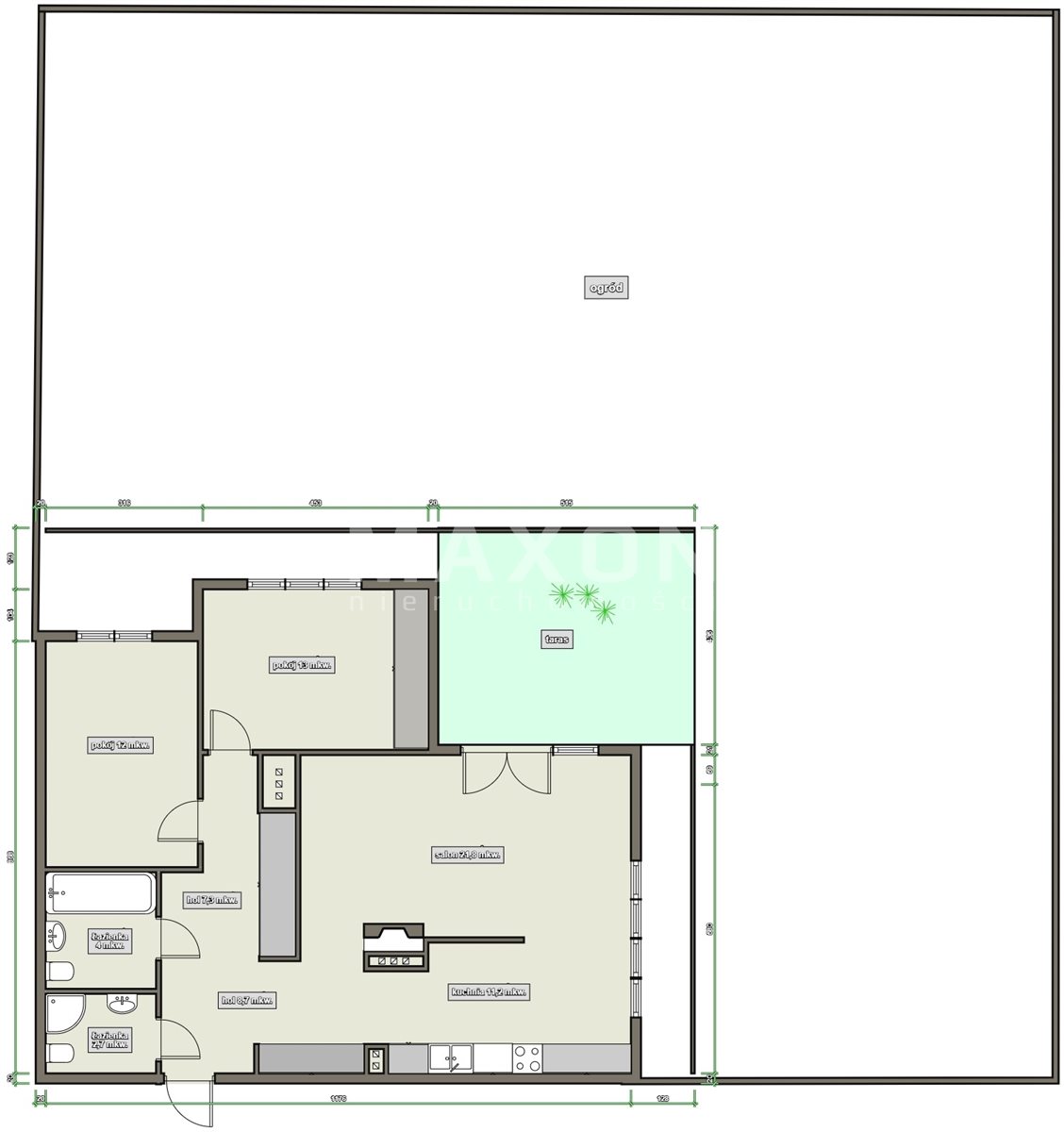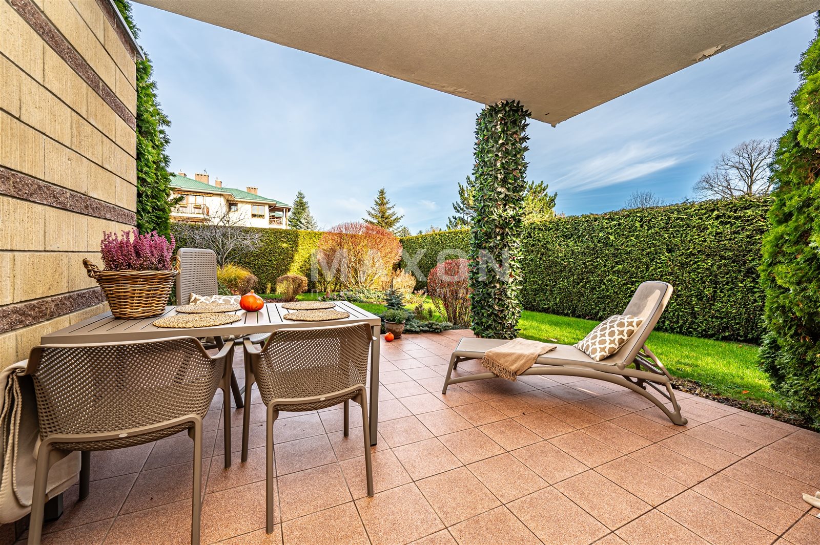 Ogród o powierzchni 260 mkw. jest czymś absolutnie wyjątkowym. Otoczony gęstym, wysokim żywopłotem, z pięknymi nasadzeniami, wypielęgnowanym i automatycznie nawadnianym trawnikiem, zapewnia doskonałe warunki do odpoczynku.