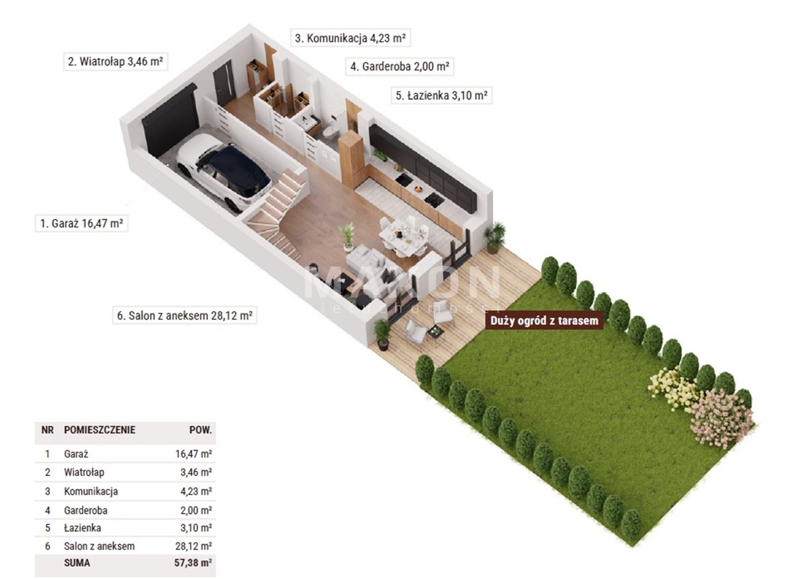 Na parterze znajduje się jasny, przestronny salon z aneksem kuchennym o powieszeni 29 mkw – serce domu. Ekspozycja południowo wschodnia To miejsce porannych kaw przy dużym stole, popołudniowych rozmów i wieczorów spędzanych wspólnie, z widokiem na prywatny ogród i taras, który latem staje się naturalnym przedłużeniem salonu.