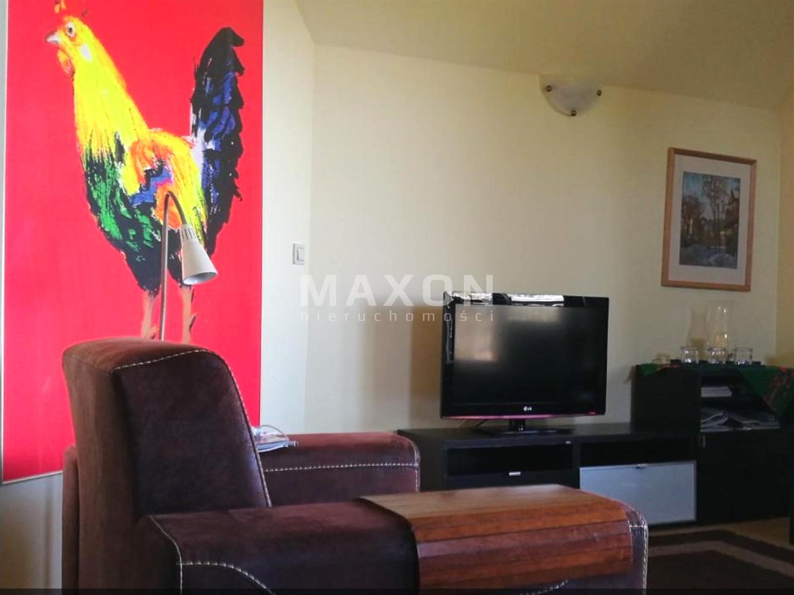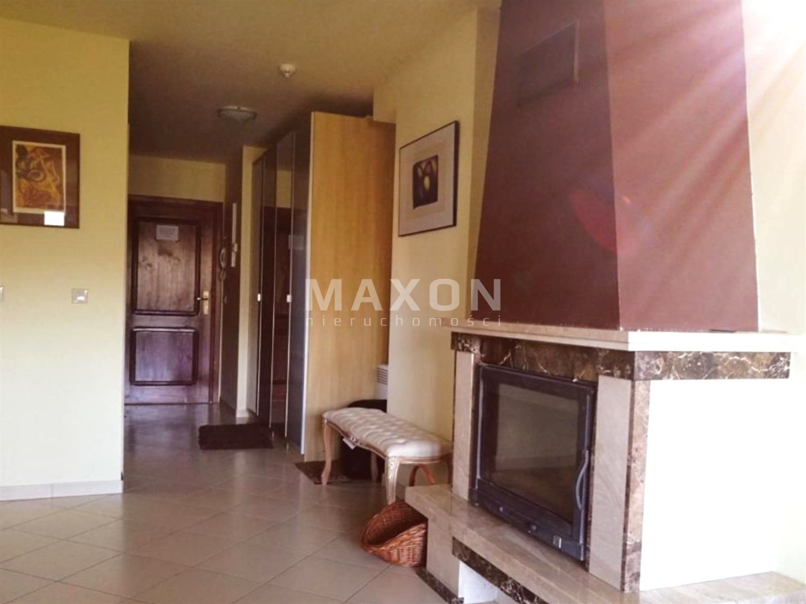 Podział to salon z kominkiem, z aneksem kuchennym, osobna sypialnia, łazienka.