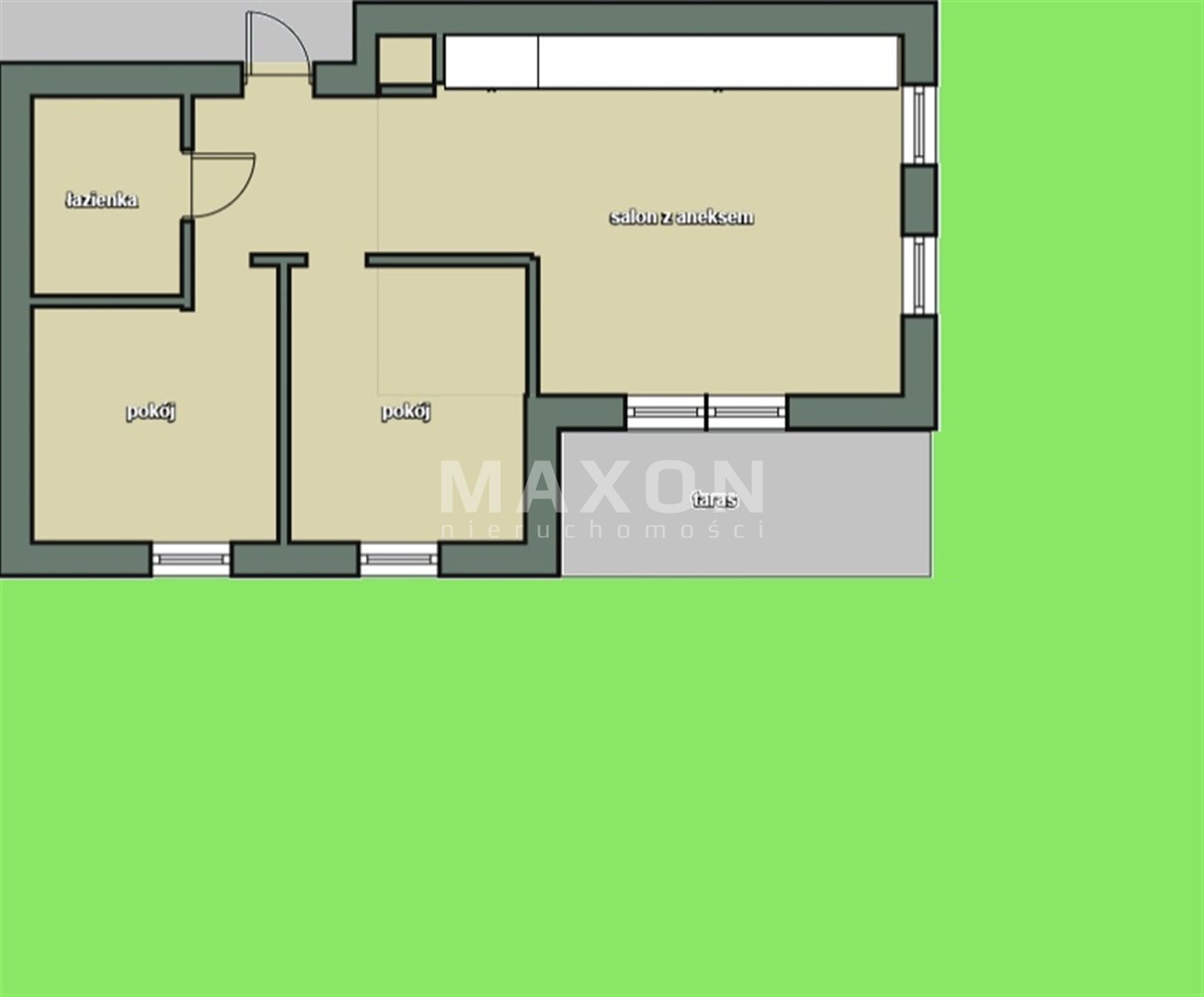 - jasny salon z aneksem kuchennym o łącznej powierzchni 23 mkw z dużymi oknami (ekspozycja na wschód oraz północ) z wyjściem do ogrodu,