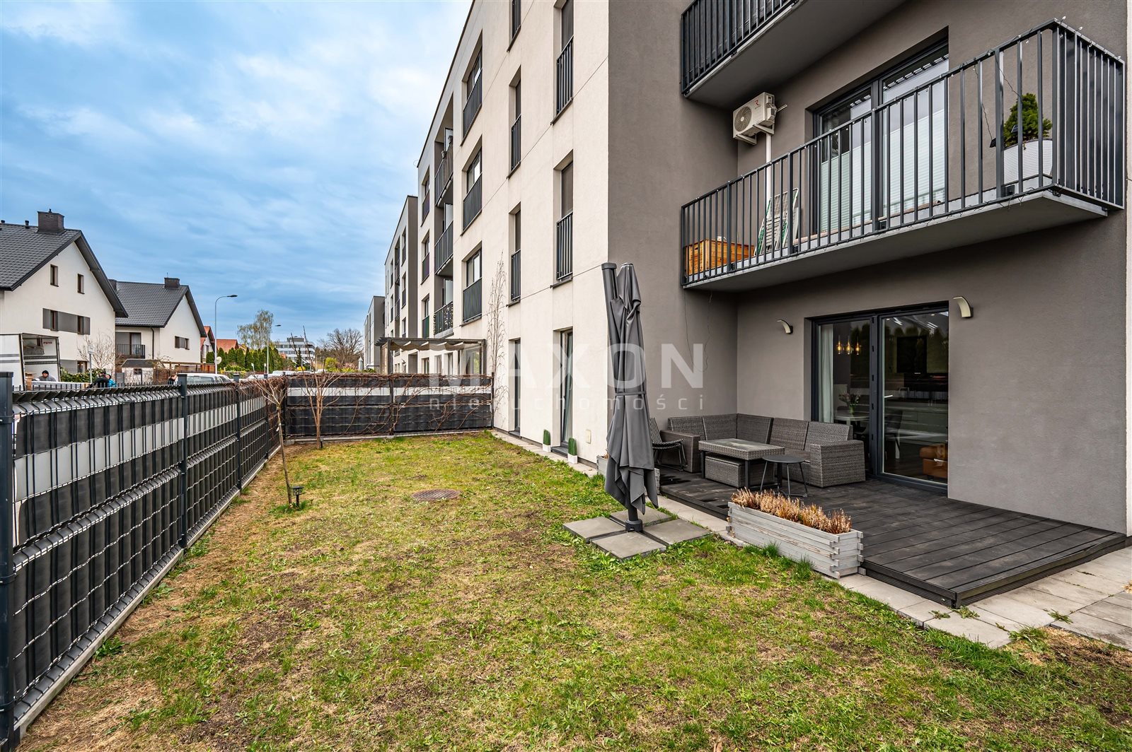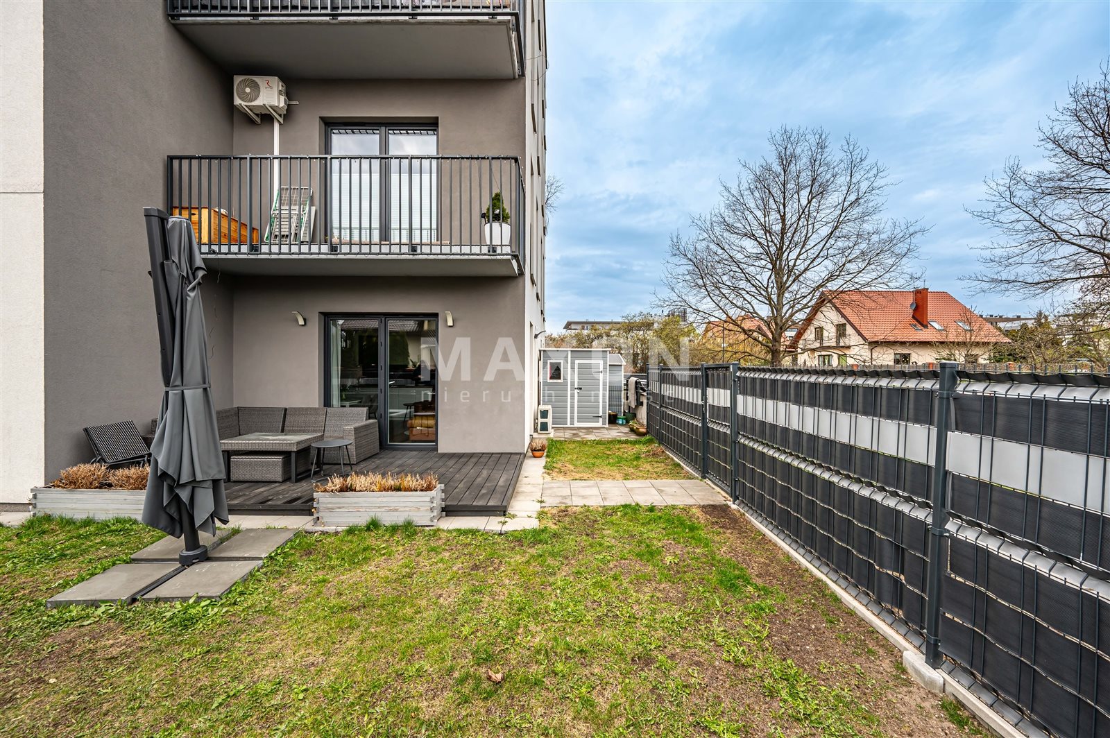 Własny ogródek (około 100 mkw) z częściowo zadaszonym tarasem (12 mkw) - ekspozycja północno-wschodnia oraz sporym schowkiem na narzędzia lub rowery. Idealne miejsce do wypoczynku po pracy, czy spotkań z rodziną i przyjaciółmi.