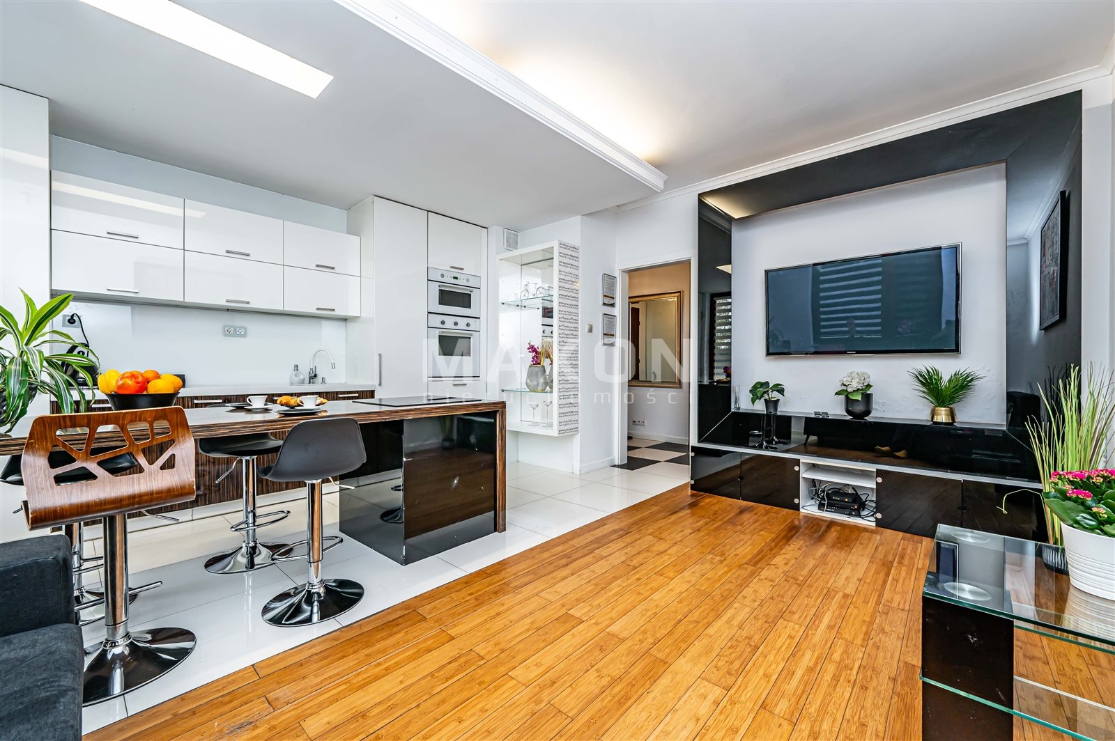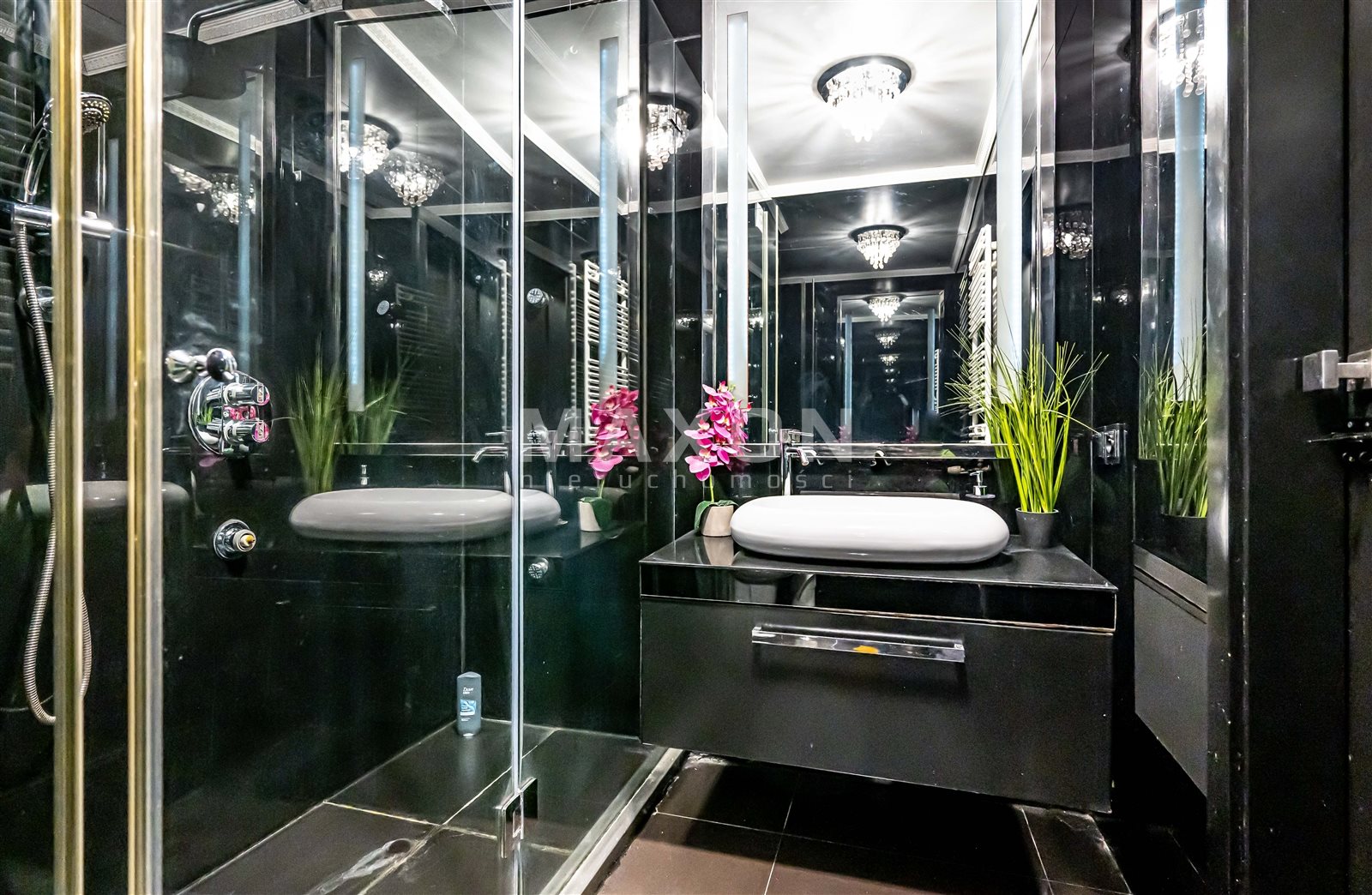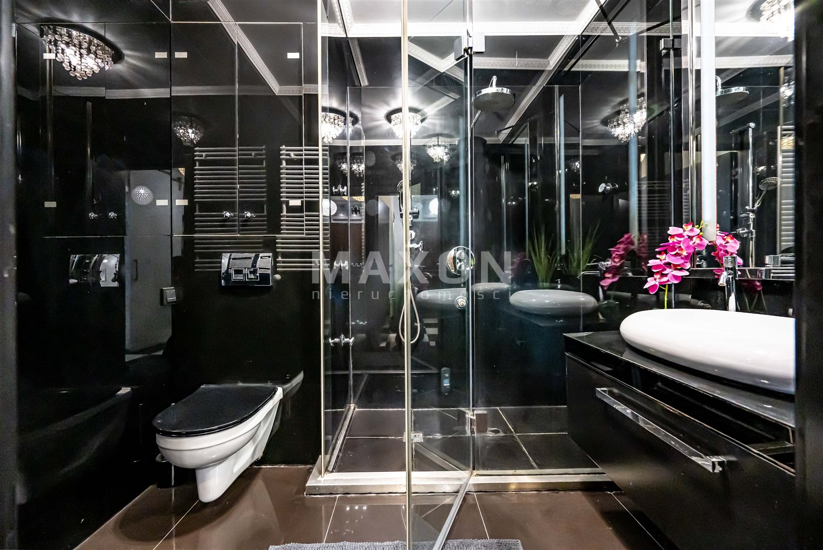 Mieszkanie urządzone w ciekawym nowoczesnym stylu. W przedpokoju ściana z fazowanych luster oraz szafa wnękowa, salon połączony z kuchnią, sypialnia oraz łazienka w czarnej glazurze z prysznicem stwarzają niepowtarzalny charakter mieszkania.