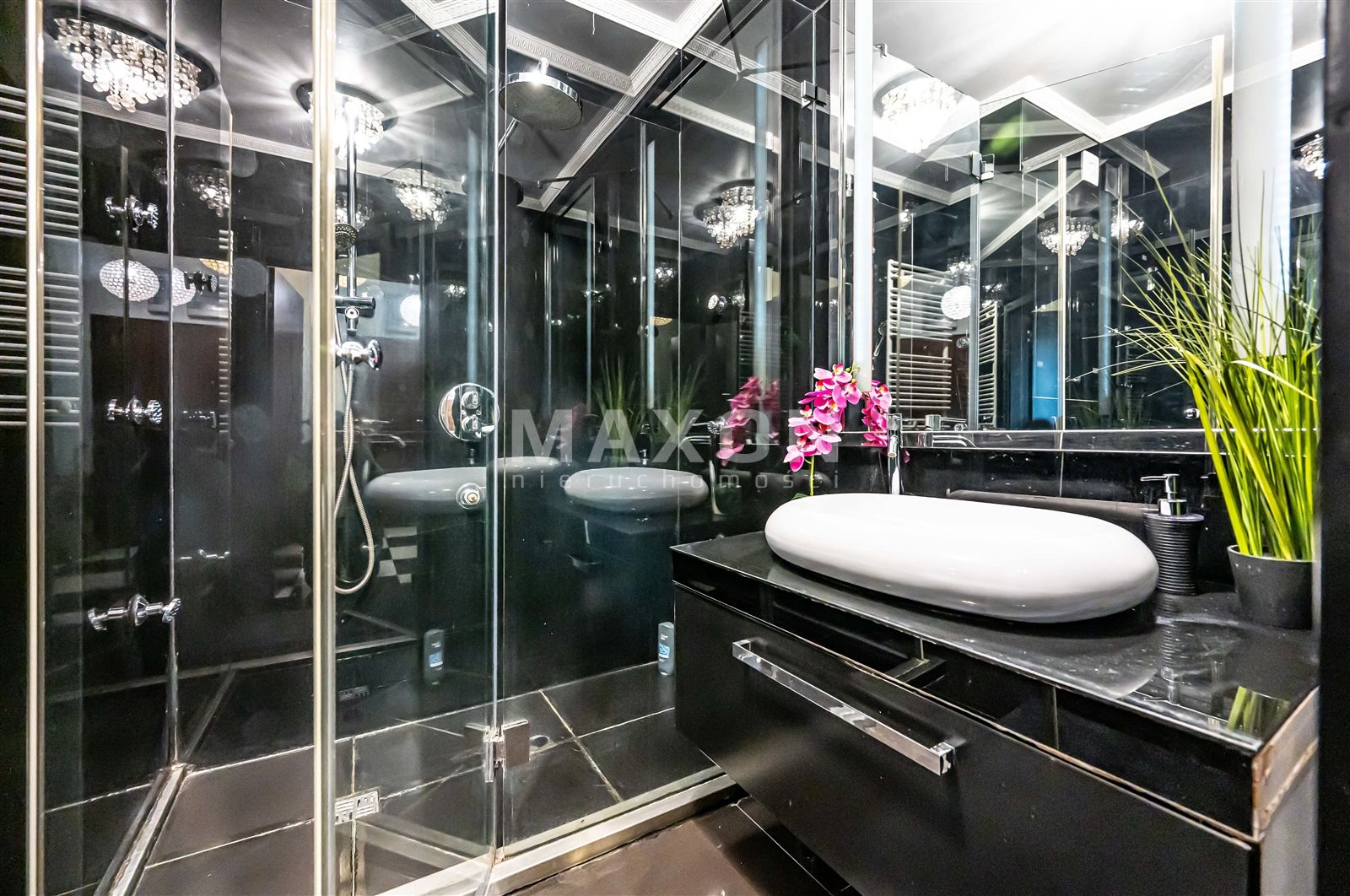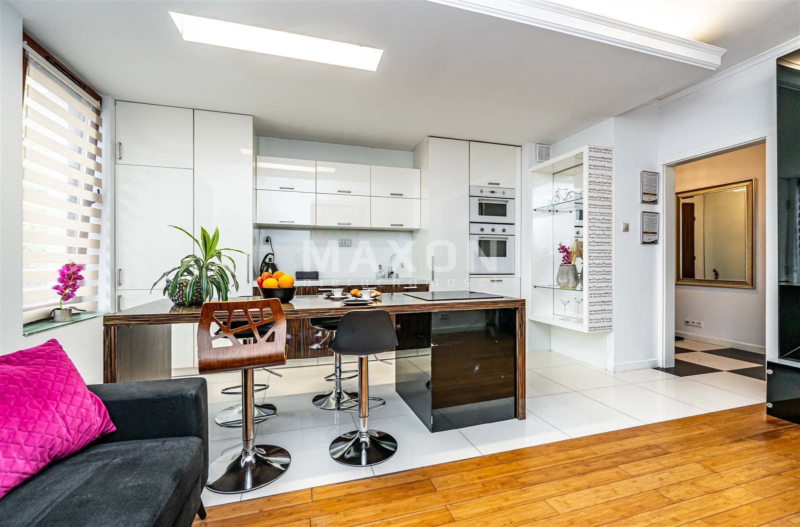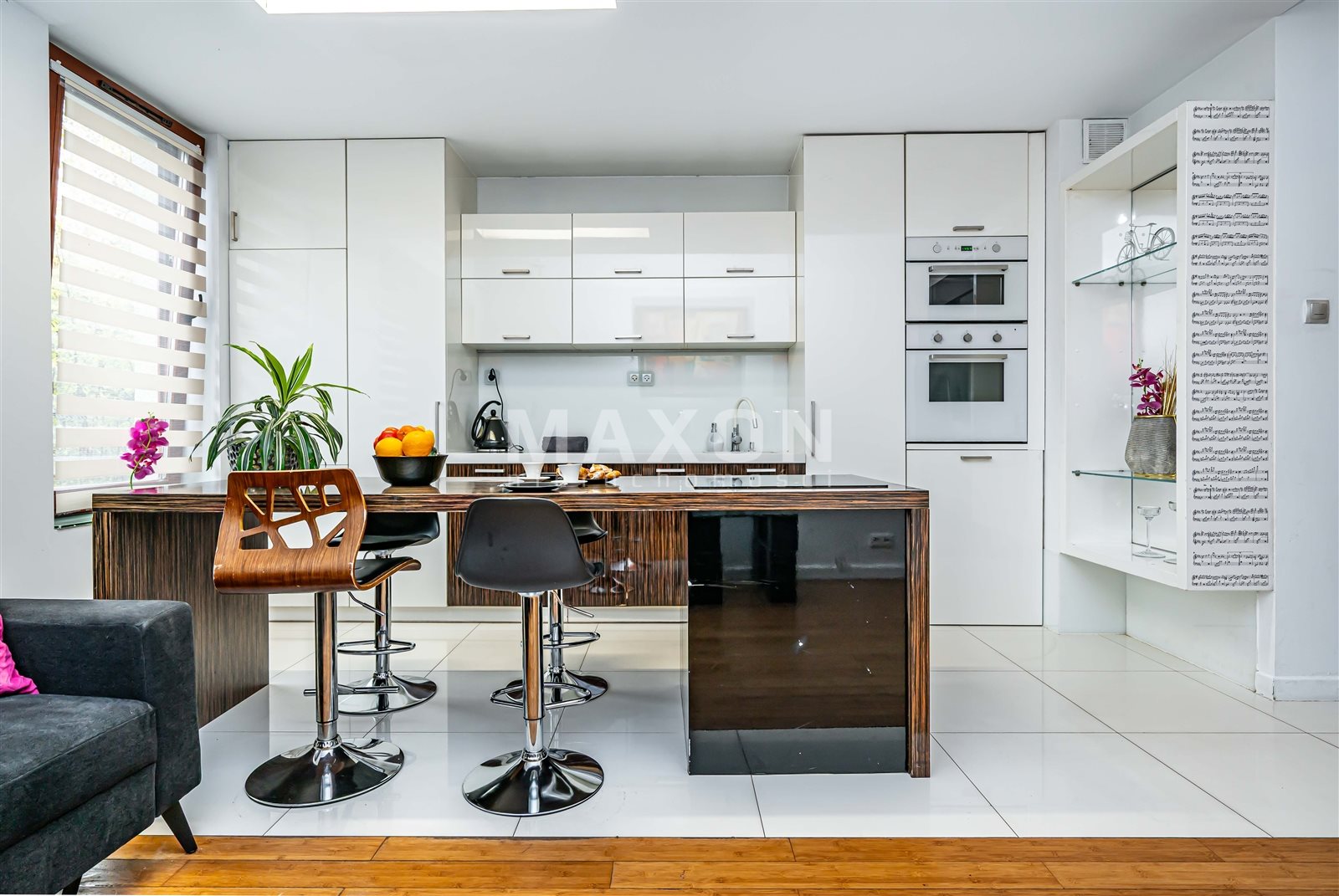 Mieszkanie urządzone w ciekawym nowoczesnym stylu. W przedpokoju ściana z fazowanych luster oraz szafa wnękowa, salon połączony z kuchnią, sypialnia oraz łazienka w czarnej glazurze z prysznicem stwarzają niepowtarzalny charakter mieszkania.