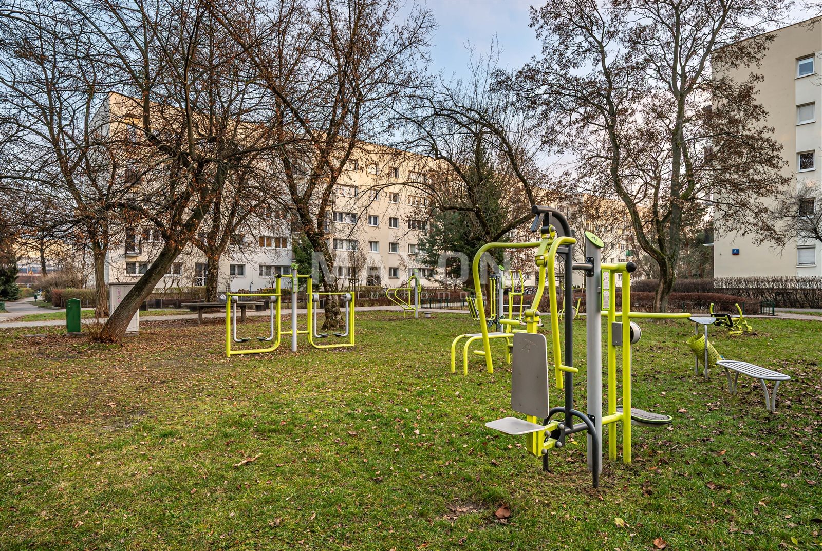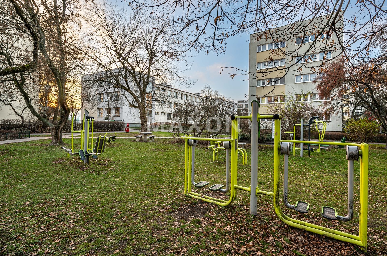 Przed blokiem zadbana zieleń, ławki, plac zabaw oraz plenerowa siłownia.