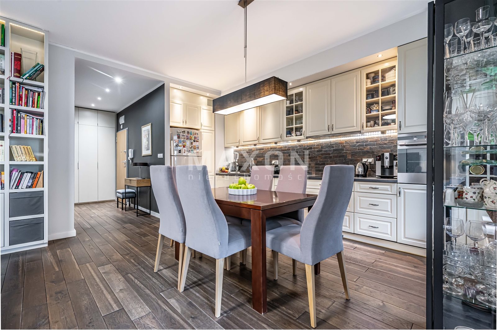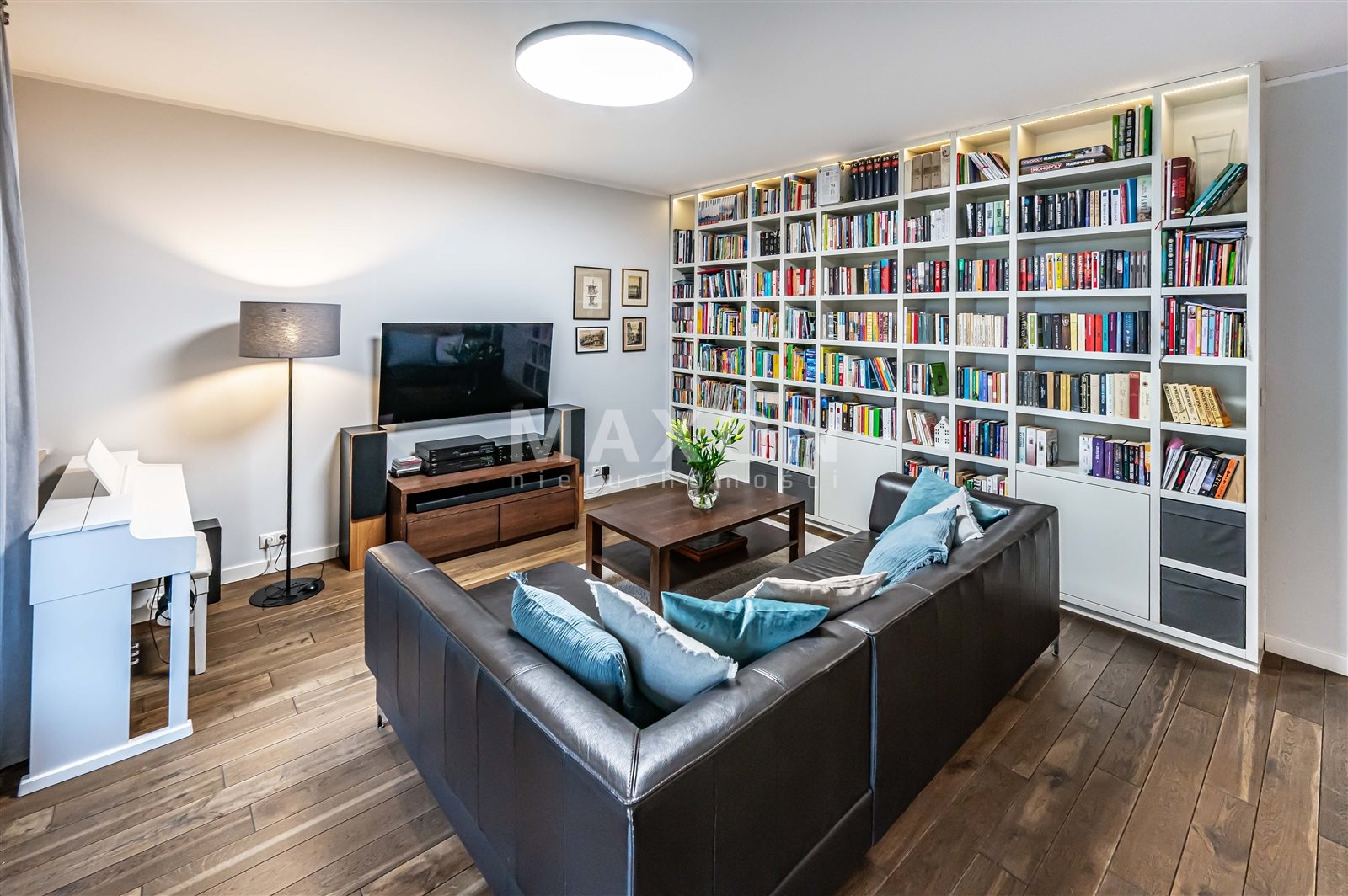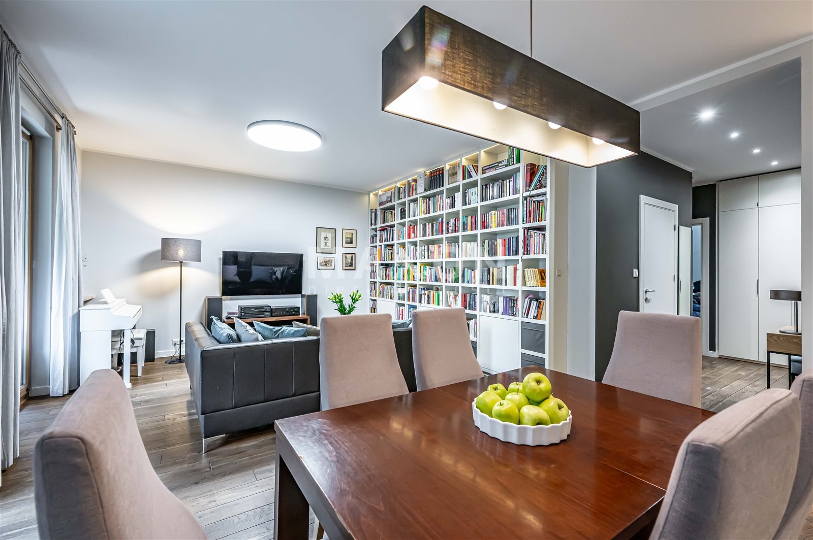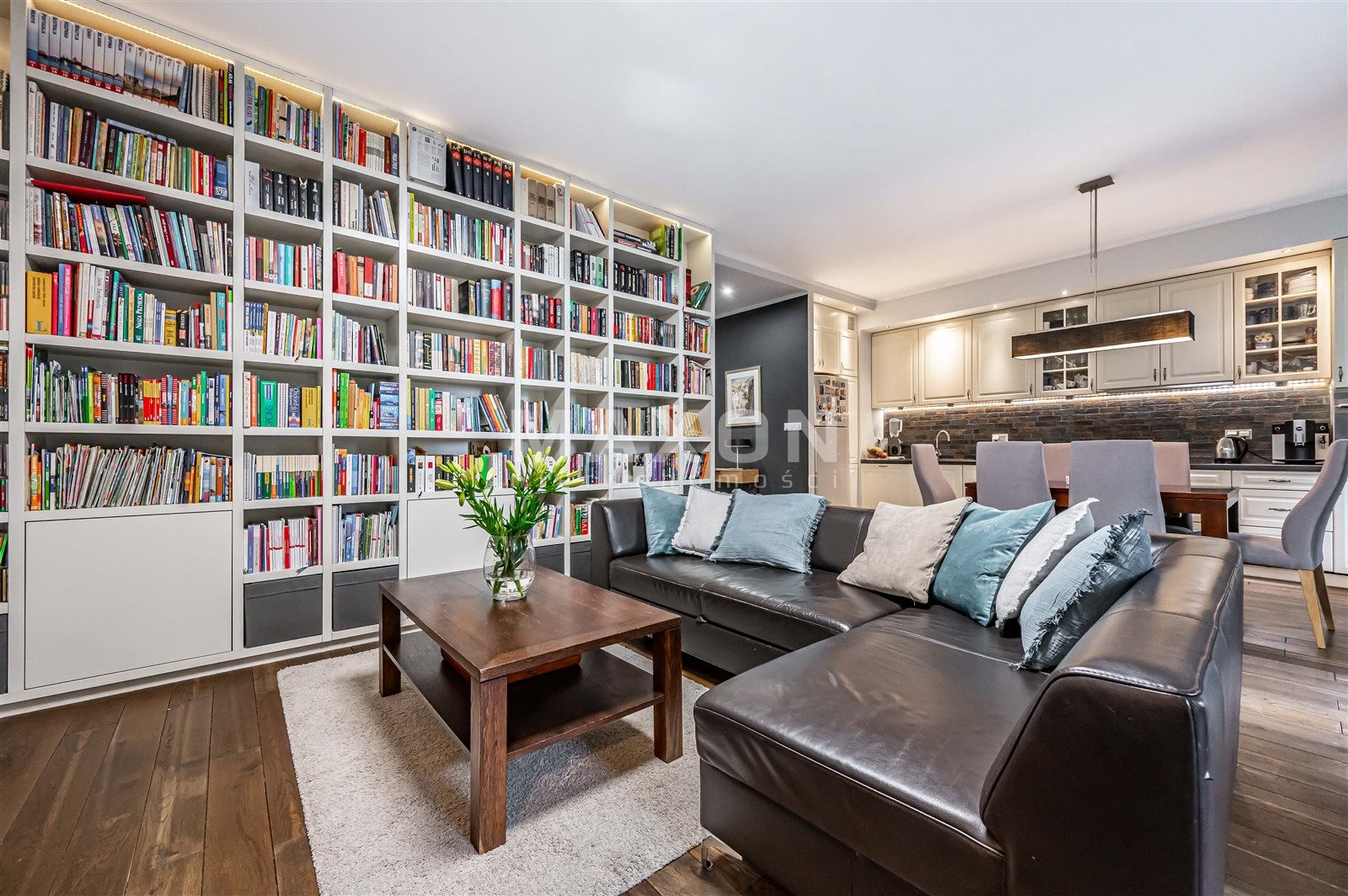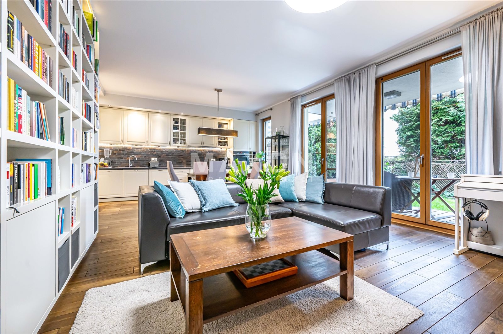 • salon (z biblioteką w stałej zabudowie) otwartą kuchnią i wyjściem na taras