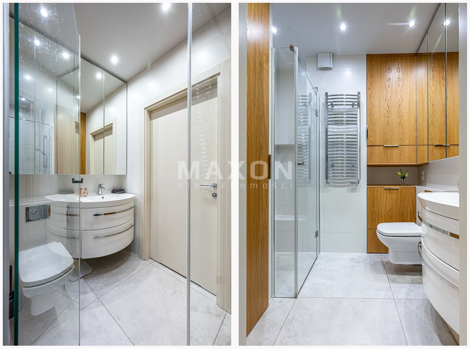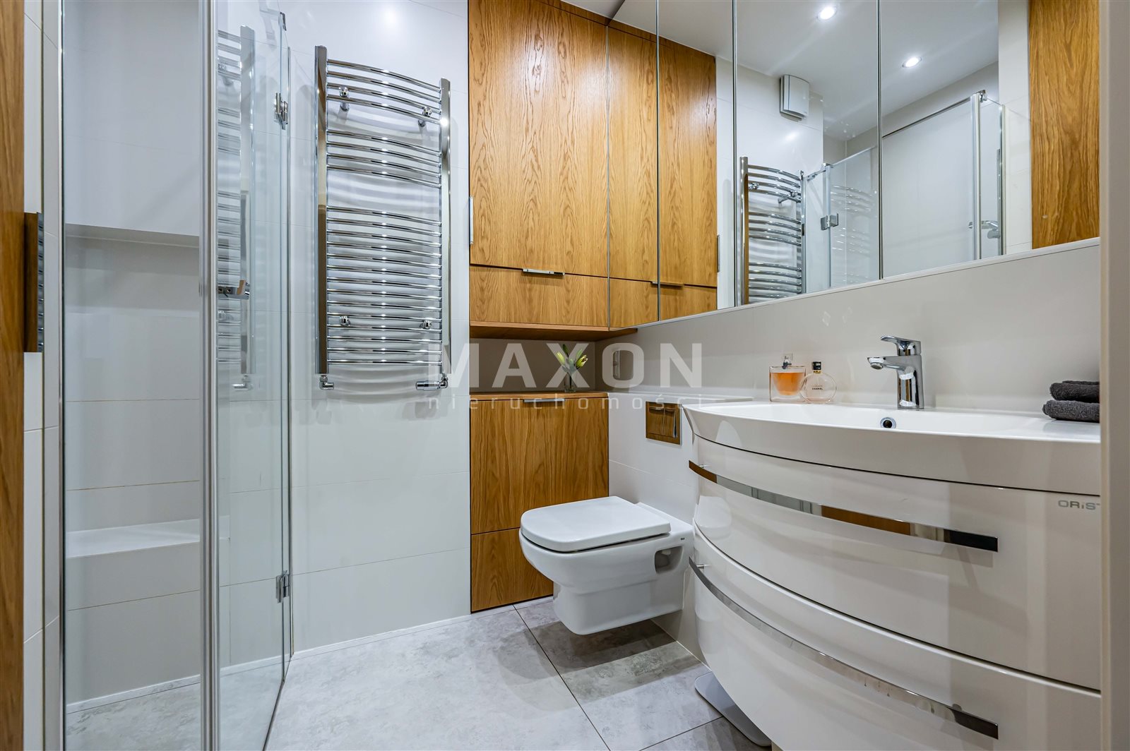 • łazienka z prysznicem i meblami robionymi na wymiar