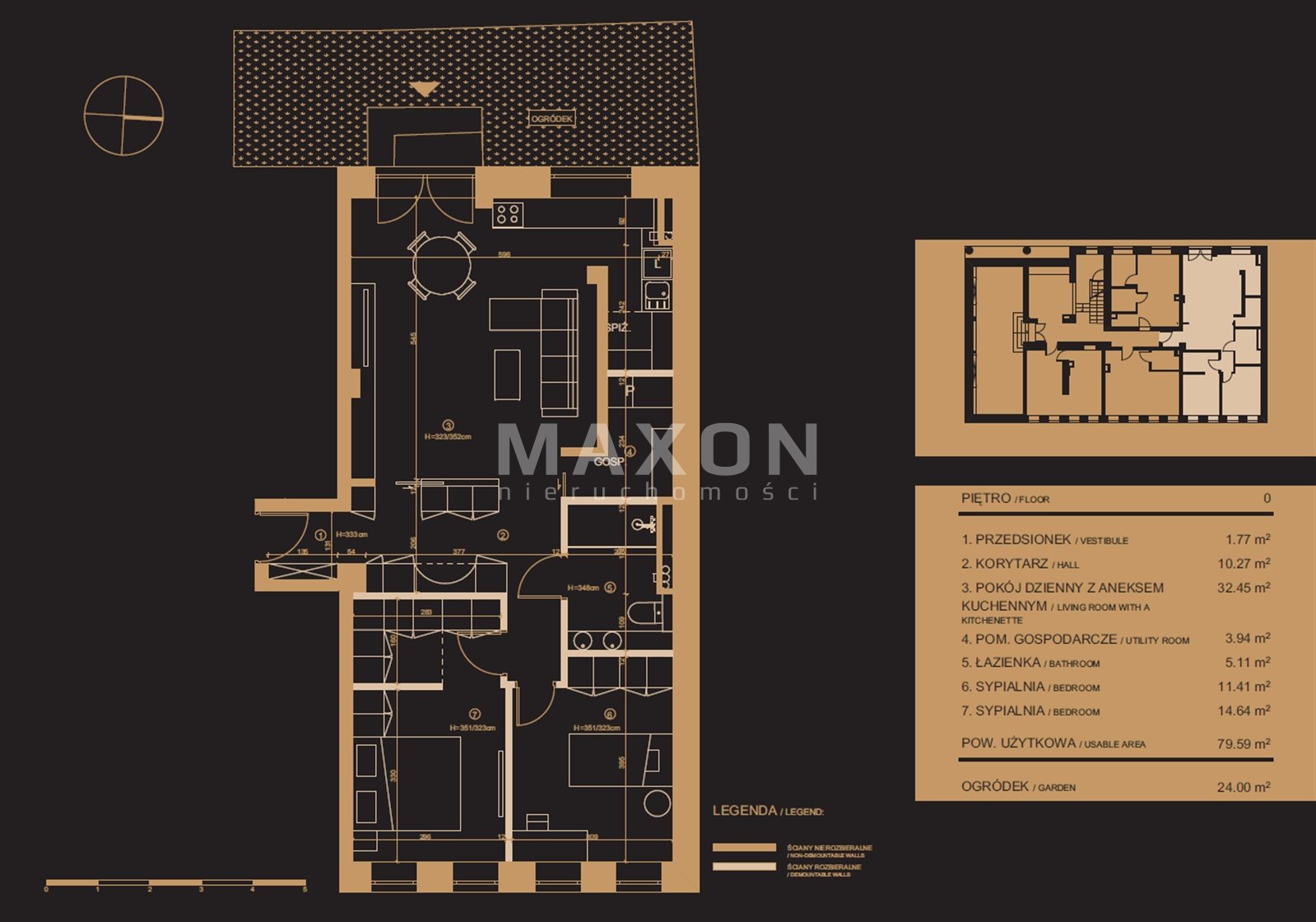 - Pokój dzienny z aneksem kuchennym (32 mkw.) i wyjściem do ogródka (24 mkw.)
