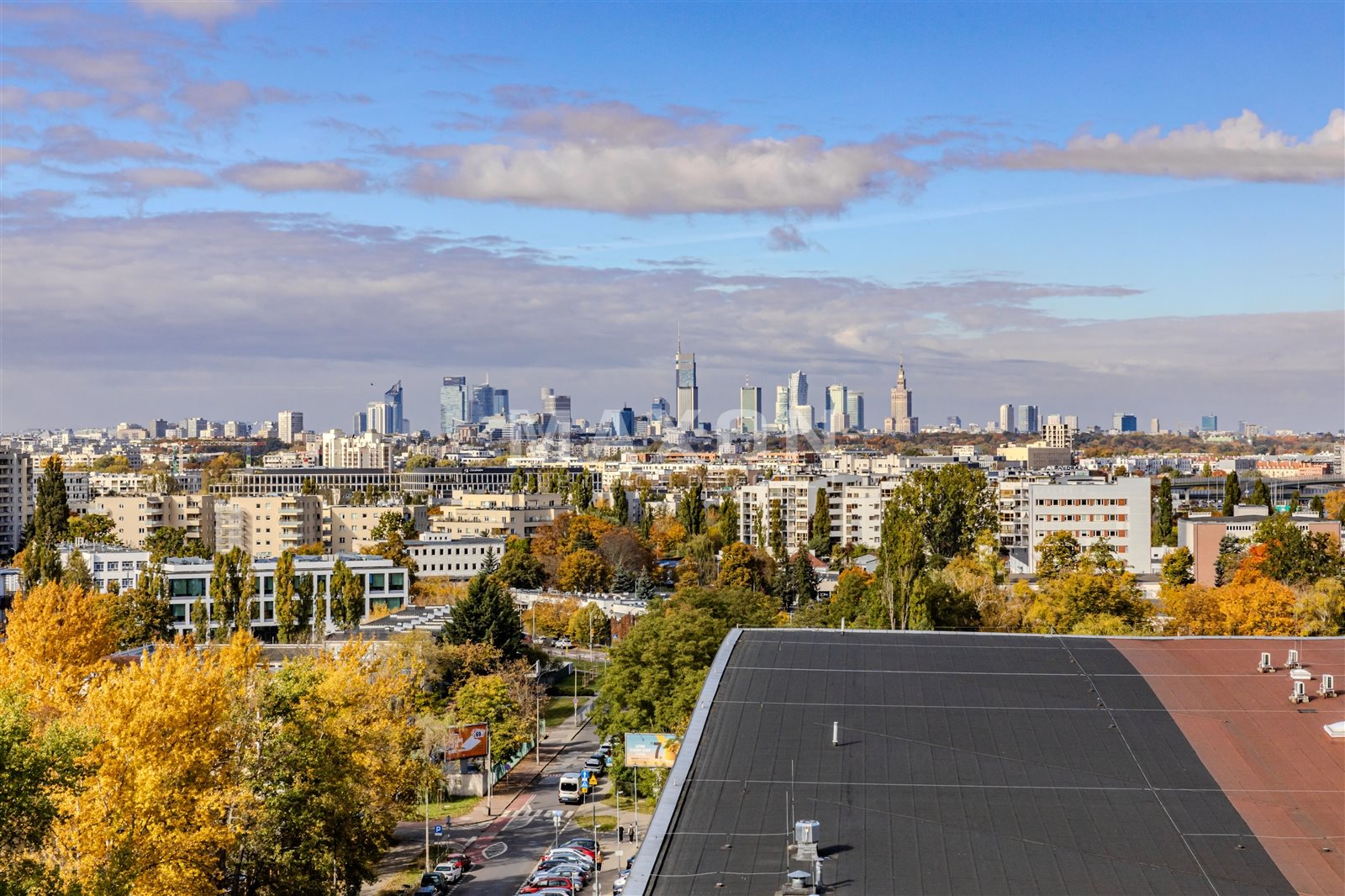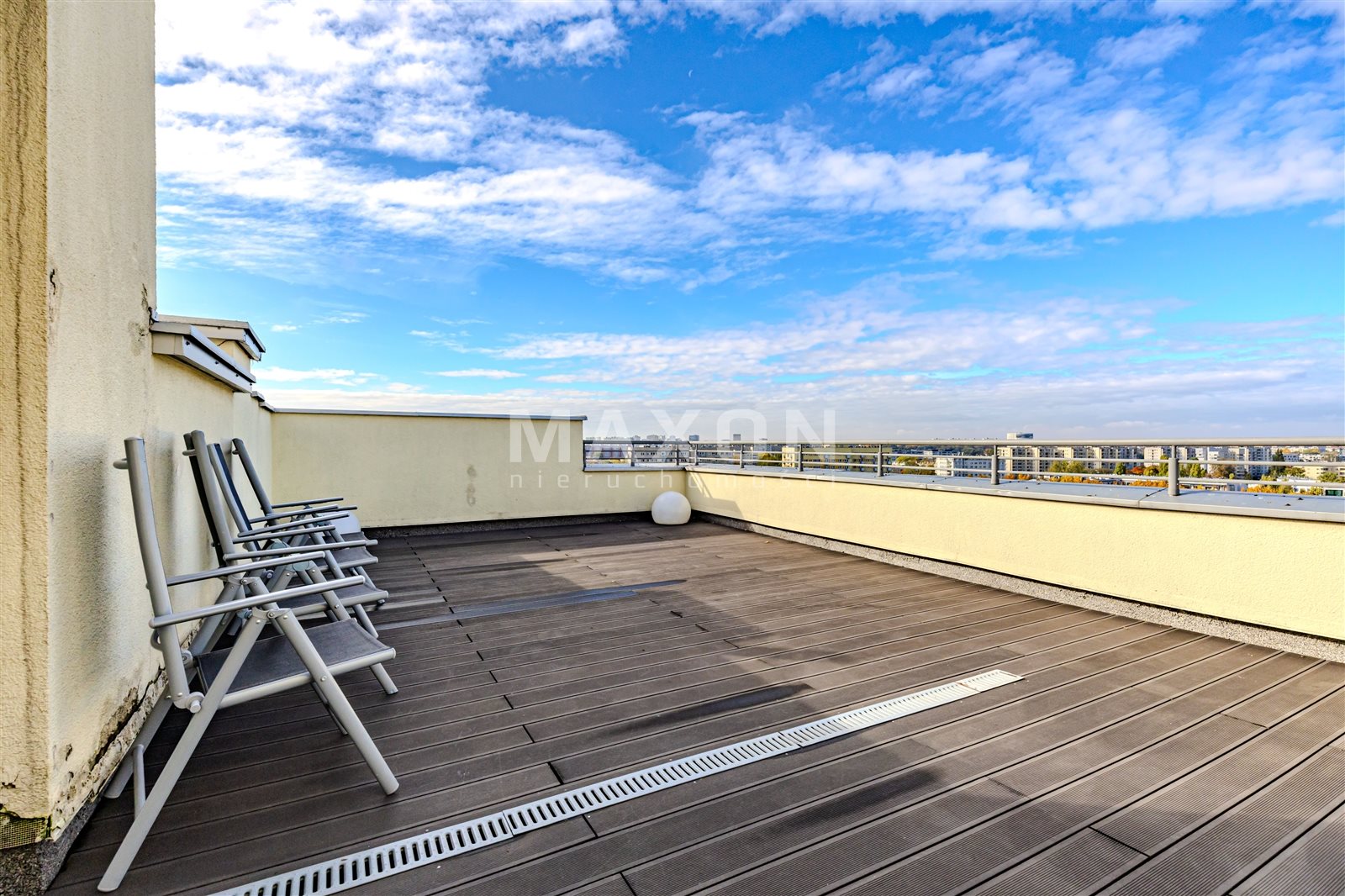 Spektakularna przestrzeń okalająca mieszkanie z trzech stron świata (południe–północ–zachód). Możliwość stworzenia prywatnego ogrodu, strefy relaksu lub letniej jadalni z widokiem na panoramę Warszawy i Wilanowa.
