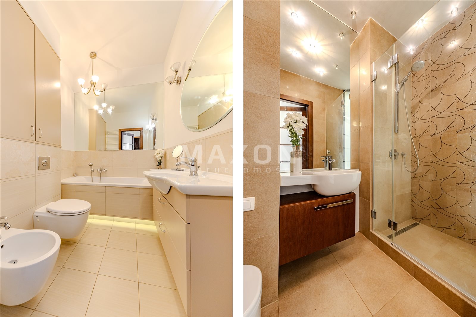 Z wanną i miejscem na przechowywanie. Elegancko wykończona w neutralnych kolorach.
