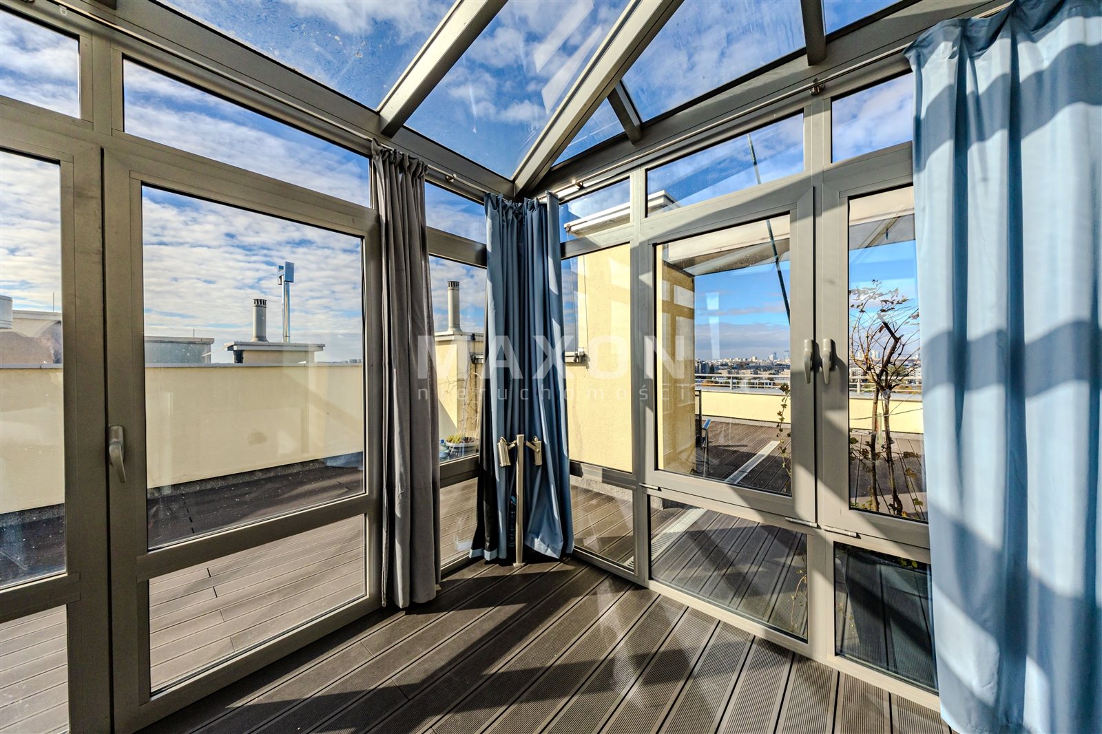 Prawdziwym atutem tego apartamentu jest ogromny taras o powierzchni 117 mkw, otaczający mieszkanie z trzech stron świata (południe–północ–zachód). To idealne miejsce na ogród w chmurach, strefę relaksu lub przestrzeń spotkań z przyjaciółmi.