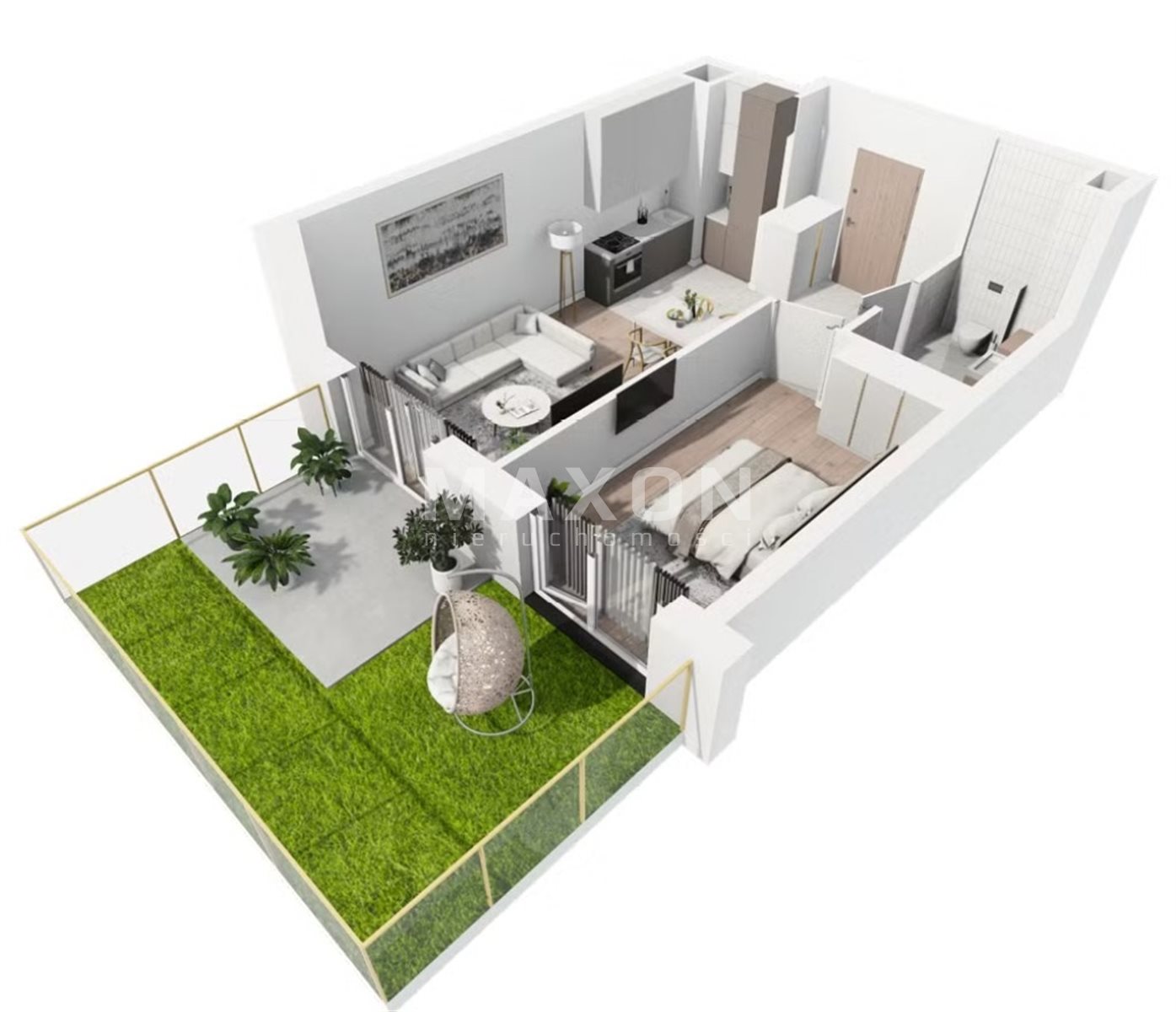 - Salon z aneksem kuchennym 21,34 mkw. z wyjściem na loggię 5,4 mkw. oraz do ogródka 23 mkw.